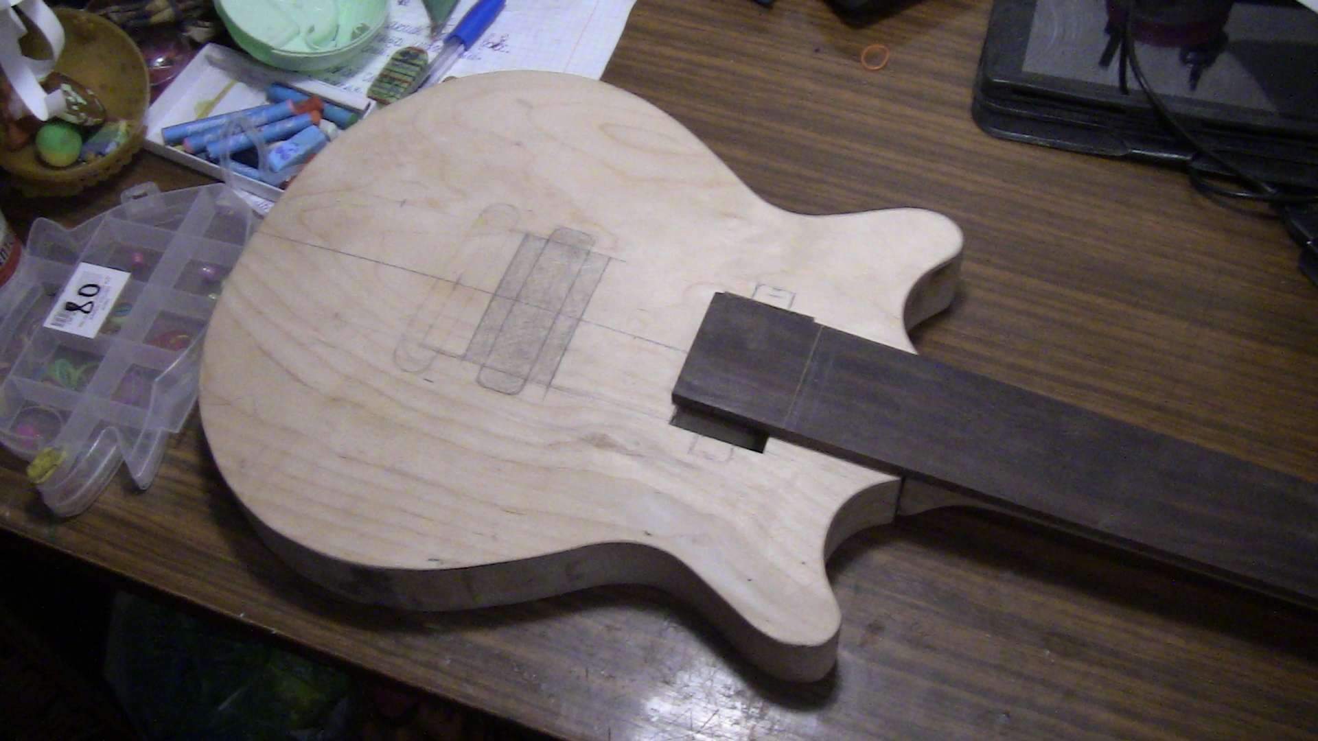 ), то играет пока на одной струне. Правда, схватывает на лету. Smoke on the water, Iron man, Hole Lotta Rosie, Кузнечик... Поглядел я на это безобразие и порешил сделать дочке гитару чуть короче обычной (мензура 600 мм, почти ЛП), чуть меньше и однозначно легче. Дитё у меня совсем не баскетбольного роста и корпус решено было сделать совсем небольшим. Т.к. гитара учебная, то особо заморачиваться с материалом корпуса я не стал - береза, но ребенок должен слышать не доску, а ЗВУК, посему гитара по-любому должна быть полуаккустикой, но с перспективой на электрику. За основу была принята "Гречка", как у Малькольма, она симметричная, т.ч. можно просто переставляя струны получить как леворукую, так и праворукую гитару. С грифом я шутить не привык, поэтому это полноценный клен, с двухсторонним анкером и бакаутовой накладкой в 23 лада (23-й чисто потому, что осталось место).