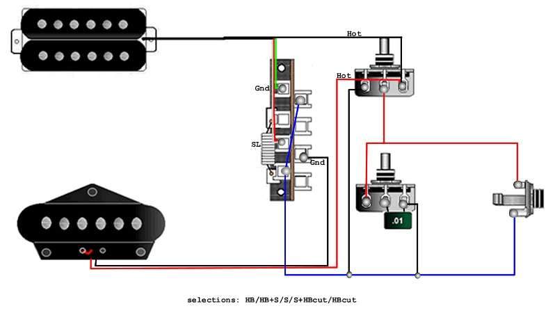Хочу: 1-бридж, 2-бридж+мидл, 3-мидл, 4-мидл+нек, 5-нек, возможность в любом режиме превратить хамб в сингл, на нековый например есть пушпул, на остальное могу запилить тумблеры, как нарисуете то и поставлю, не принципиально, простейшую схему классическую знаю, с отсечками плаваю, может есть альтруист который нарисует как что куда?)