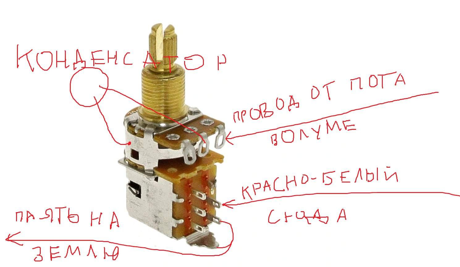зеленый + без оплетки - это земля. его паяешь на корпус пота. белый + красный - эти нужно паять на пушпул, когда его включаешь они должны коротиться на землю.
