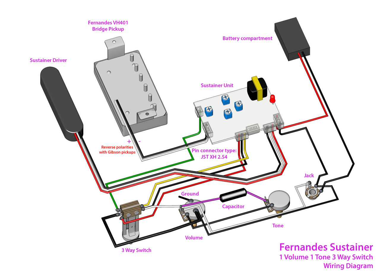 На схеме потенциометр уровня сустейна подключается к среднему разъёму, и там нет никакого переключателя.