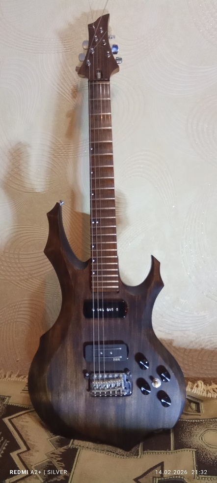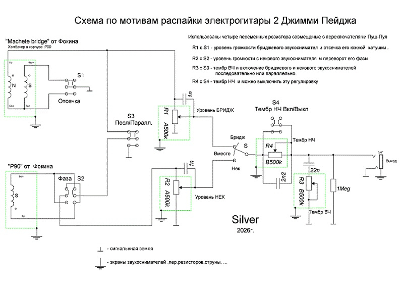 Здравствуйте Уважаемые Форумчане .Хотел поделиться схемой распайки звукоснимателей к которой я пришёл, и она мне очень зашла.Может кому то пригодится.Из особенностей схемы ,это разделение цепей экранов и сигнальной земли,что улучшает защиту от наводок и не создает земляных петель. Отсечка хамбакера делается не закорачиванием одной из катушек хамбакера ,что я считаю в корне неправильным,а её разрывом .Это при наличии общего для двух катушек магнитопровода ведёт к увеличению выхлопа.Схема уже распаяна на моей гитаре ,все работает.Единственный минус ,когда оба датчика включены последовательно и оба датчика подключены на выход ,в некоторых положениях регуляторов громкости НЕК и Бридж получается очень странное звучание ,но может кому то и зайдет. Схема отличается от схемы Джимми потому ,что у него независимая регулировка уровней Нека и Бриджа,а тут зависимая. Пока все Пуш-Пулы утоплены - схема работает как обычный Les Paul.Пуш- Пулами можно сделать отсечку катушки хамбакера бриджа,переворот фазы P90 в неке ,включить хамбакер и P90 между собой последовательно или параллельно или всё это разных вариациях.Можно также включить или выключить регулятор тембра НЧ ,как в Ягуарах.Гитара у меня самопальная ,дека -тополь ,гриф -береза ,накладка -дуб.Немного ещё бука,красного дерева и ольхи.Родная, с привычной древесины.
