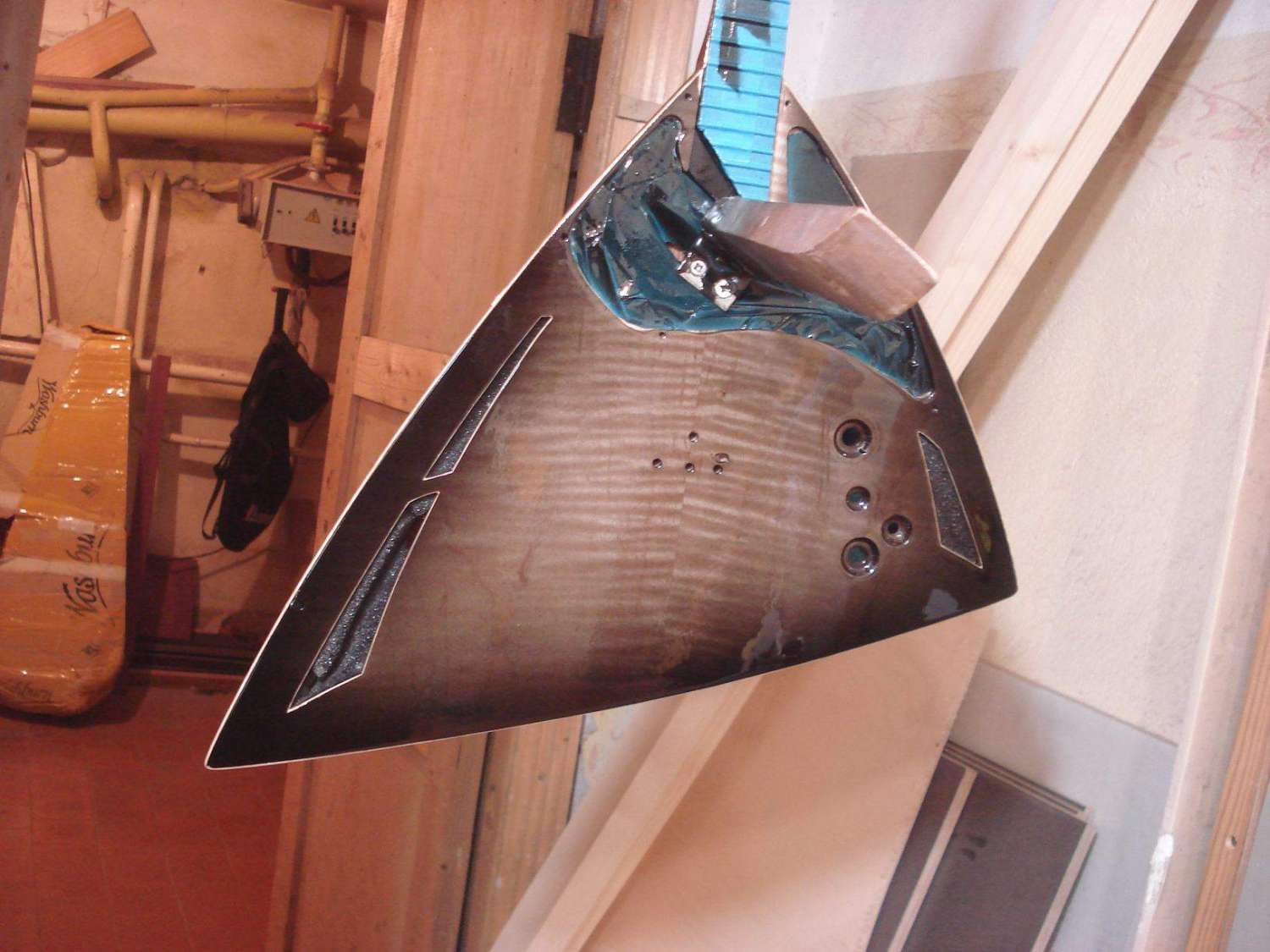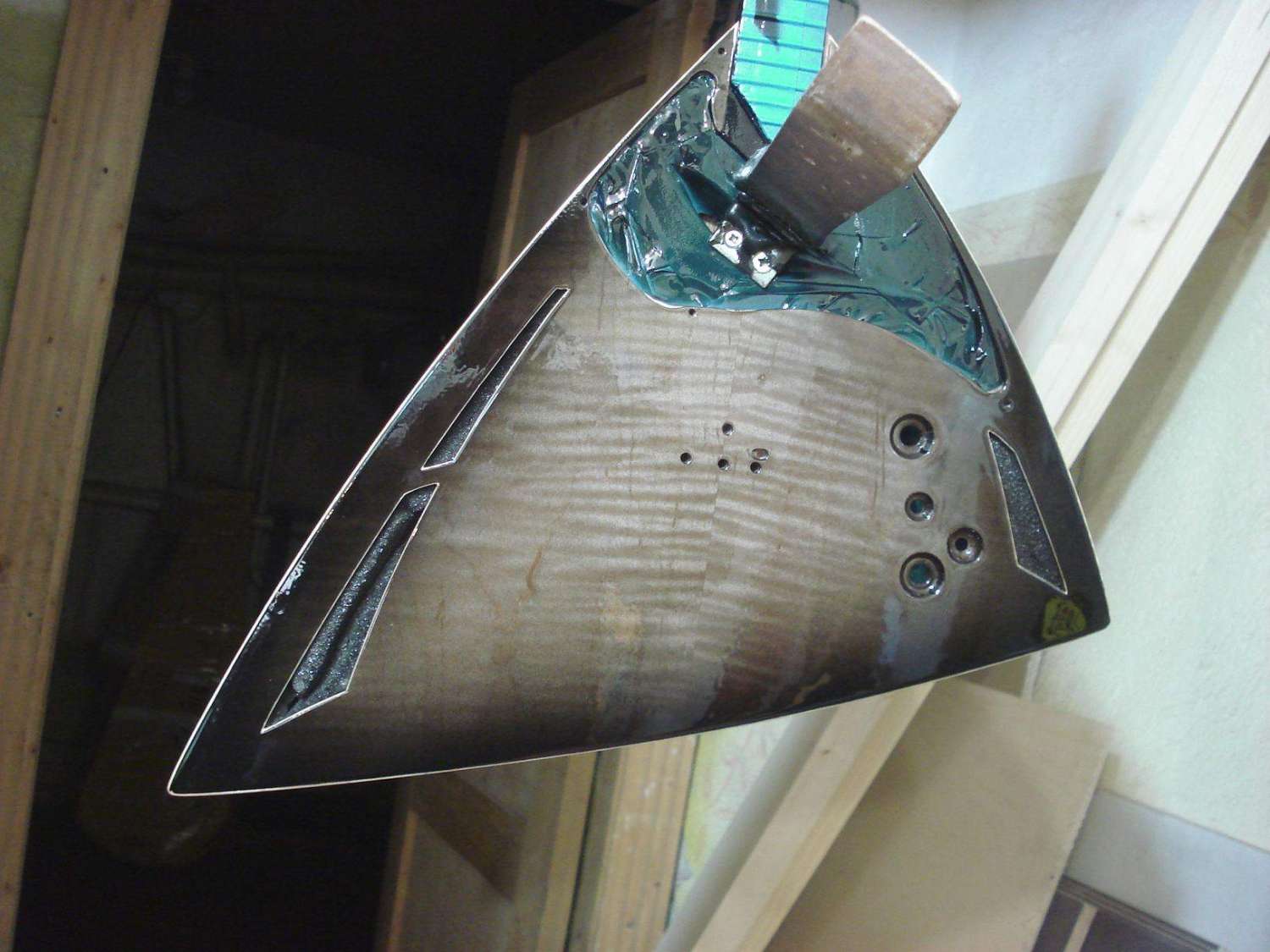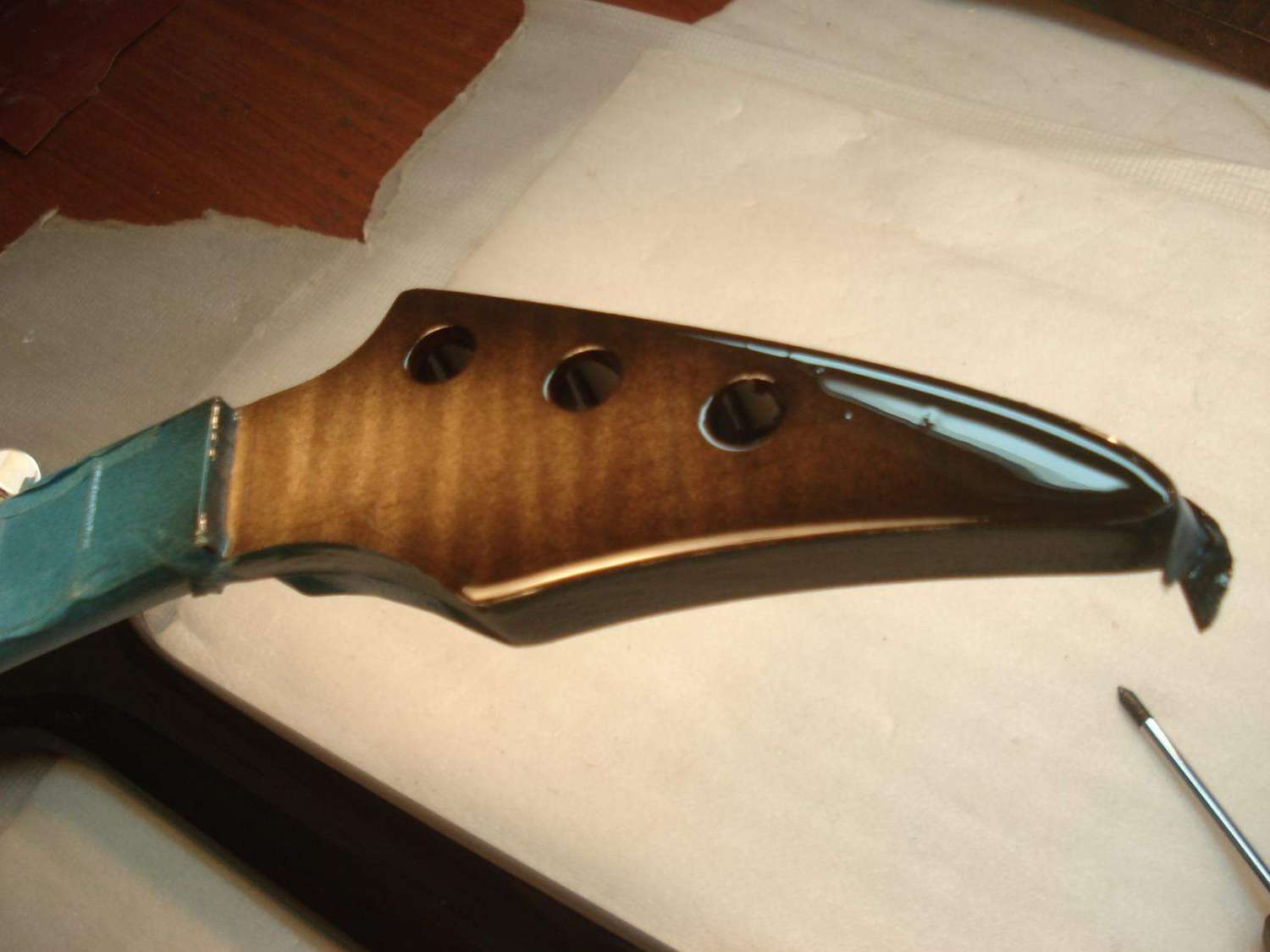 Предварительно подогнав накладку в размер с небольшим припуском на обработку, устанавливаем её на гриф в таком положении, в котором она будет приклеиваться.