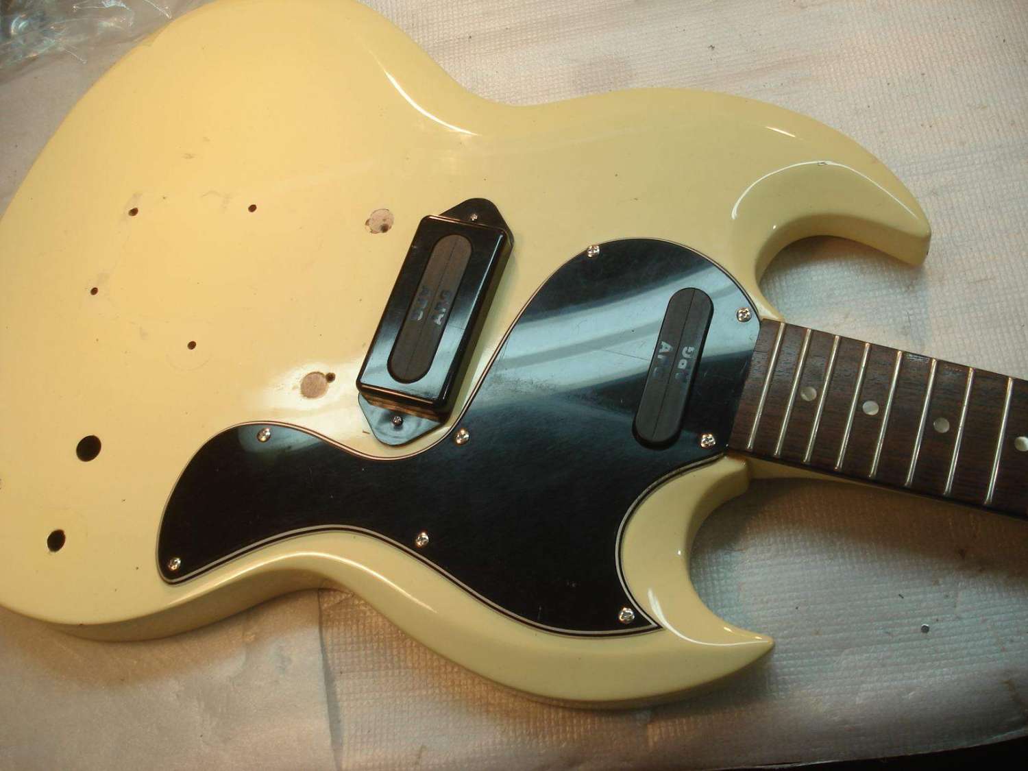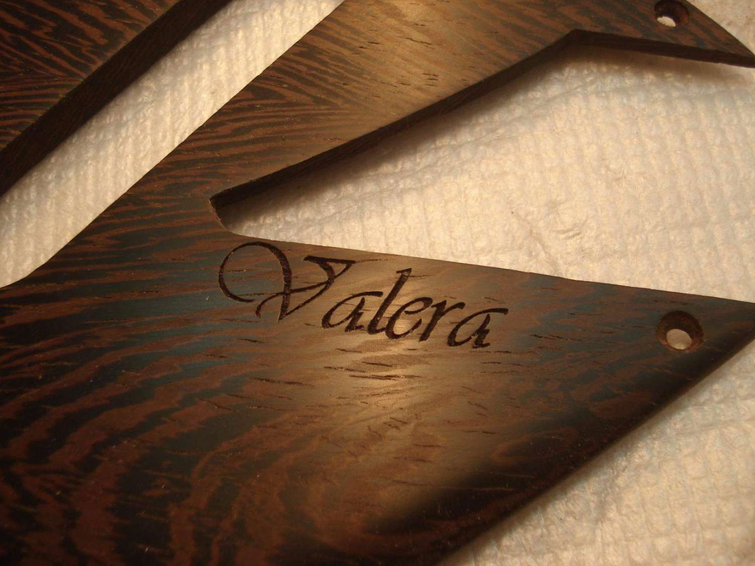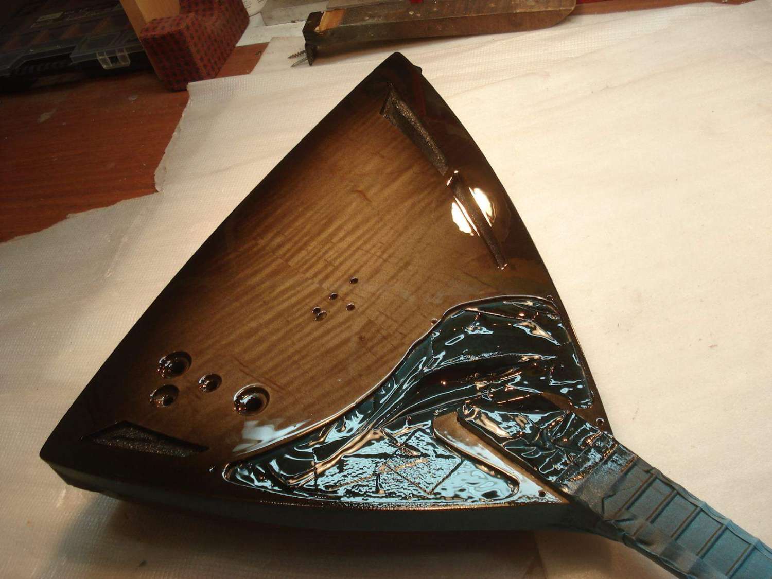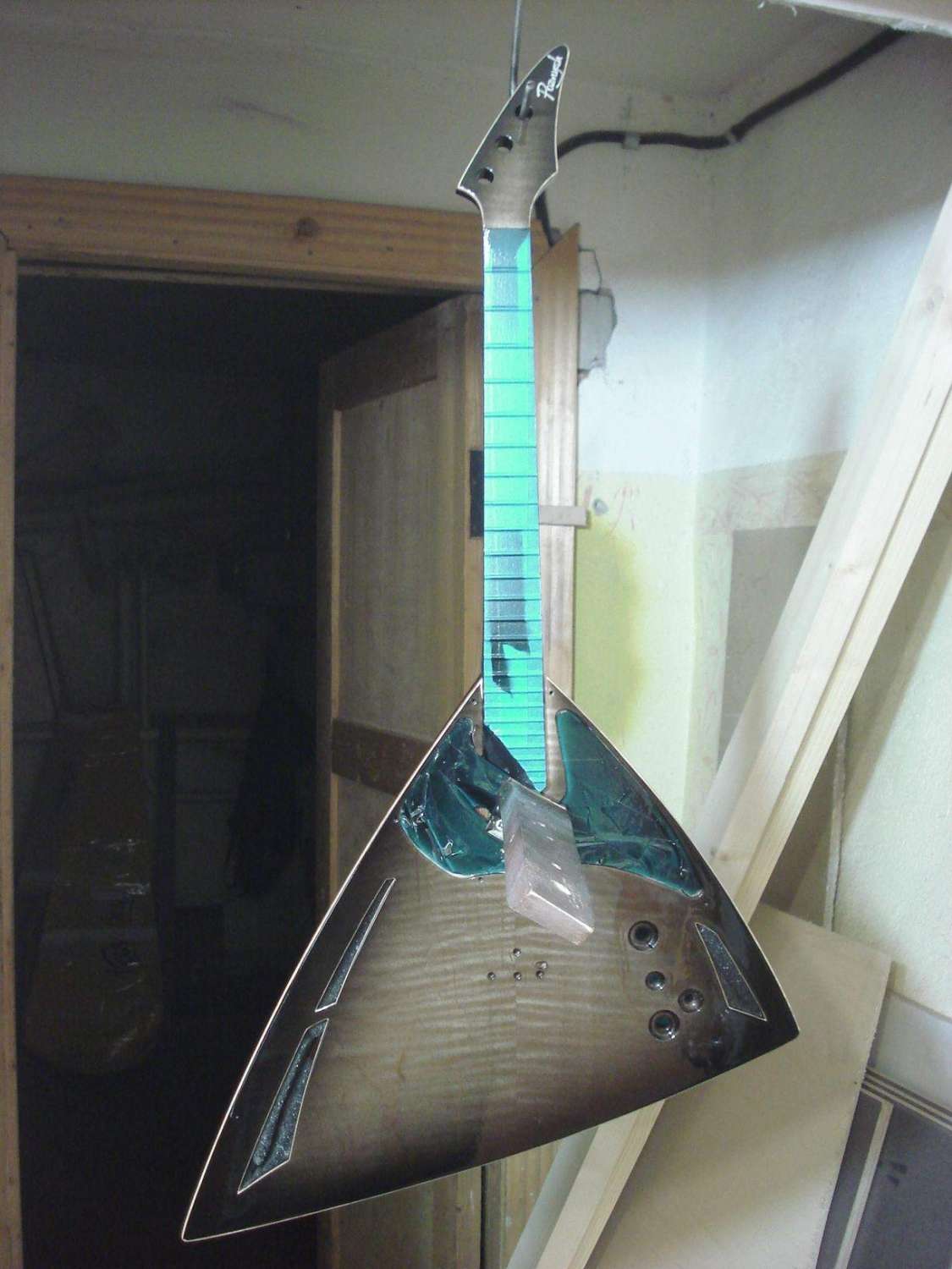 Предварительно подогнав накладку в размер с небольшим припуском на обработку, устанавливаем её на гриф в таком положении, в котором она будет приклеиваться.