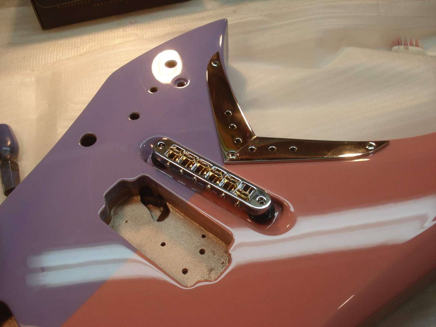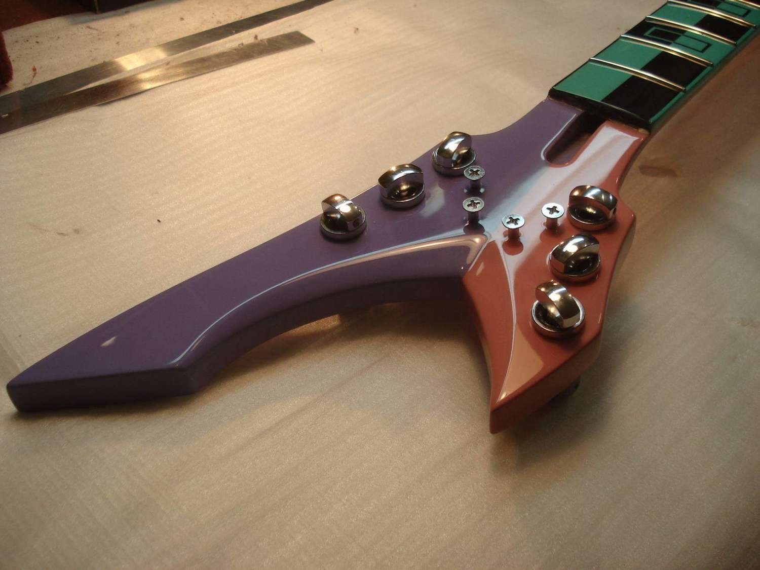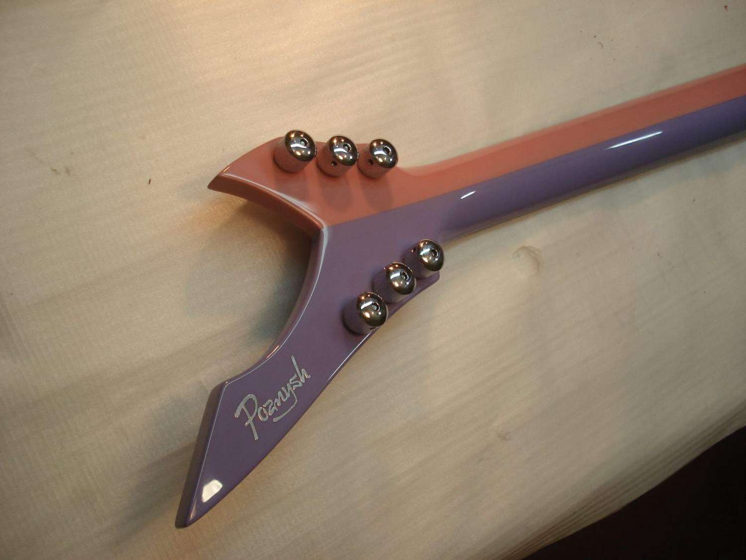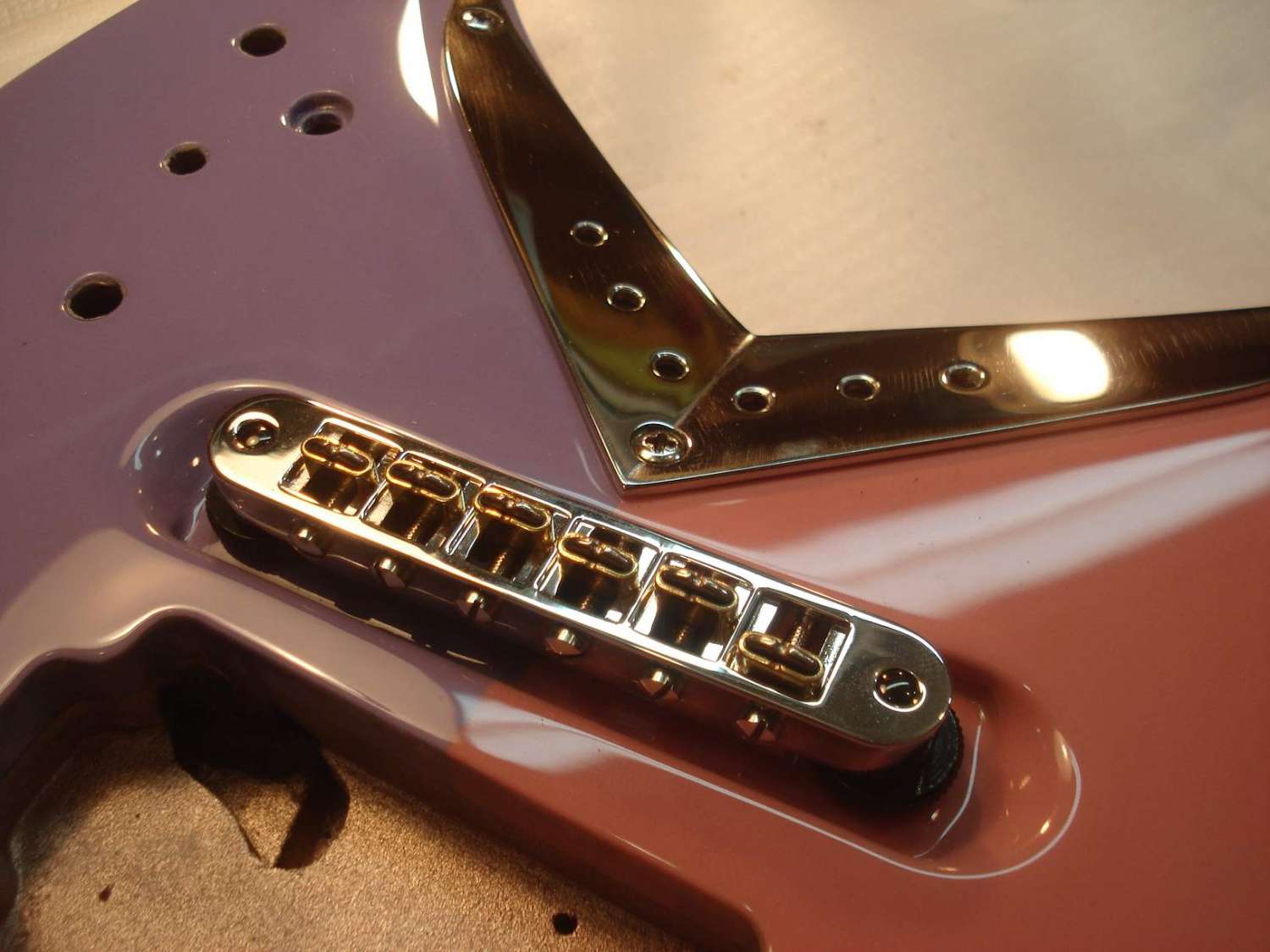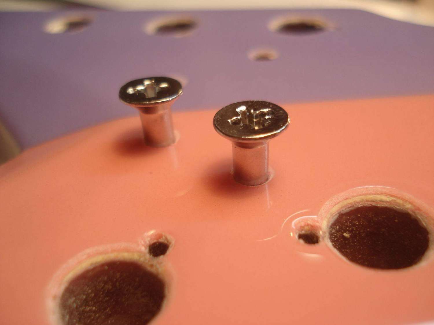 Долго думал по поводу ритейнеров. Как-то не очень получалось. Сначала хотел заказать втулки, как на чертеже заказчика, но потом отмёл эту идею по техническим соображениям. Сама втулка маленького диаметра получалась. Если крепить шурупом, то только длинным и тонким. А тут нагрузка боковая. Велика вероятность загиба всей этой конструкции и, соответственно, продавливание лака. Но всё гениальное просто!)) На глаза попались крепёжные шурупы от готовского бриджа. Ну прям как по заказу -- то что надо! Размер, конфигурация, покрытие, а главное цельная конструкция с резьбой. Получилось, на мой взгляд, замечательно)