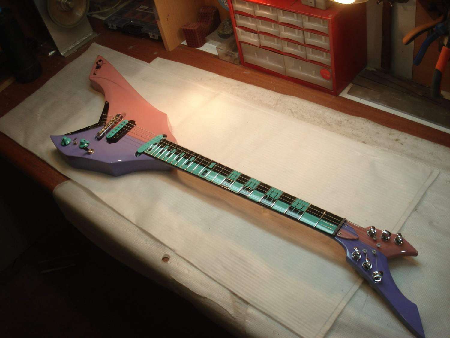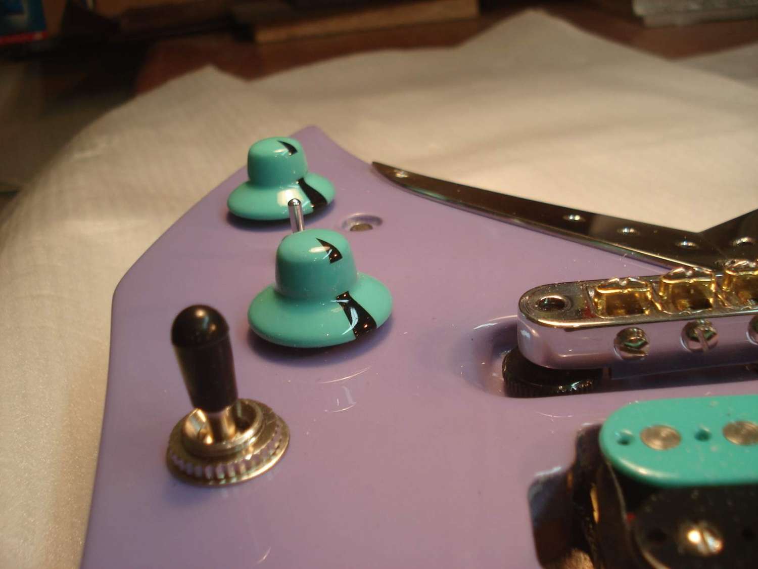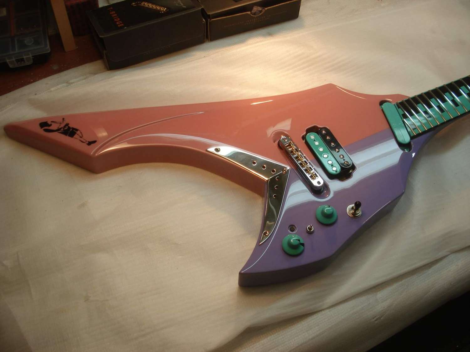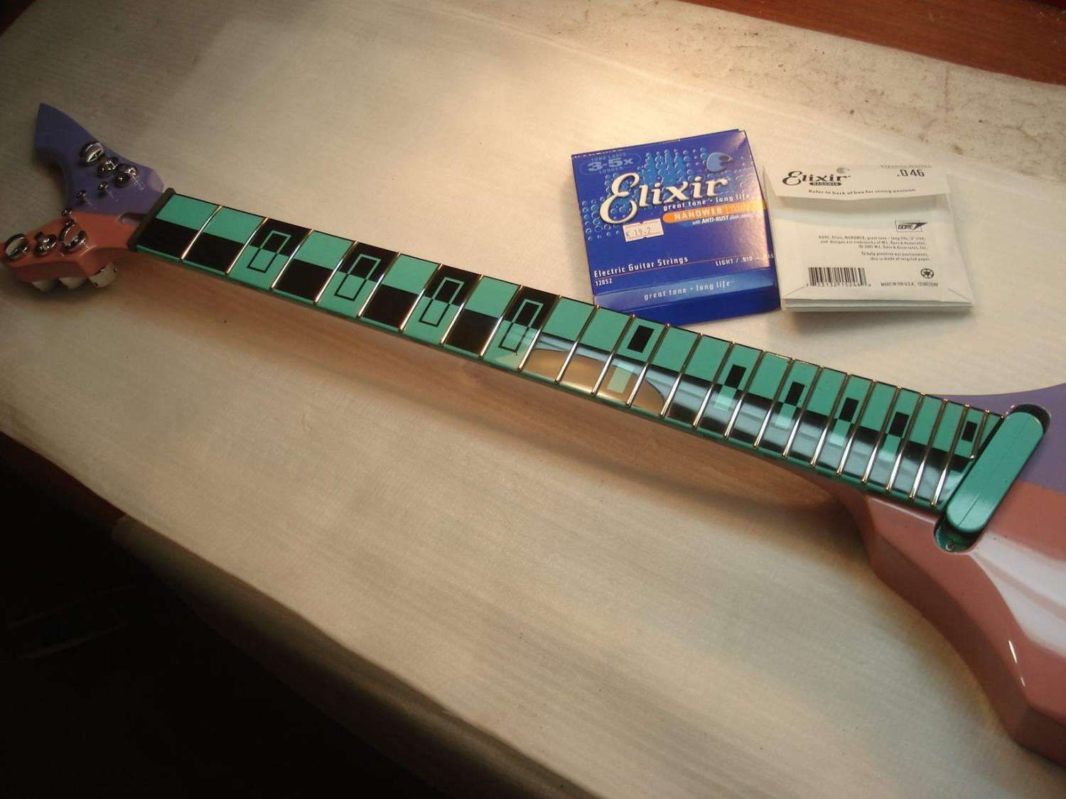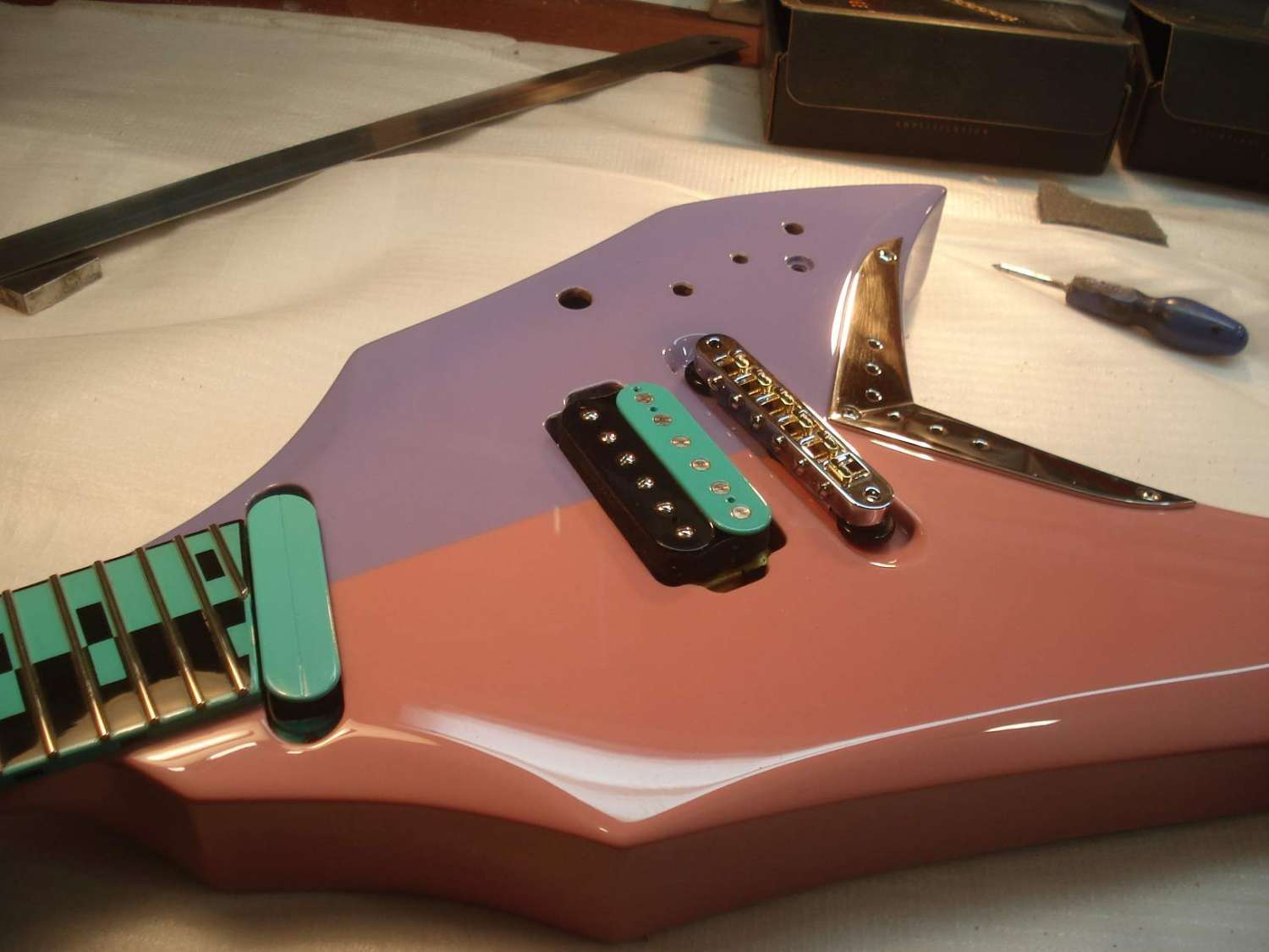Долго думал по поводу ритейнеров. Как-то не очень получалось. Сначала хотел заказать втулки, как на чертеже заказчика, но потом отмёл эту идею по техническим соображениям. Сама втулка маленького диаметра получалась. Если крепить шурупом, то только длинным и тонким. А тут нагрузка боковая. Велика вероятность загиба всей этой конструкции и, соответственно, продавливание лака. Но всё гениальное просто!)) На глаза попались крепёжные шурупы от готовского бриджа. Ну прям как по заказу -- то что надо! Размер, конфигурация, покрытие, а главное цельная конструкция с резьбой. Получилось, на мой взгляд, замечательно)