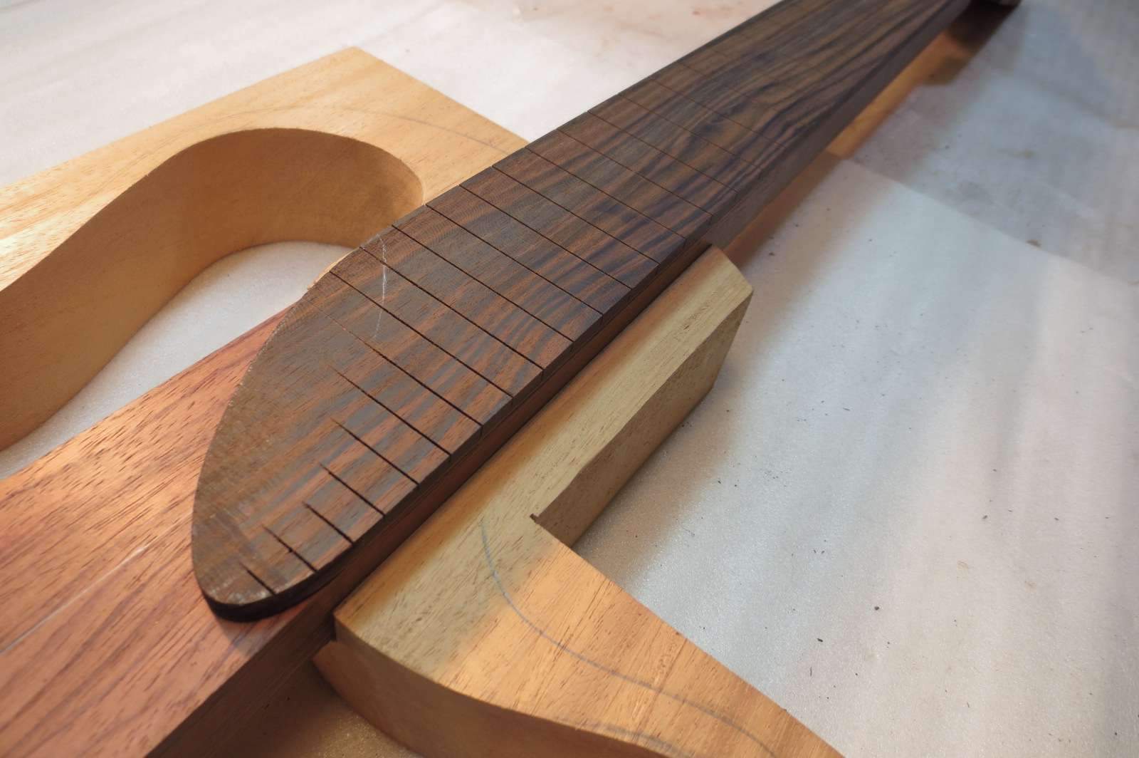 Поперечный радиус для струн на бридже предполагал создать за счет ступенчатого дна под седлами - разная глубина фрезеровки в дереве.