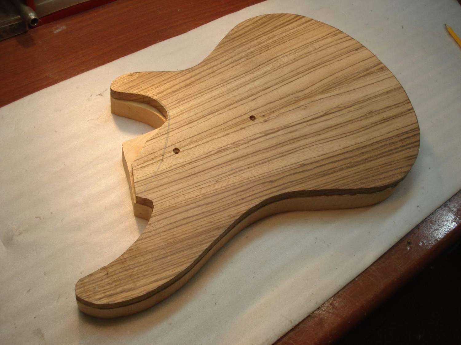GiGuitarist, разумеется. Более того -- это этот же кусок палисандра, только из другой части доски. Т.к. гитара под закраску, то и 100%-е совпадение цветовой гаммы текстуры не обязательное условие. К тому же ещё и накладка на перо из клёна будет клеиться.