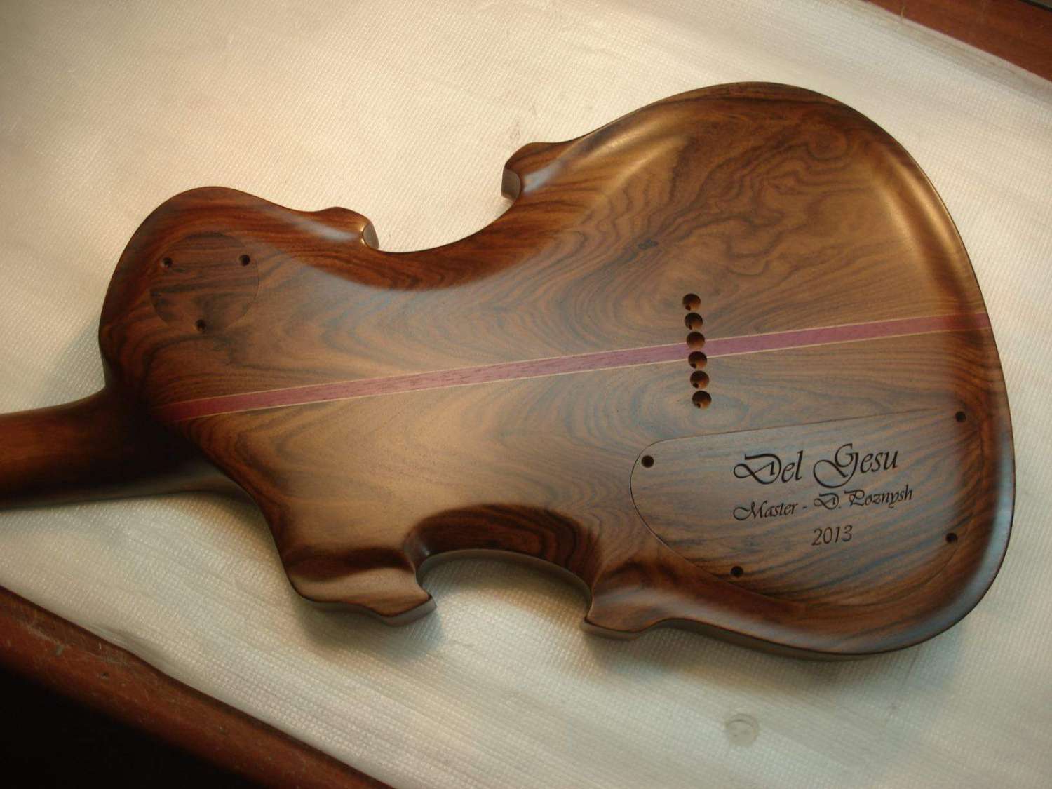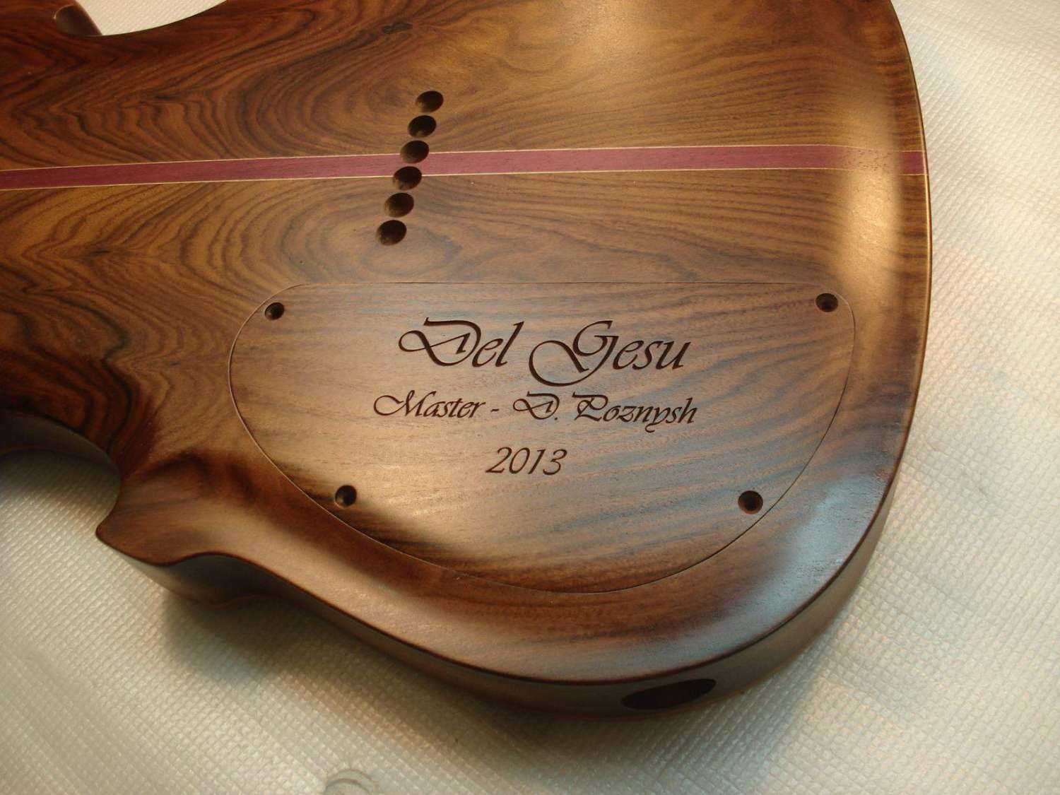 Them, поставить "убитую" фурнитуру можно. Но здесь всё очень сложно делалось. Изначально вообще практически другой инструмент был. Много изменений по ходу пьесы было: сначала просто из цельного куска махагони планировалось с хромированной фурнитурой, потом добавился топ, полость с эфкой, низ из палисандра профилированный, потом пьеза пошла в нагрузку и цвет золото. В последний момент старение добавилось. Так что невозможно было учесть все эти нюансы при заказе фурнитуры.