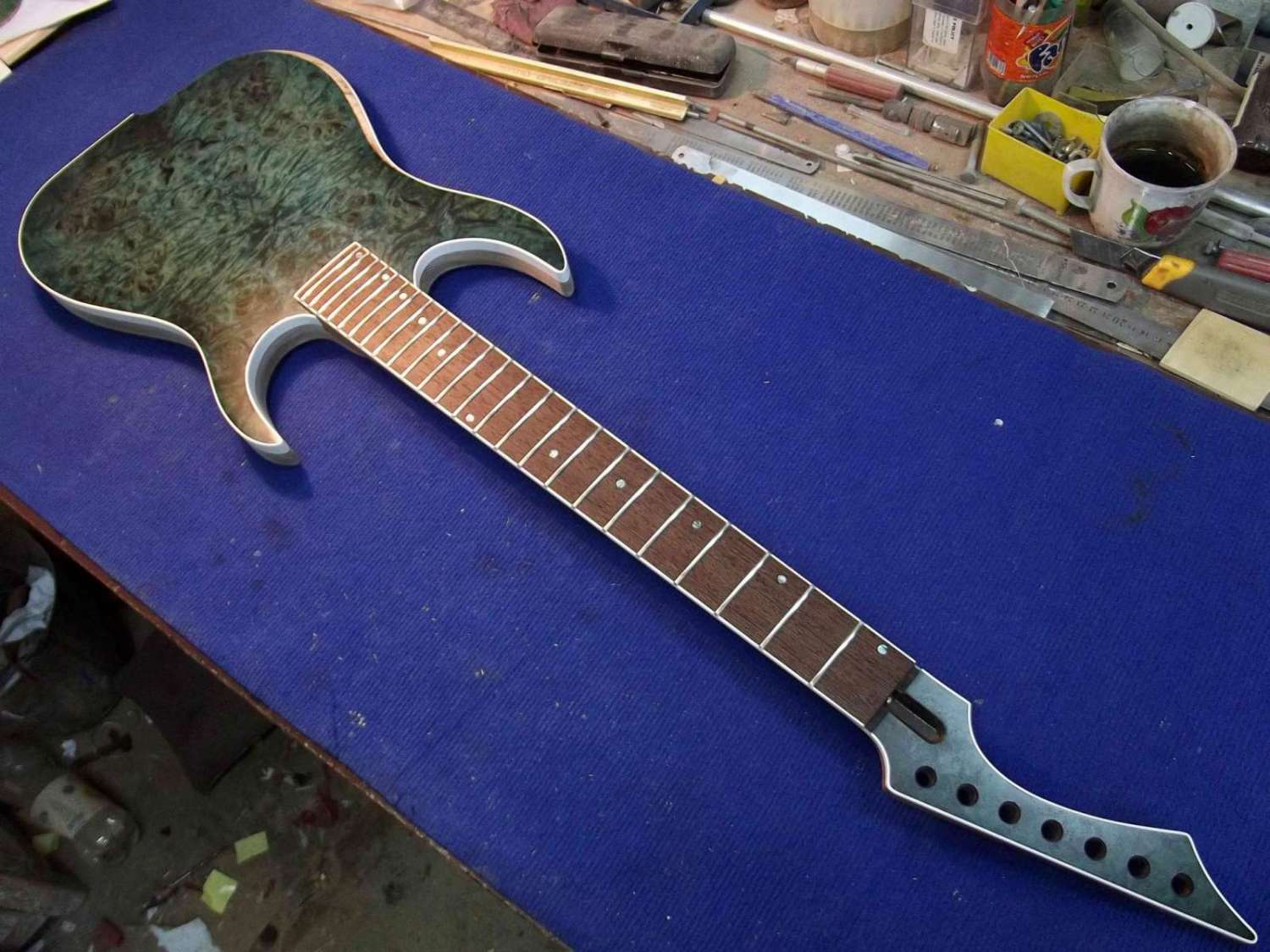 Вопрос: а почему сначала топ покрашен, а потом уже предполагается его резать под звукосниматели и бридж? Обычно вроде наоборот, нет? Или это способ дополнительно укрепить топ перед фрезеровкой?