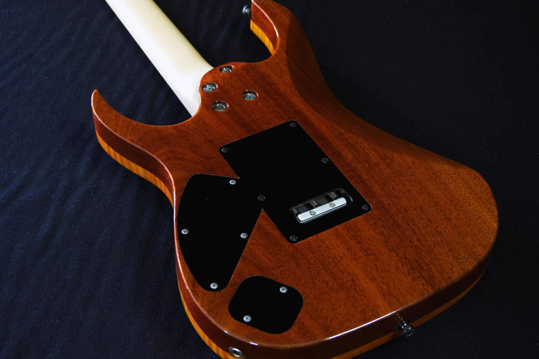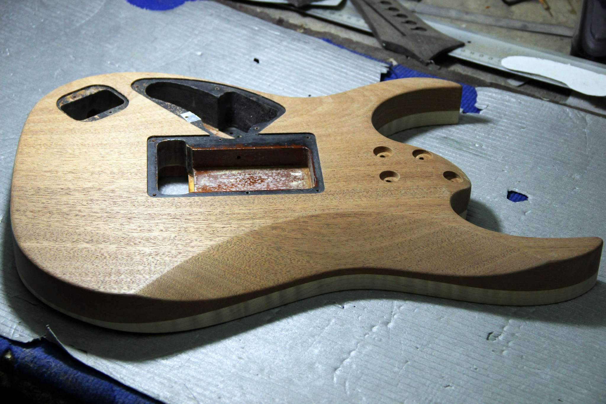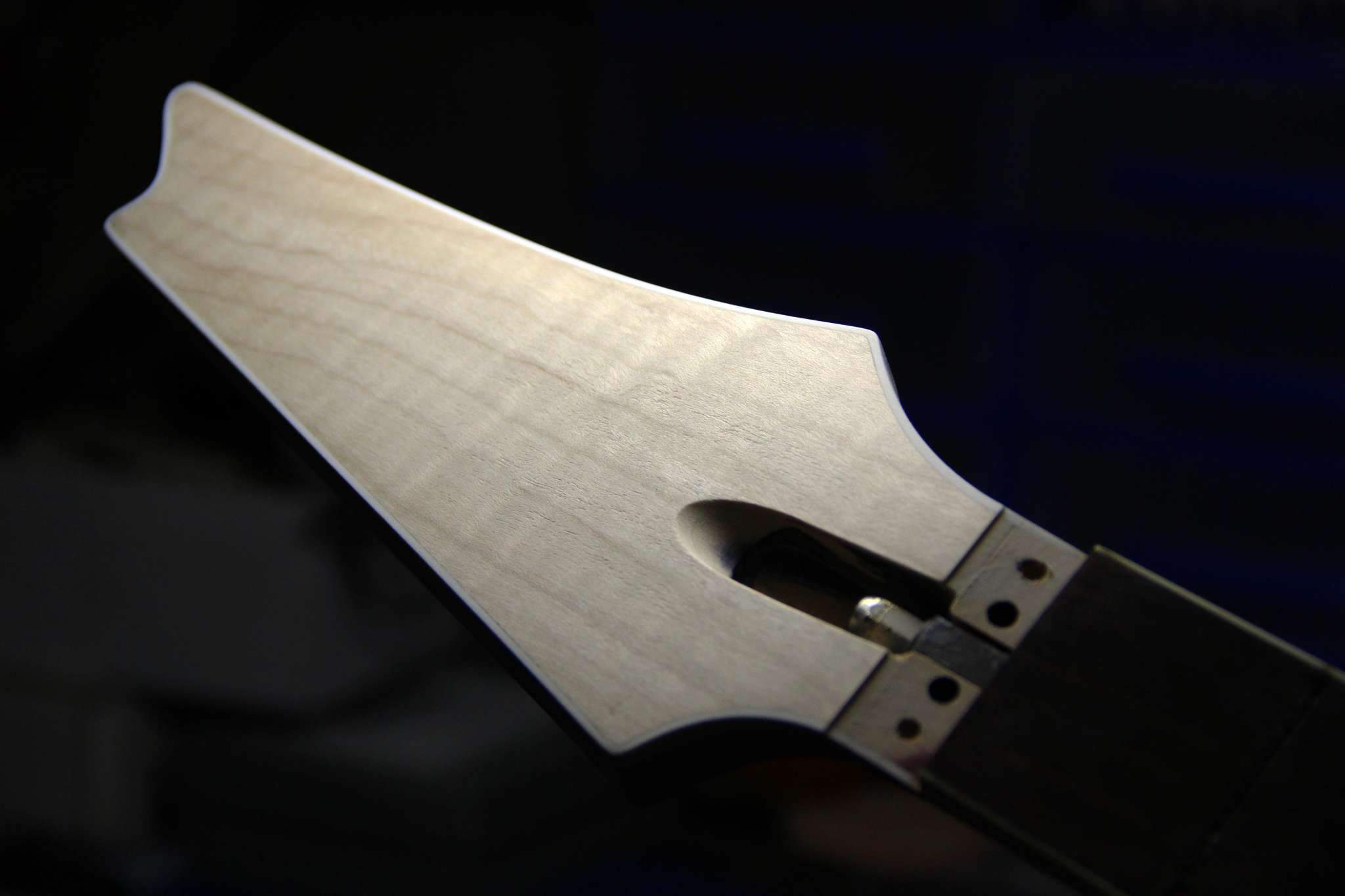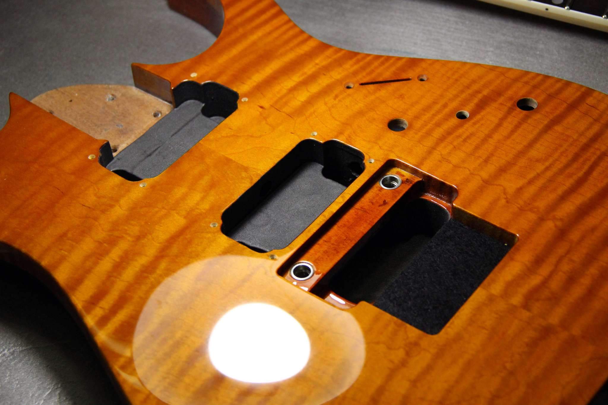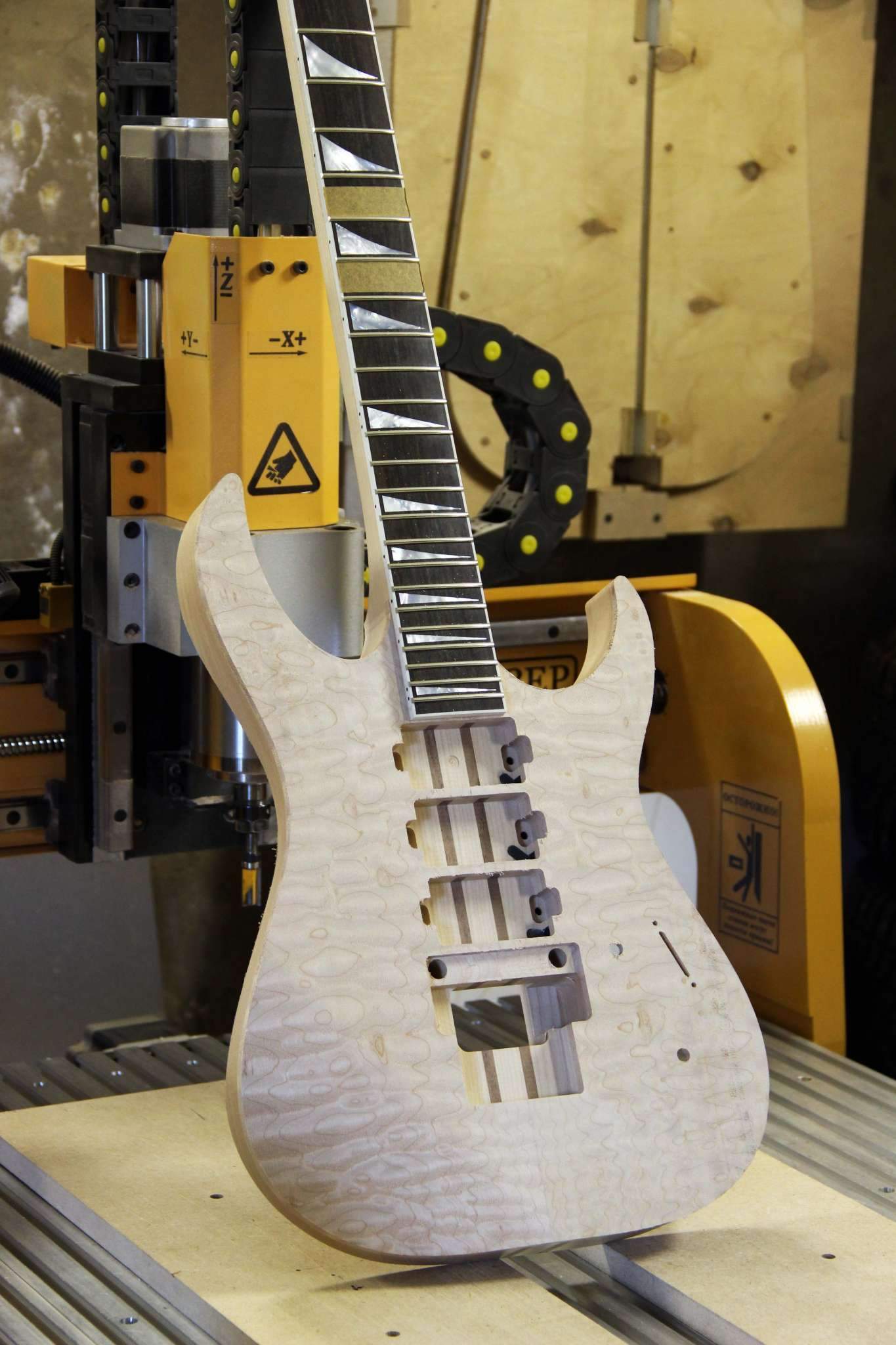 Следующий проект сквозной суперстрат, гриф клён\орех, дека ольха, топ стёганый клён, накладка эбен. Инкрустация из натурального перламутра.