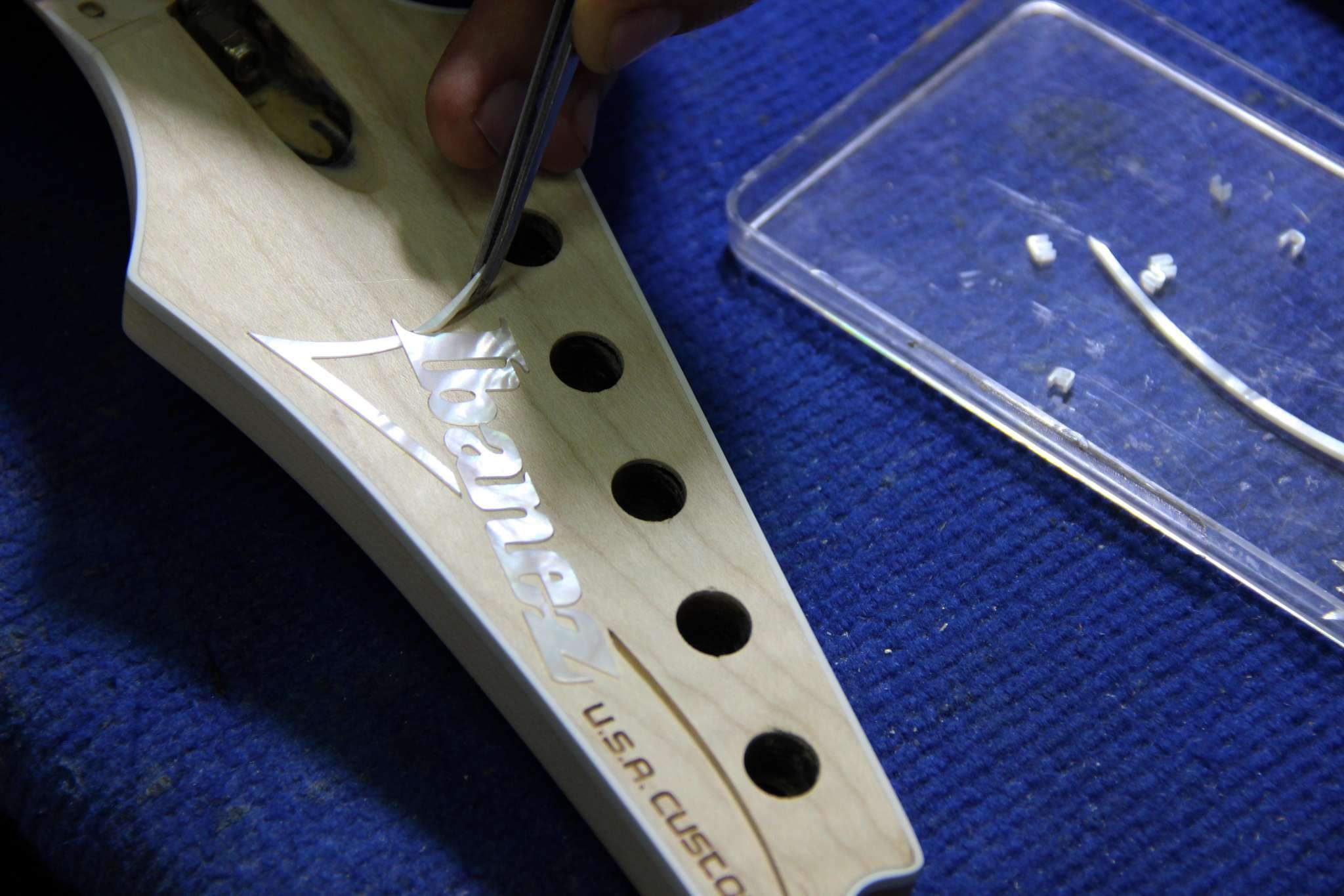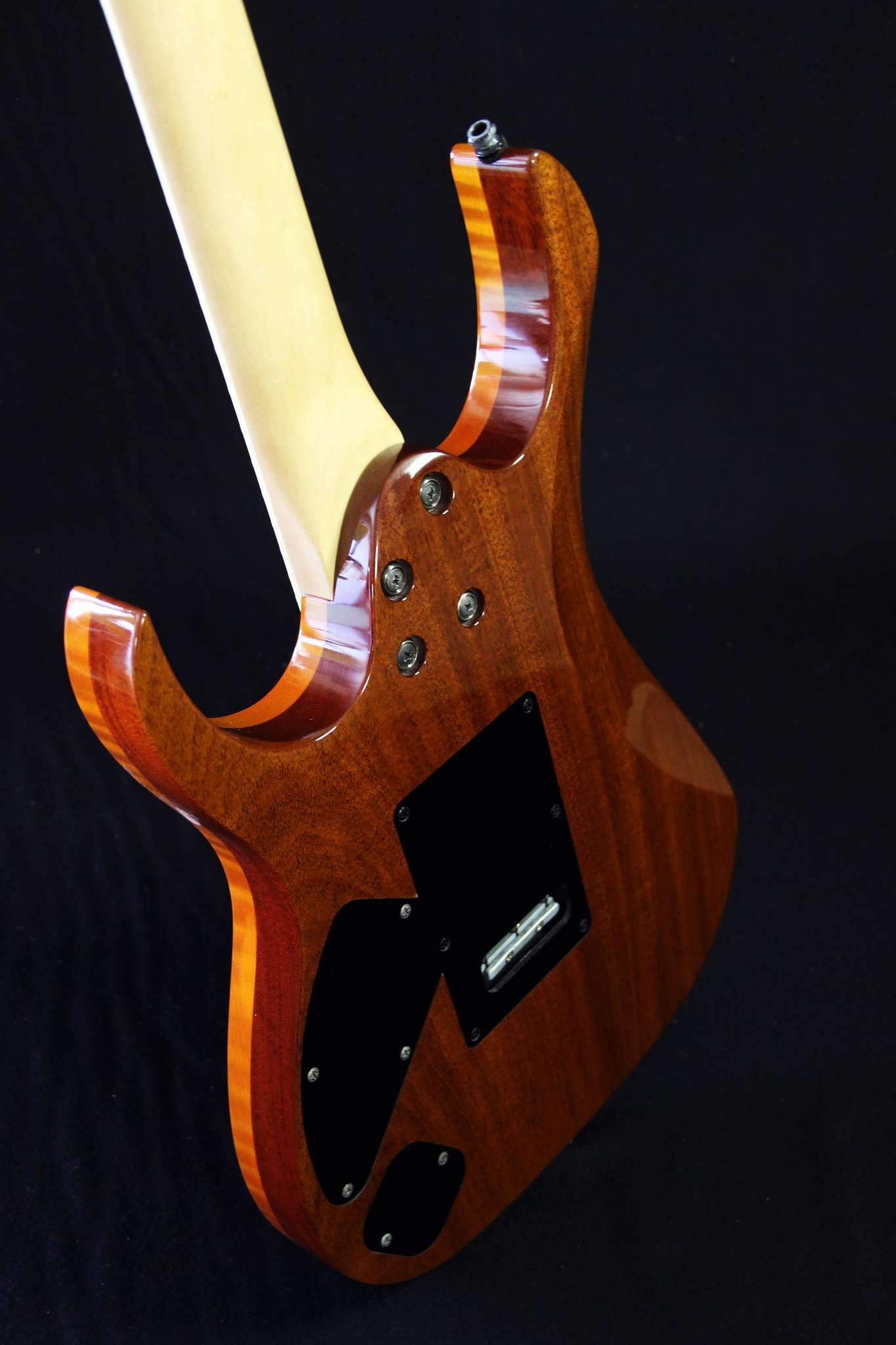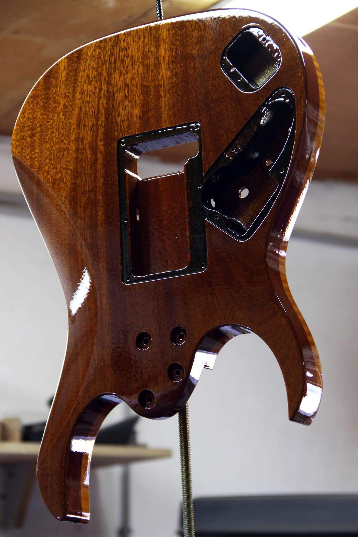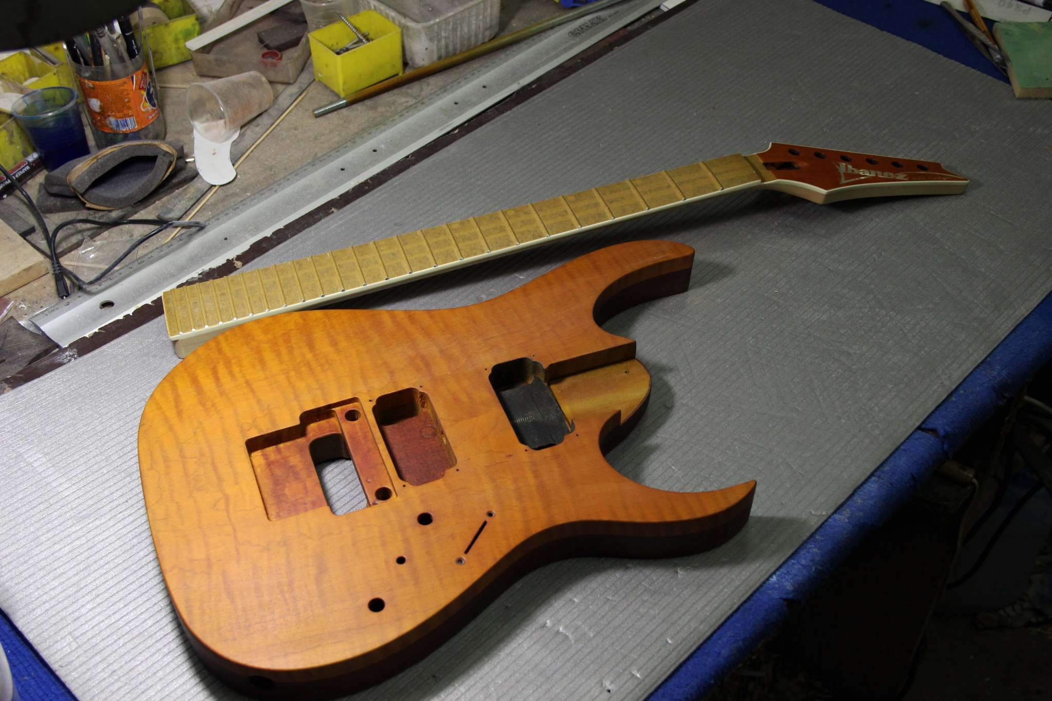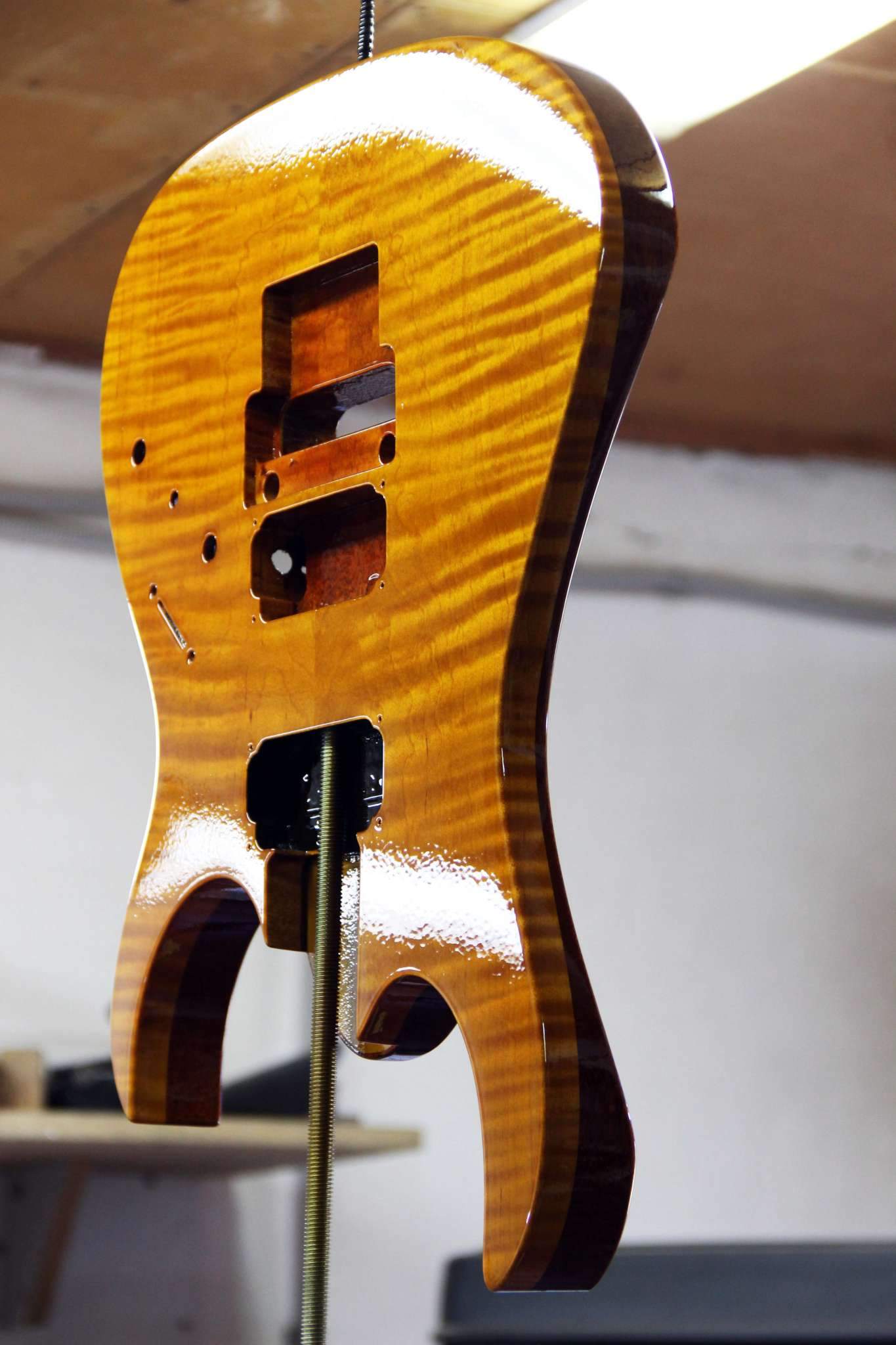 Следующий проект сквозной суперстрат, гриф клён\орех, дека ольха, топ стёганый клён, накладка эбен. Инкрустация из натурального перламутра.