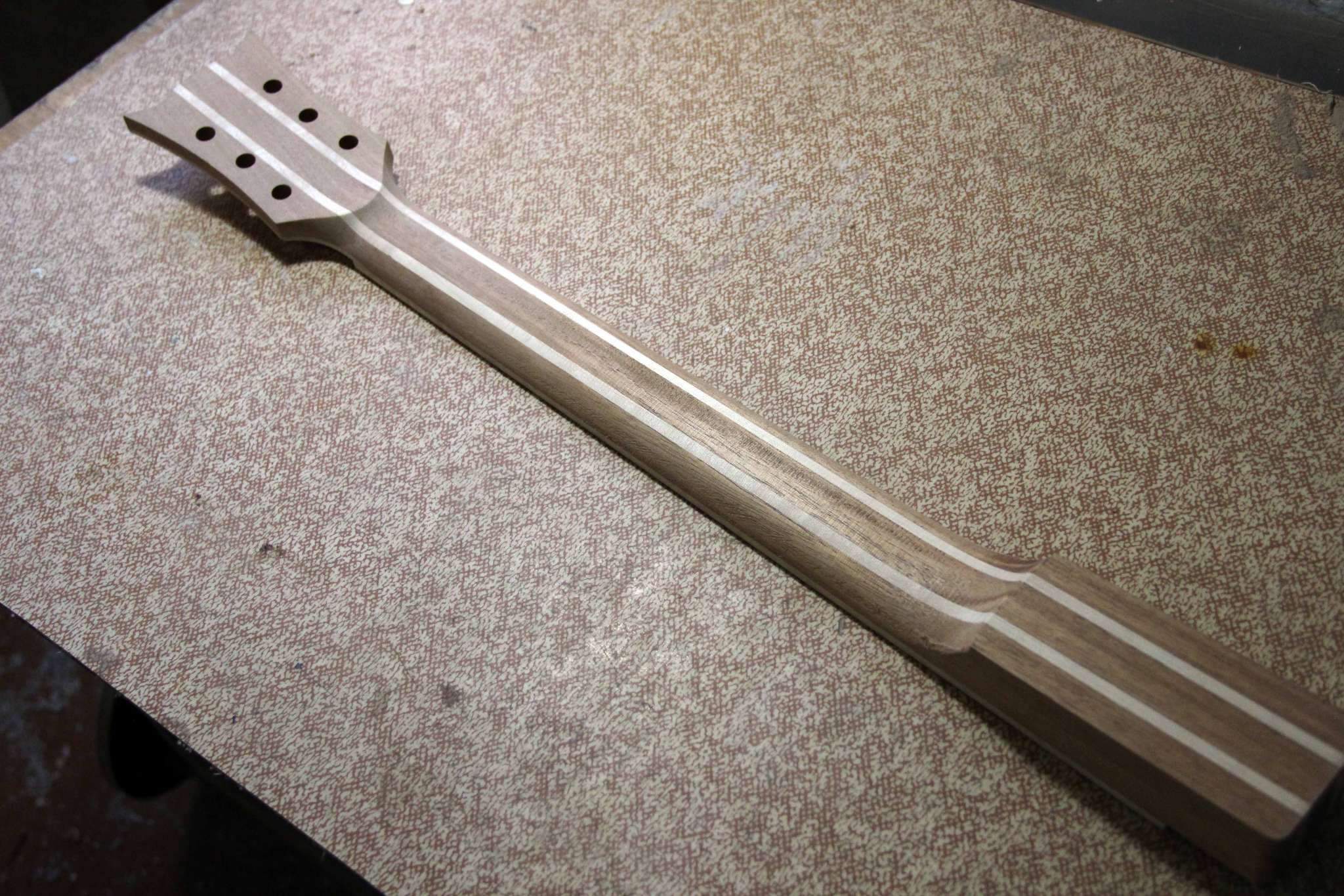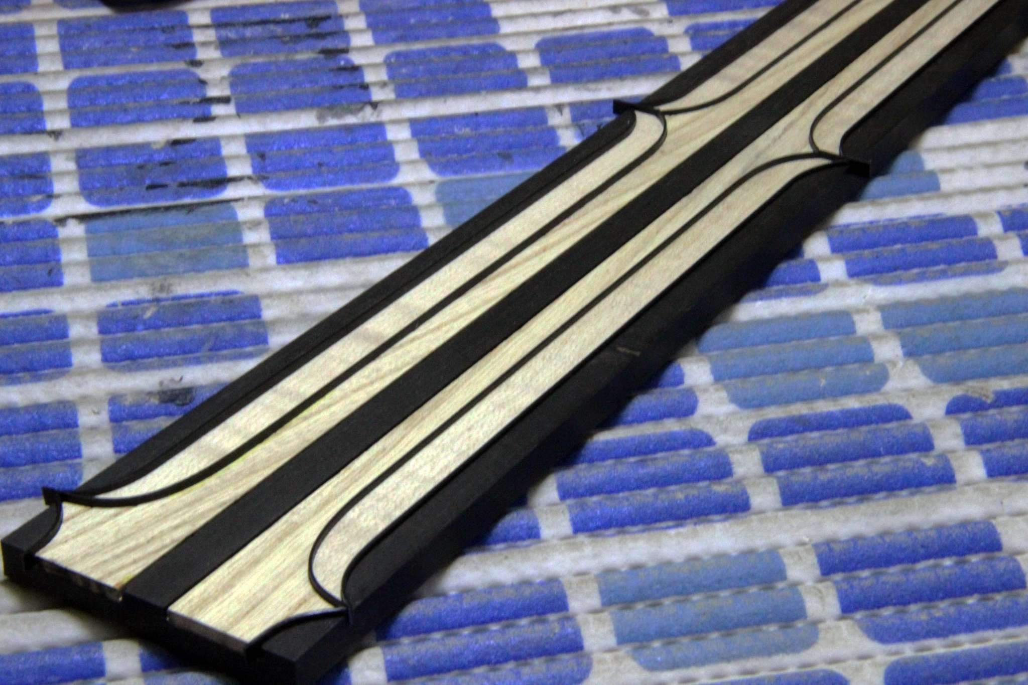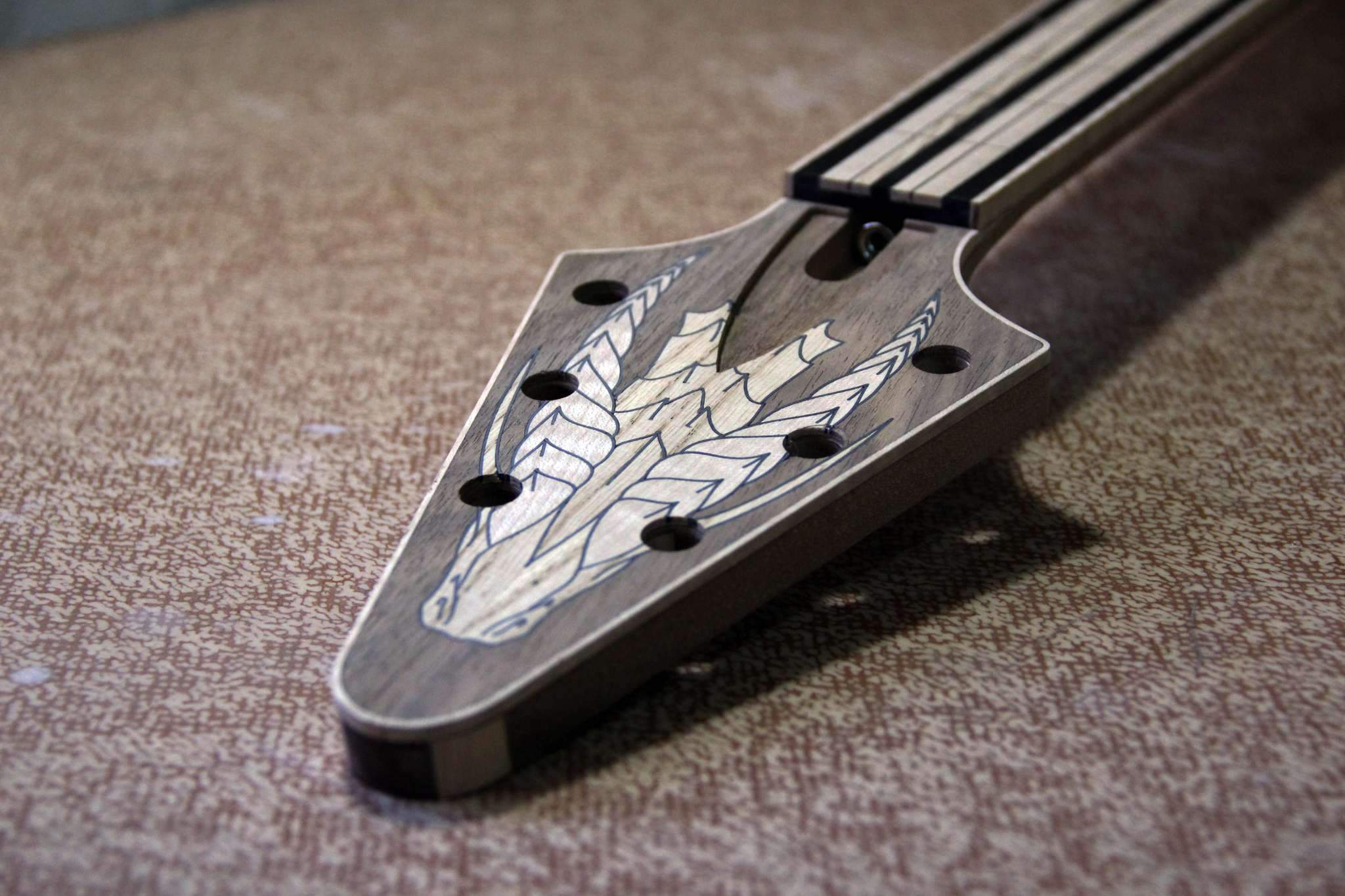 Тем не менее, следующий проект, это некое продолжение темы с драконами, на этот раз это сквозная стрела из ореха, инкрустированная несколькими видами клёна, ясенем и палисанлром... и укомплектованная бриджем, который разработал и изготовил я сам)