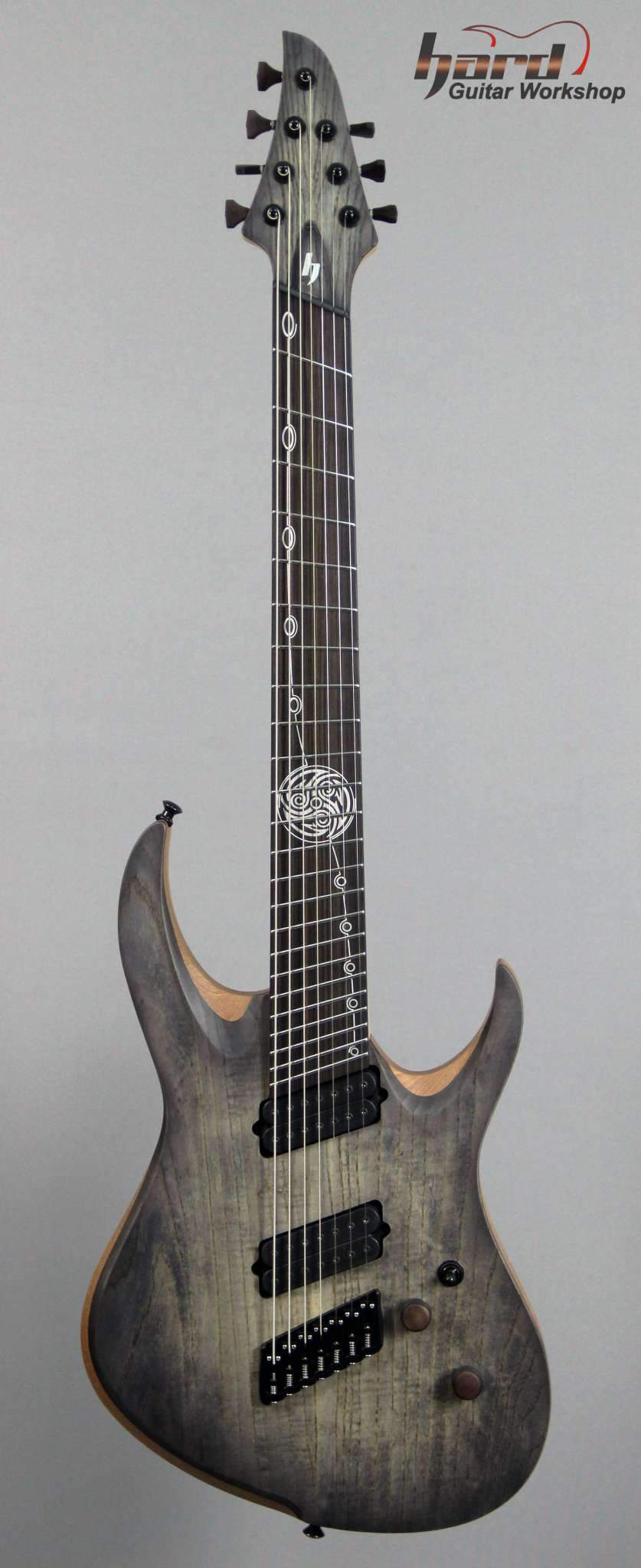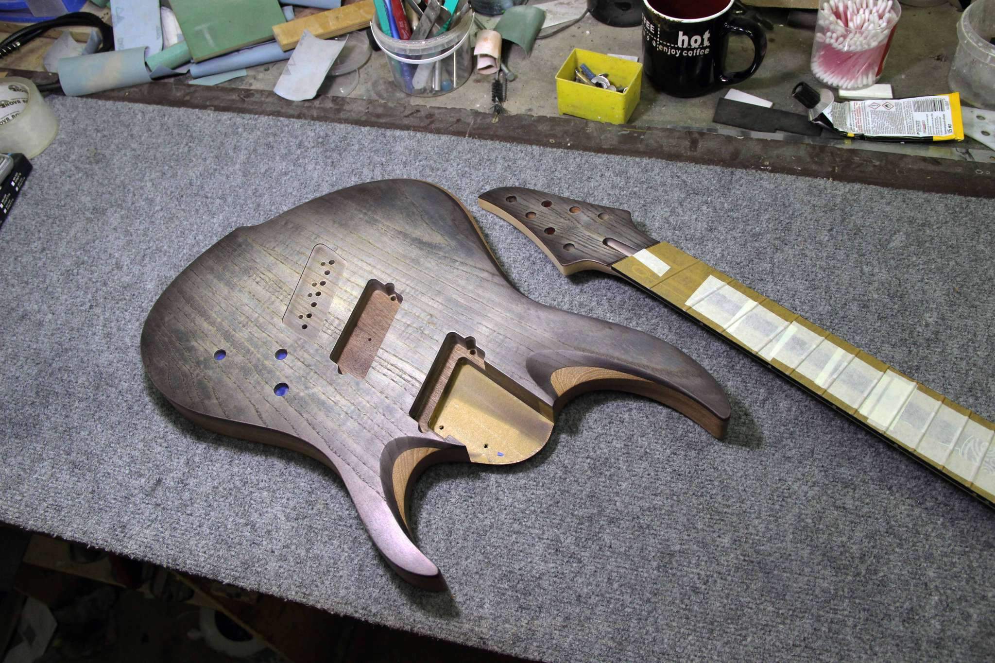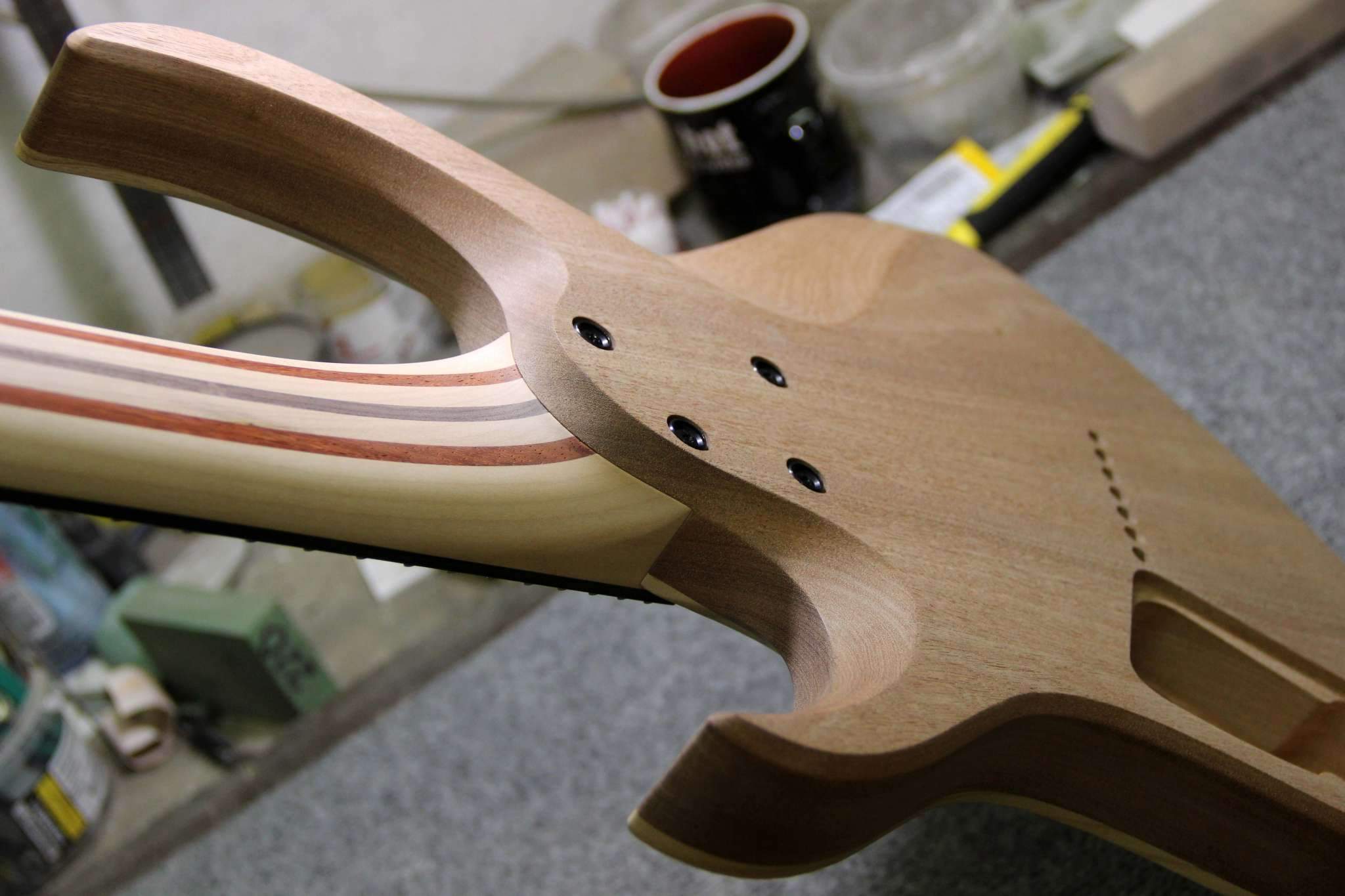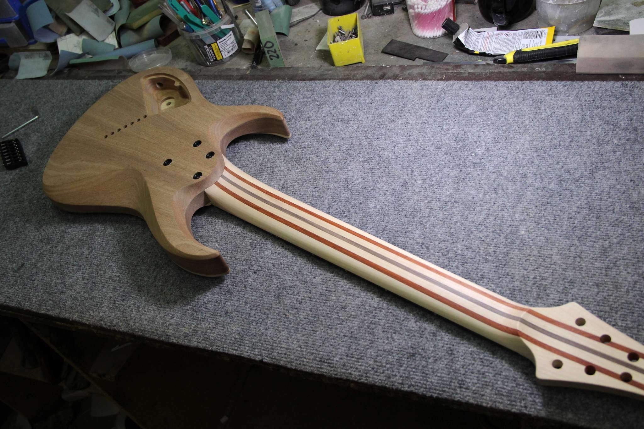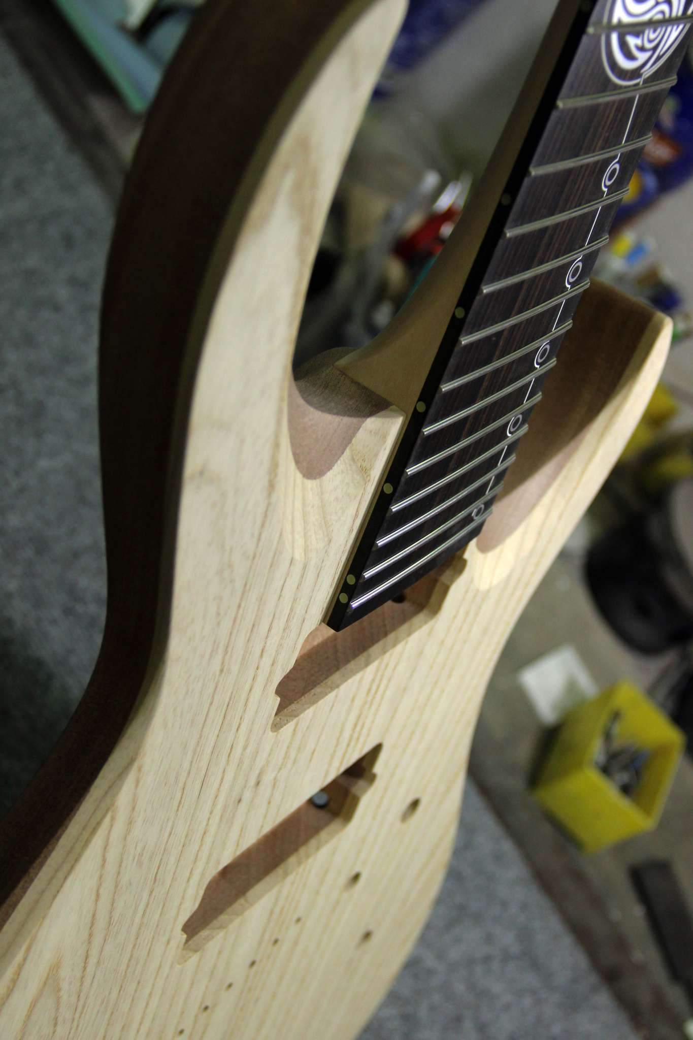 Всем привет! Завершаем очередной проект, это опять 7-струнная EVA, но на этот раз мультимензурная, дека сапеле с топом из болотного ясеня, гриф клён со вставками из бубинги и палисандра, накладка на гриф - макассар, инкрустация сделана из алюминия и белого пластика.