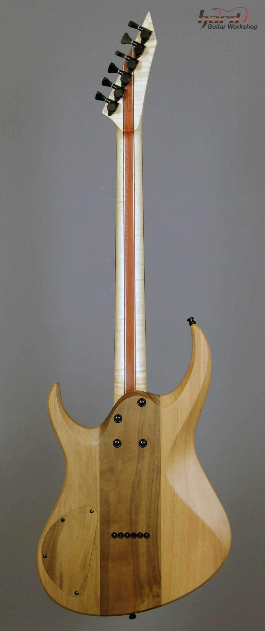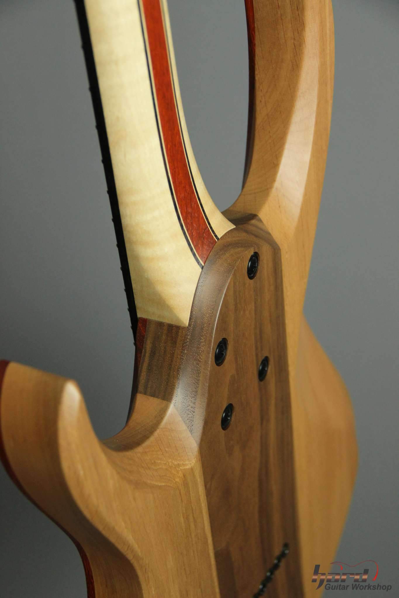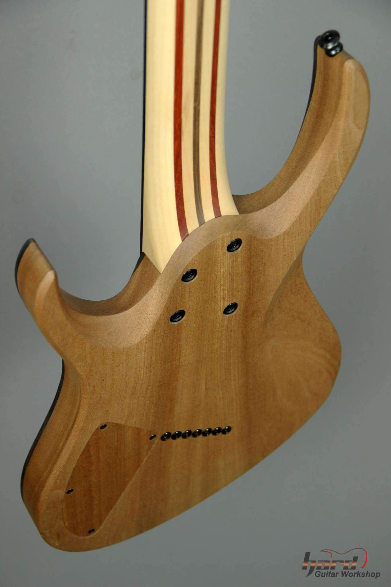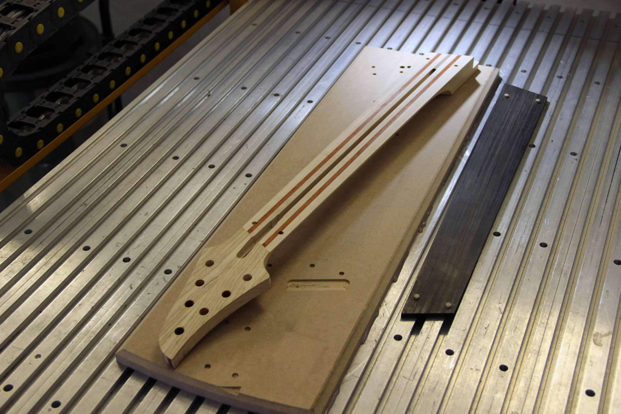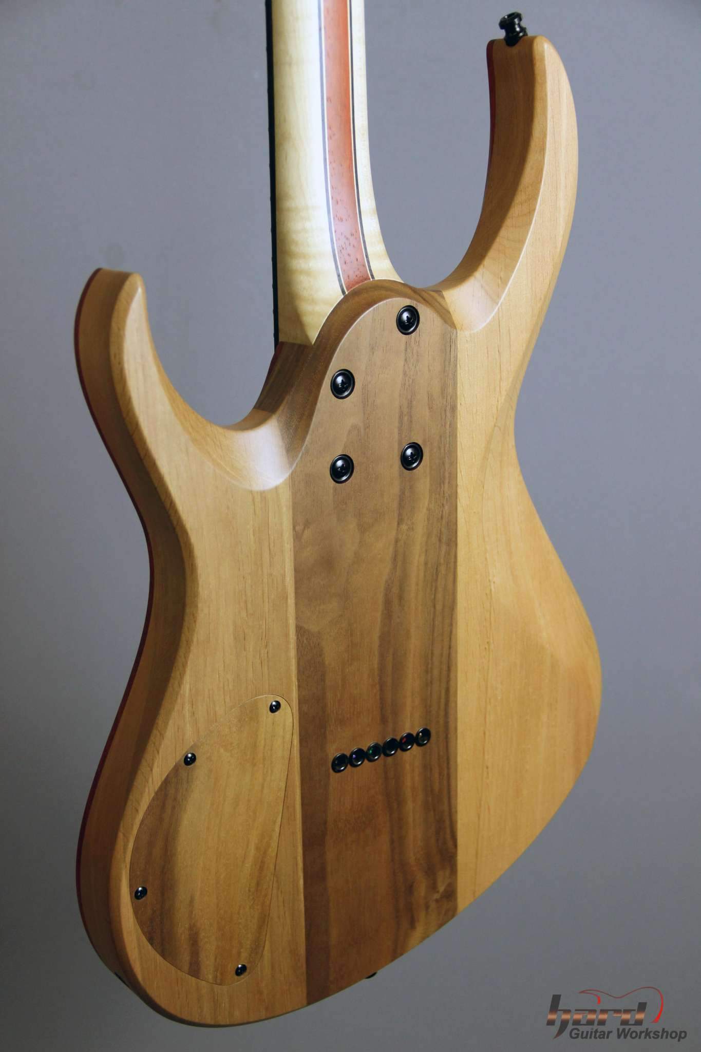 Всем привет! Завершаем очередной проект, это опять 7-струнная EVA, но на этот раз мультимензурная, дека сапеле с топом из болотного ясеня, гриф клён со вставками из бубинги и палисандра, накладка на гриф - макассар, инкрустация сделана из алюминия и белого пластика.