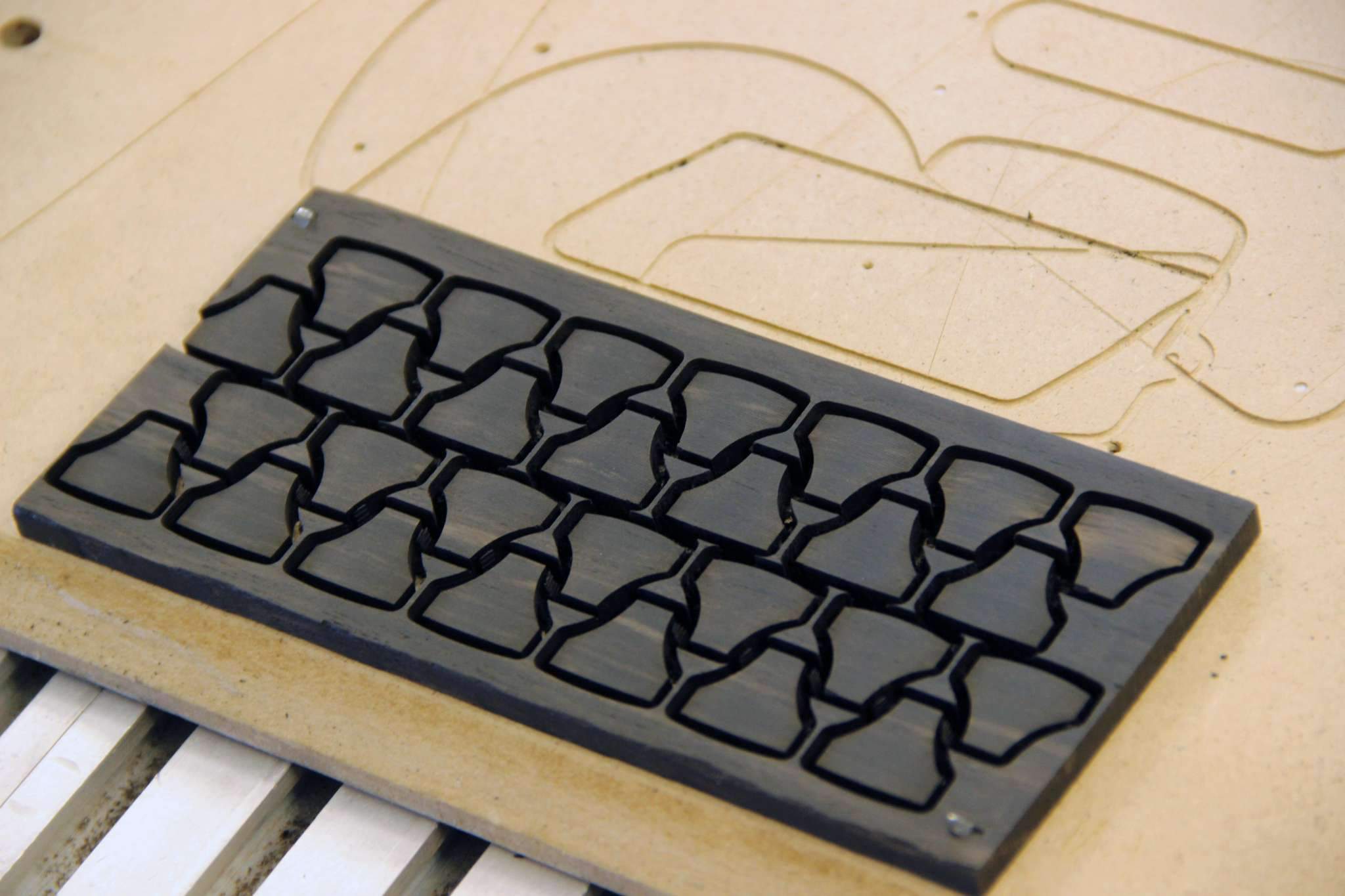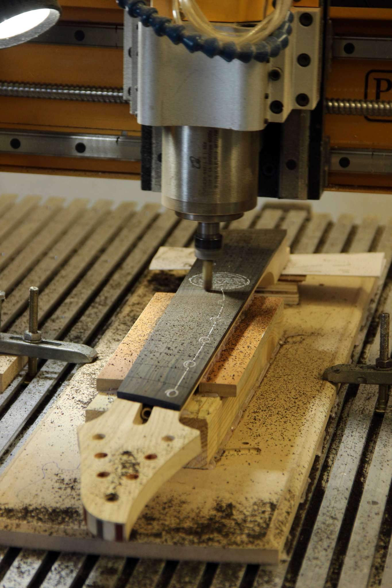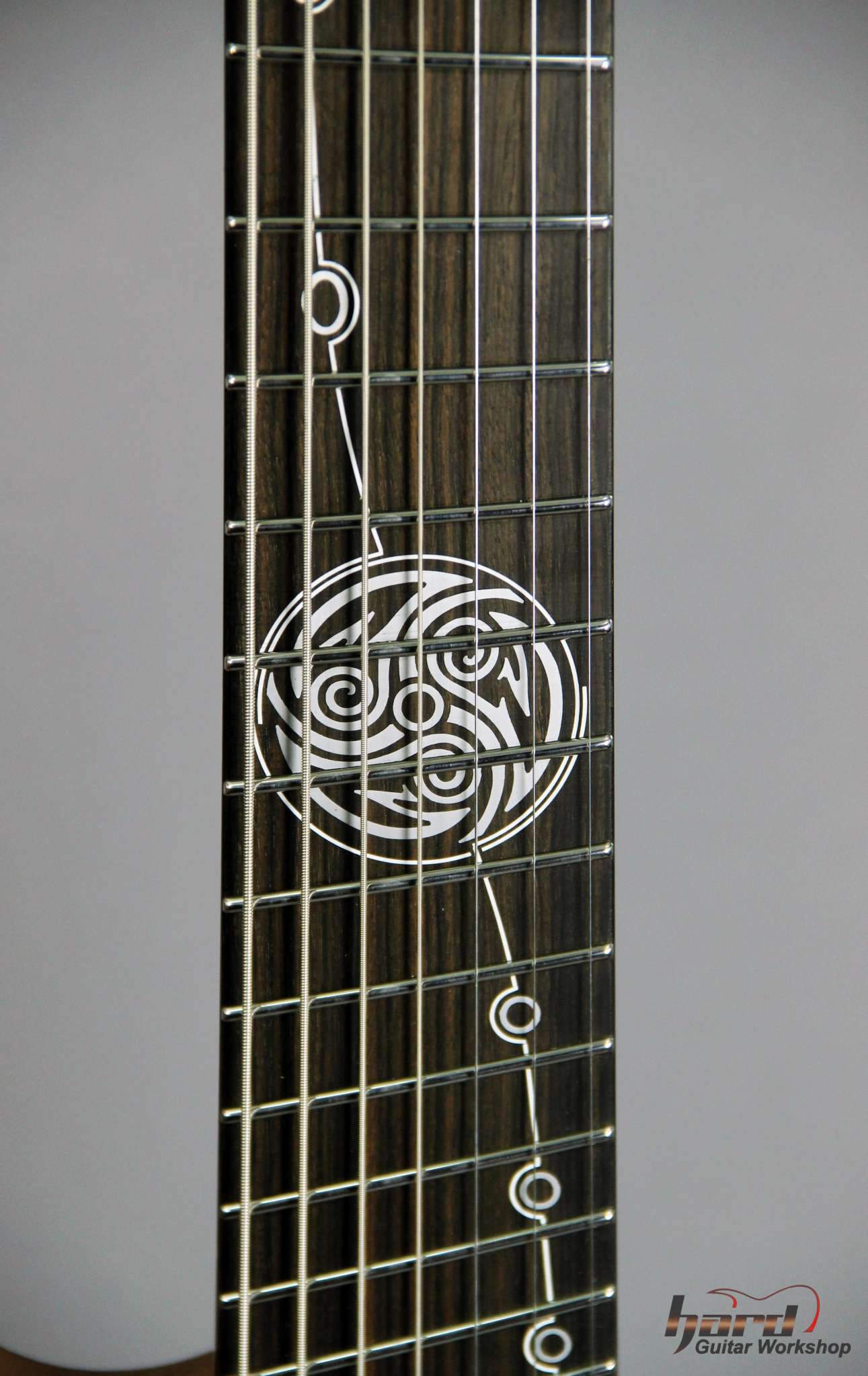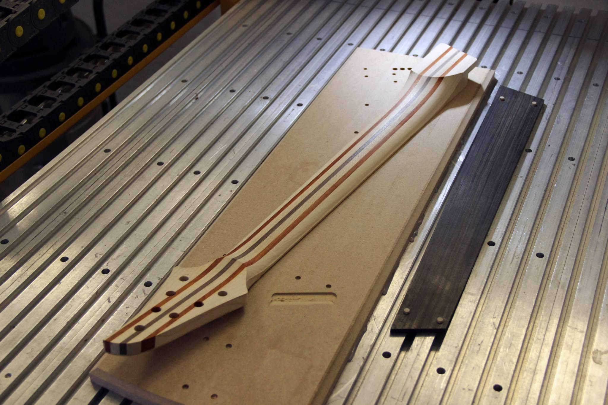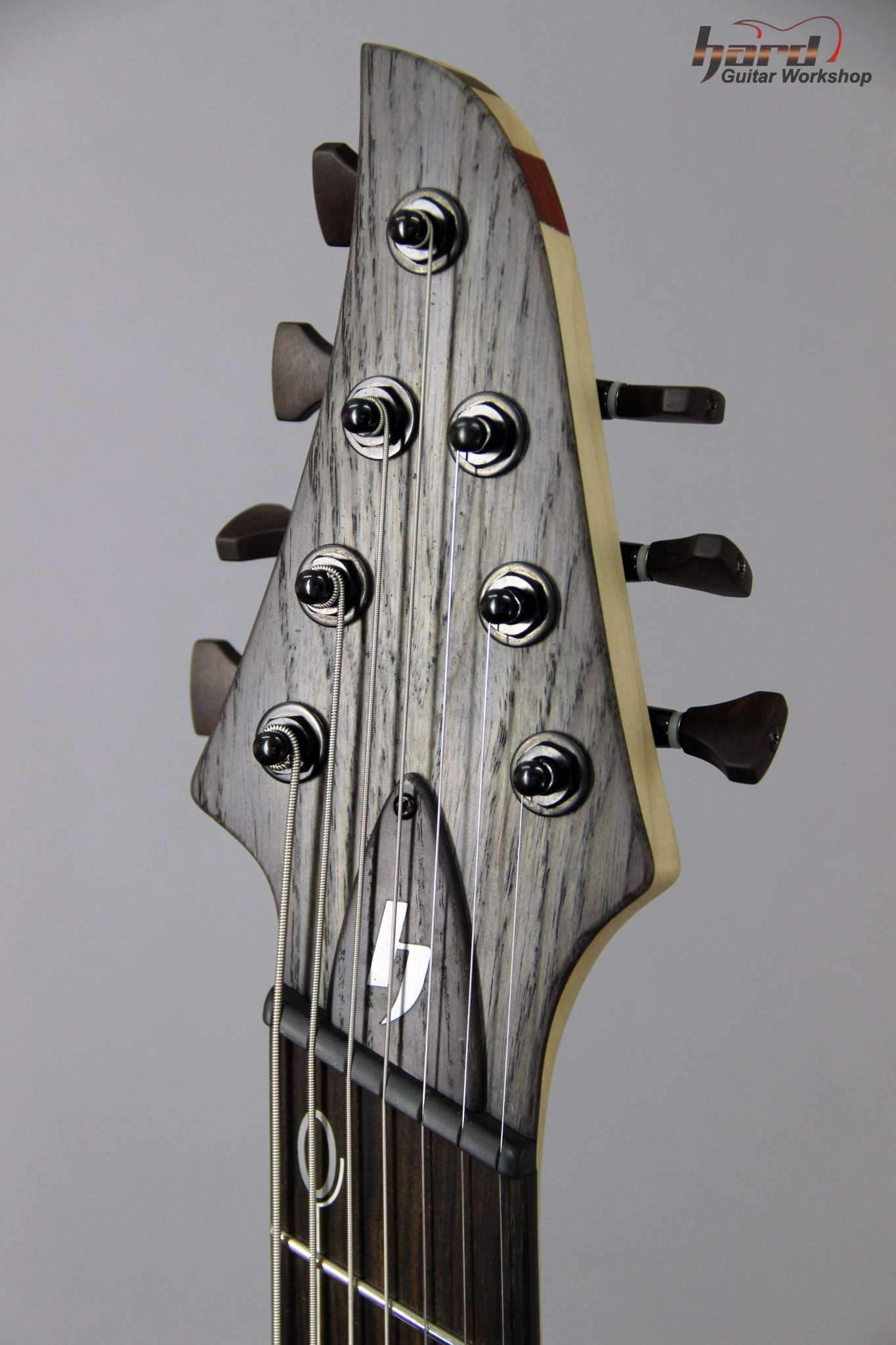 Всем привет! Завершаем очередной проект, это опять 7-струнная EVA, но на этот раз мультимензурная, дека сапеле с топом из болотного ясеня, гриф клён со вставками из бубинги и палисандра, накладка на гриф - макассар, инкрустация сделана из алюминия и белого пластика.