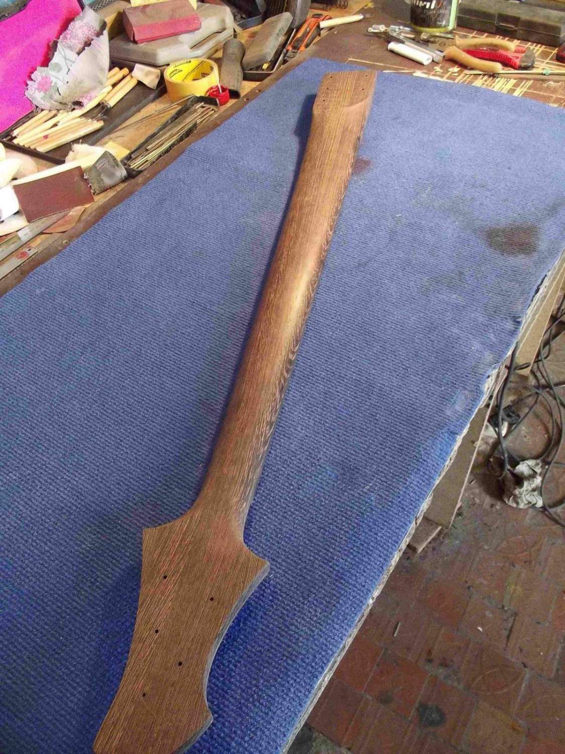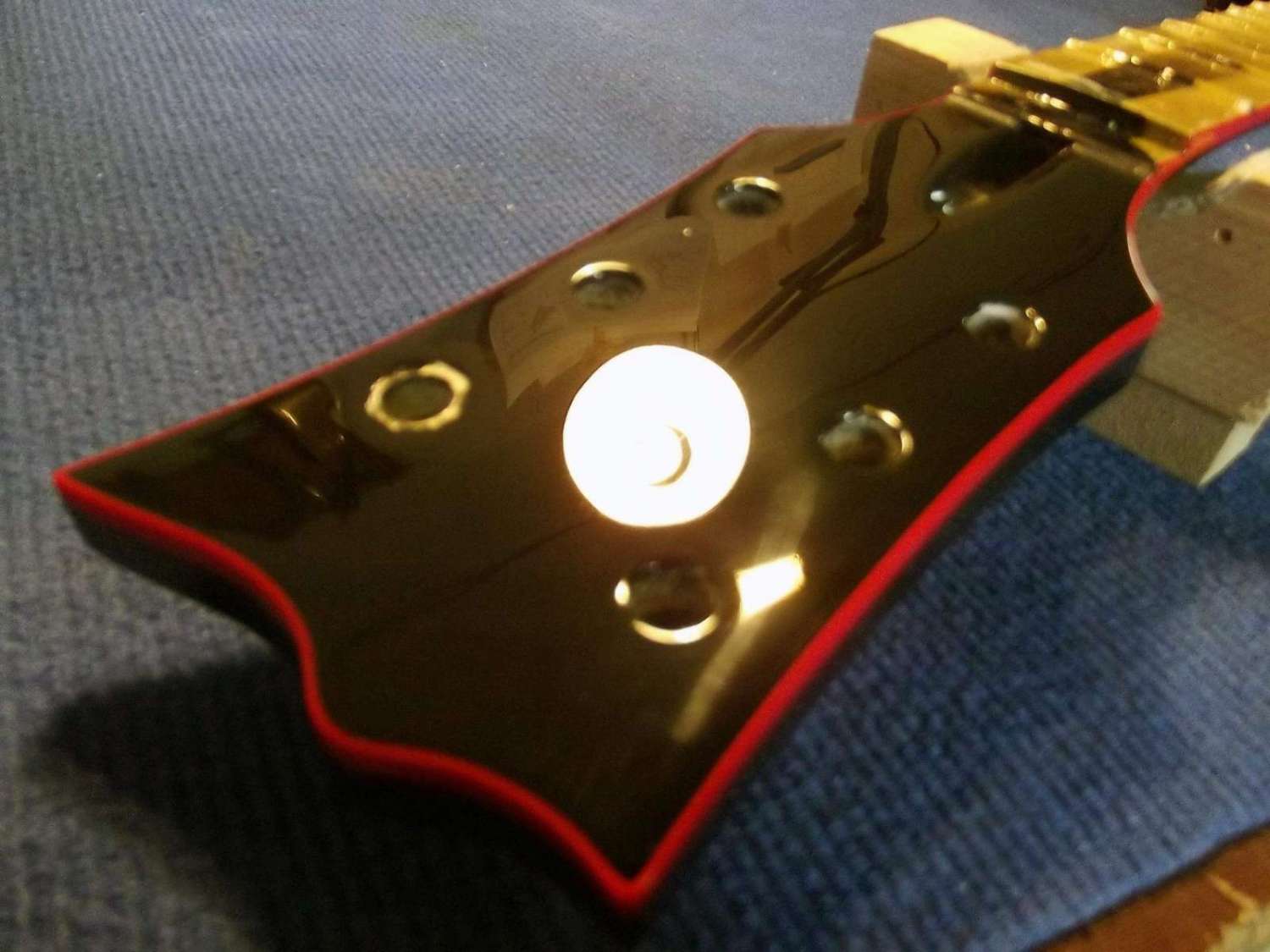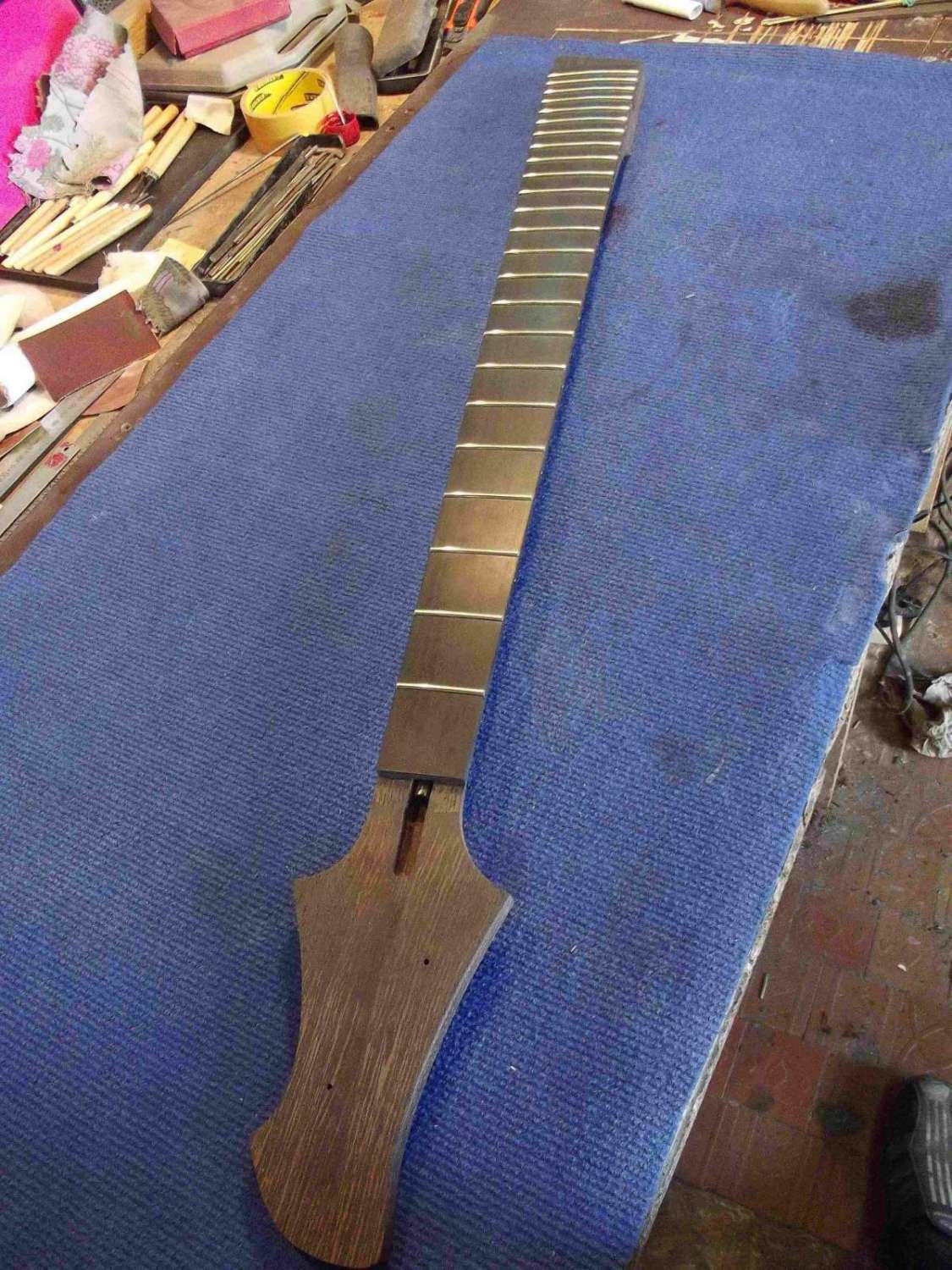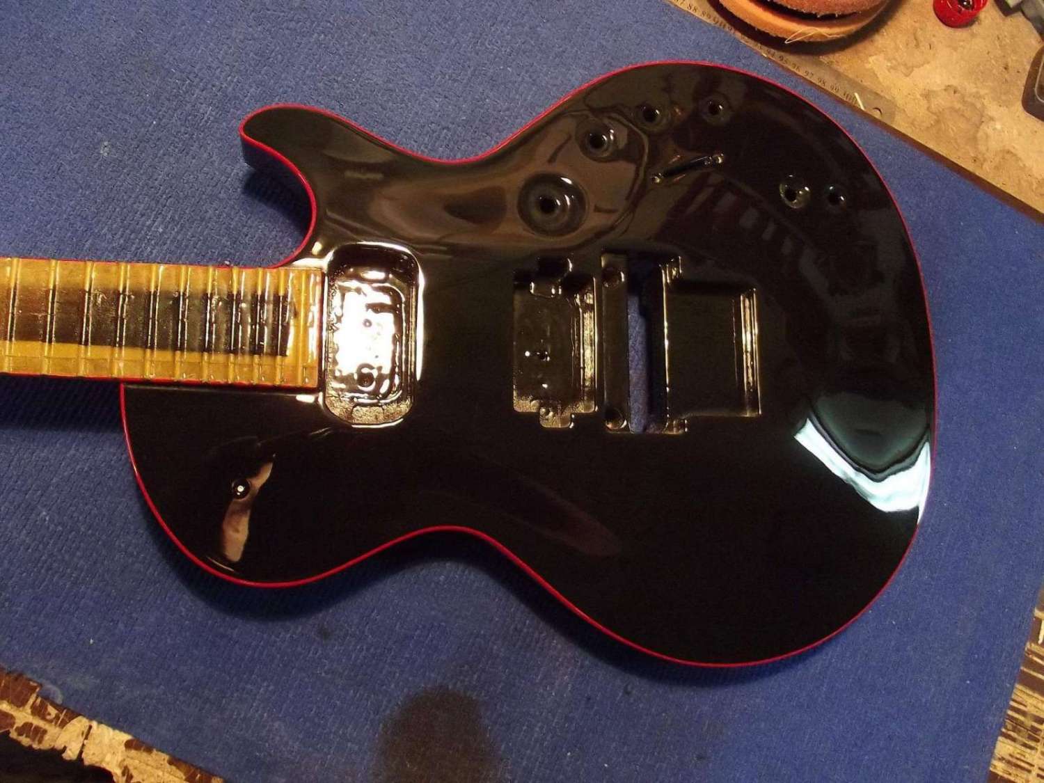 Врезка анкера, и вклейка кусочка эбена в области пятки грифа, для имитации продолжения накладки