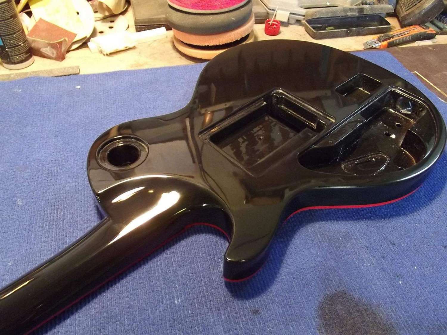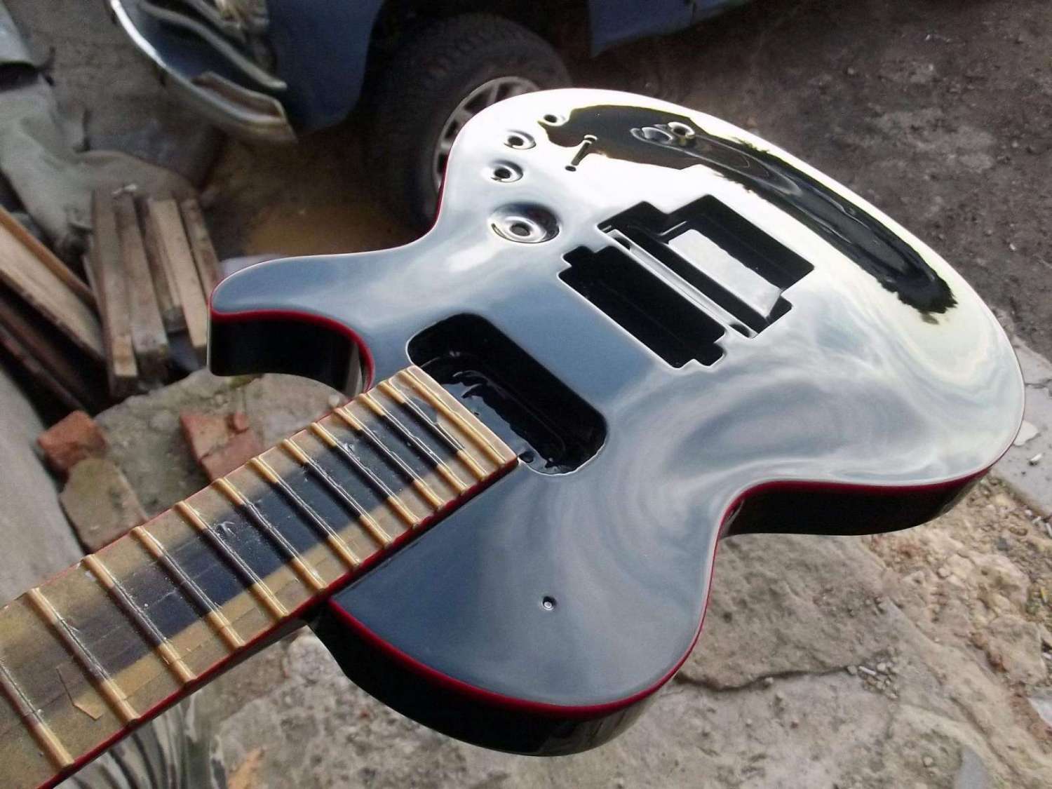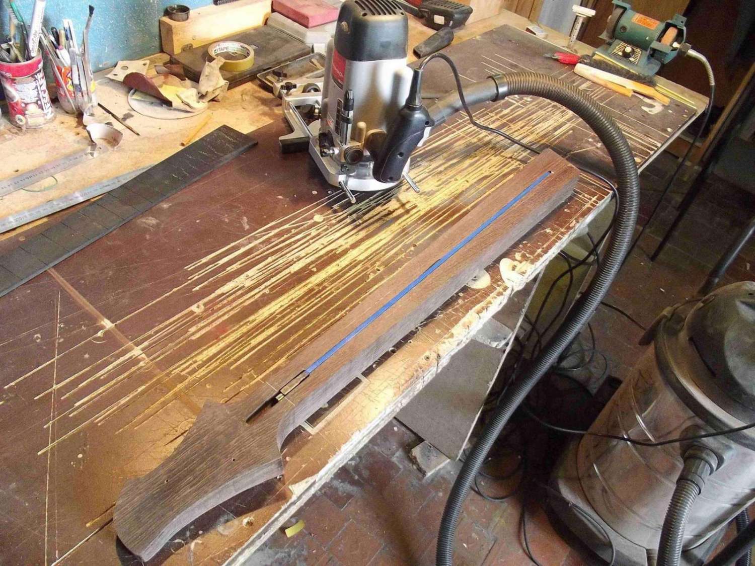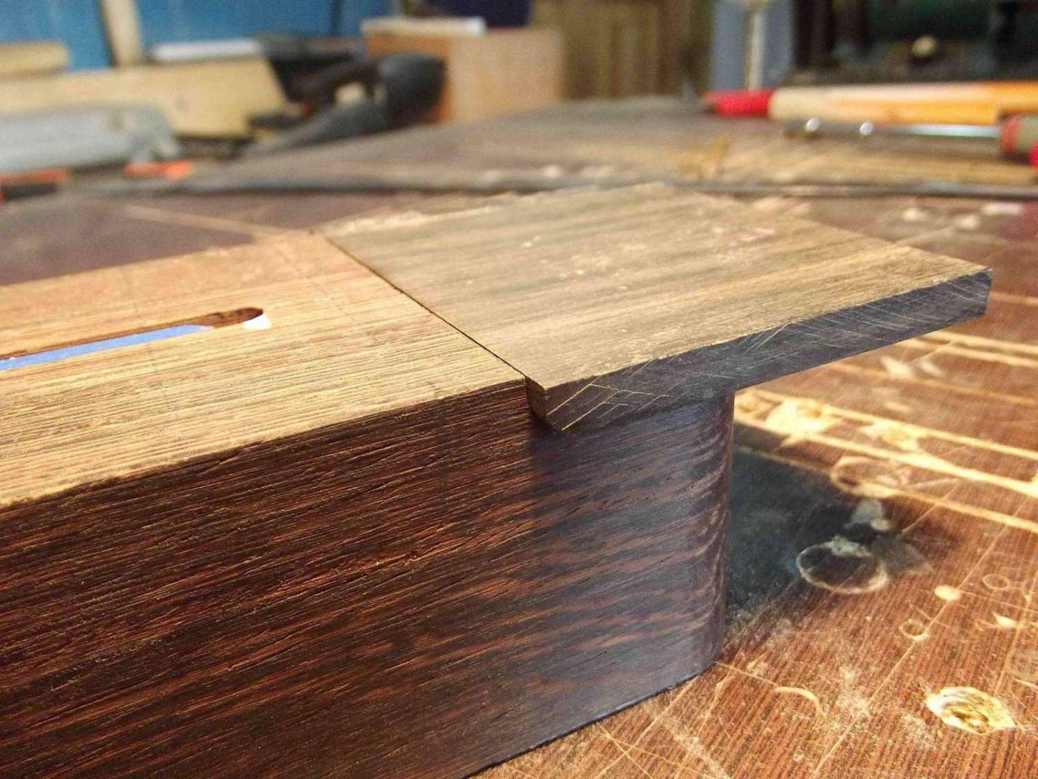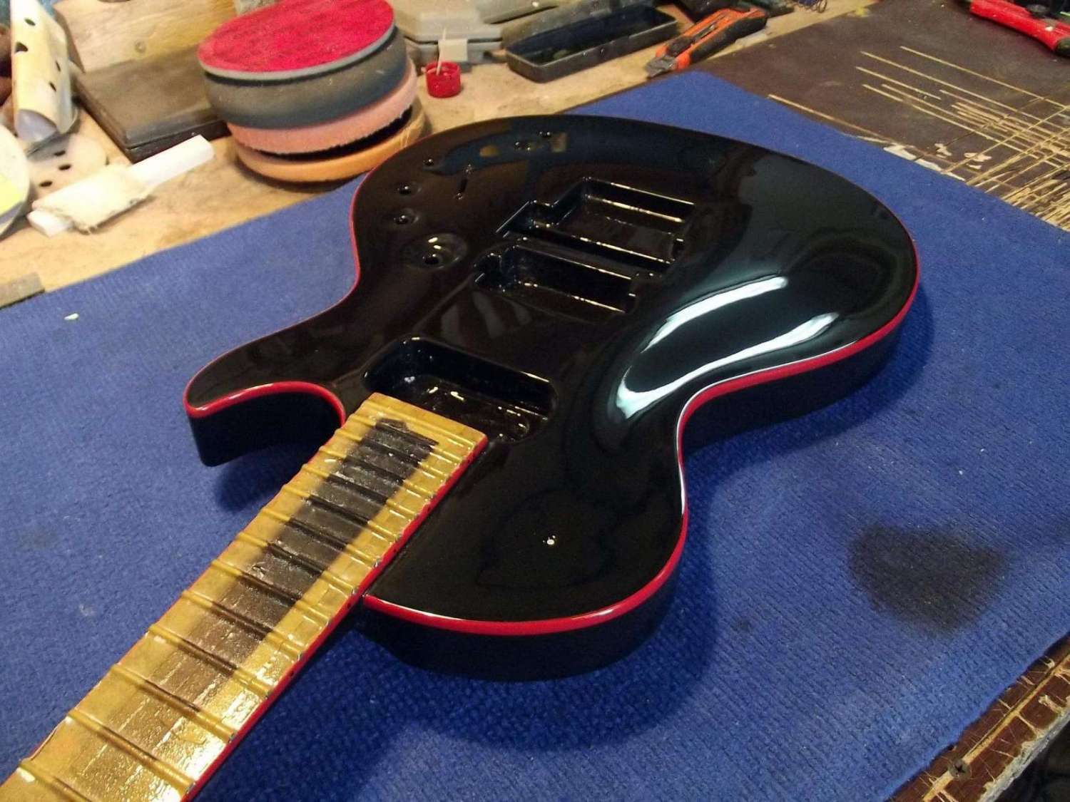 Врезка анкера, и вклейка кусочка эбена в области пятки грифа, для имитации продолжения накладки