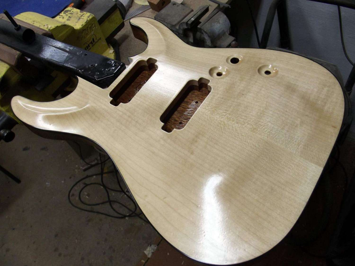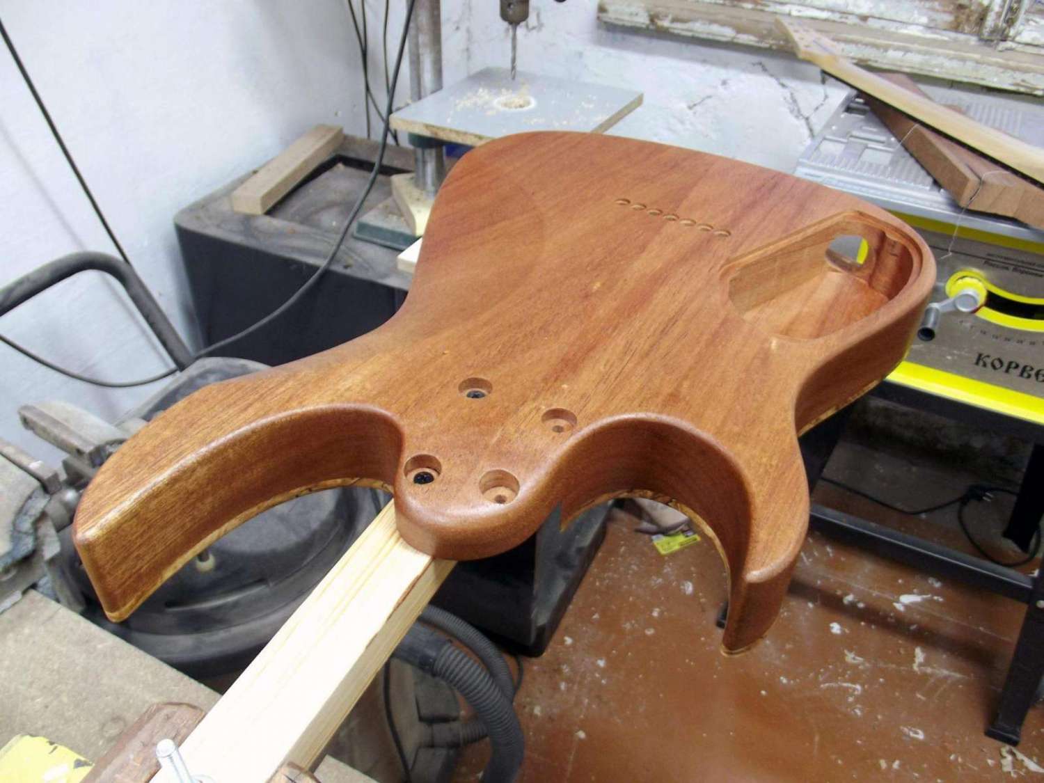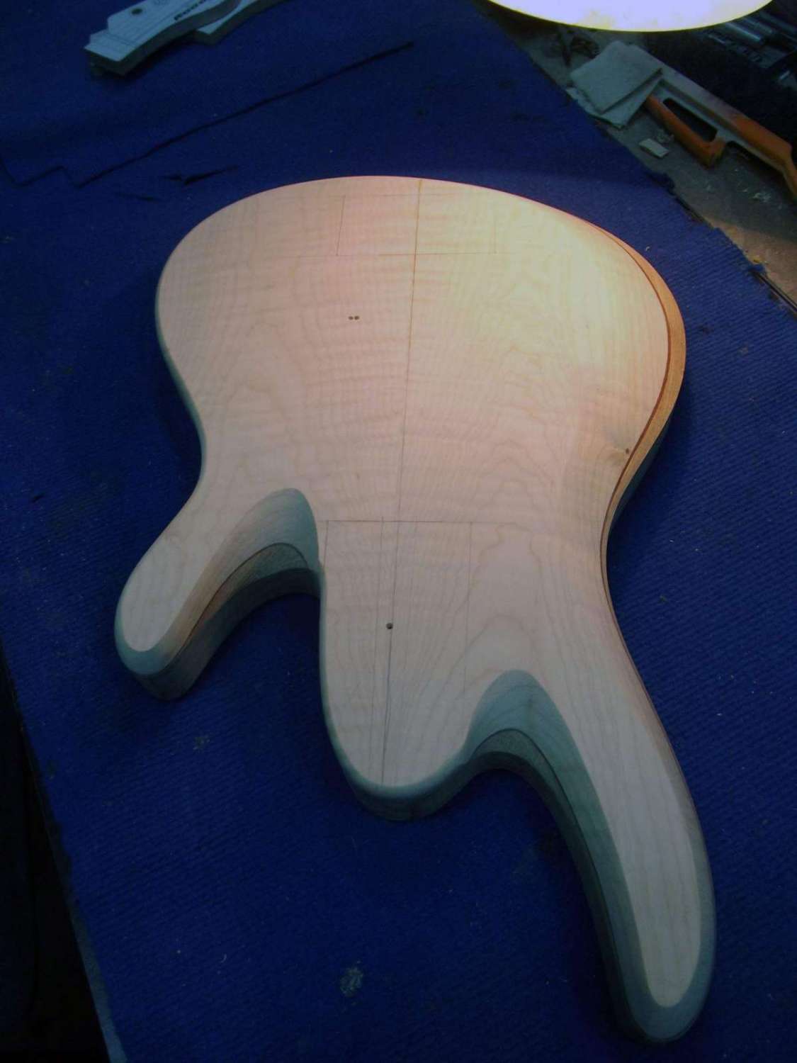 бас 5 струн, дэка ясень + кленовый топ + прослойка из шпона махагони