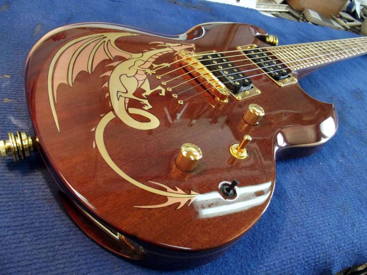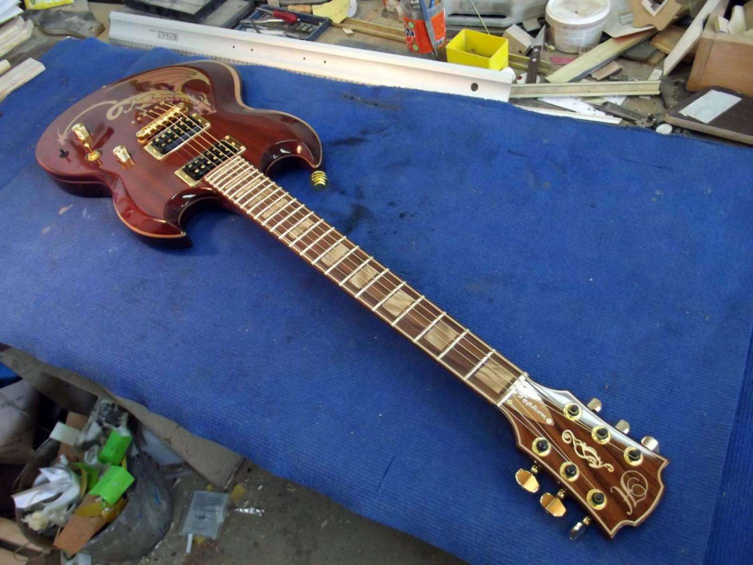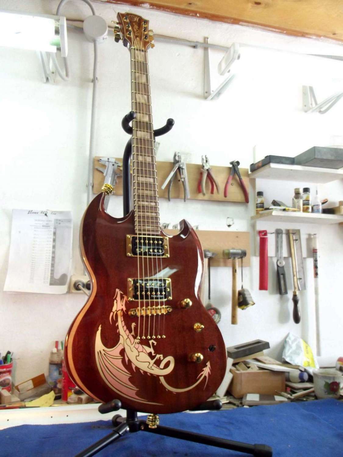 Являюсь счастливым обладателем творения Николая под названием "Тифон". Как уже говорилось гитара была чистым экспериментом,но к моему счастью все получилось. Начнем с внешнего вида-я конечно пытался представить себе как она будет выглядеть,но настолько крутой я даже не представлял. Очень шикарно! За инкрустацию дракона,а она была очень не легкой(процесс ведь я в живую видел),отдельный поклон. Теперь гриф-являюсь обладателем огромных "ручищ" поэтому основная масса стандартных грифов для меня тонковато,здесь же все сделано под меня,очень удобный гриф,даже грязь при игре исчезла,лег в руку как влитой. Вообще о внешнем виде-самые высокие отметки,все сделано очень тонко и кропотливо. Данному мастеру руки даны свыше! Так же хочу сказать о терпении,при изготовлении у нас были не большие разногласия и мои попытки улучшить инструмент(вообщем постоянные звонки с различными идеями и предложениями),но всегда находили компромисс. Ну и наконец звук-сразу оговорю два момента-описывать звук я не умею и звучки для этого инструмента сделал мастер Илья Фокин(здесь он под псевдонимом "Электроник"). Попробую скудно описать свои ощущения-я обалдел!!! Вообщем на неделе очень постараюсь записать сымплы,тогда все сами и услышите.