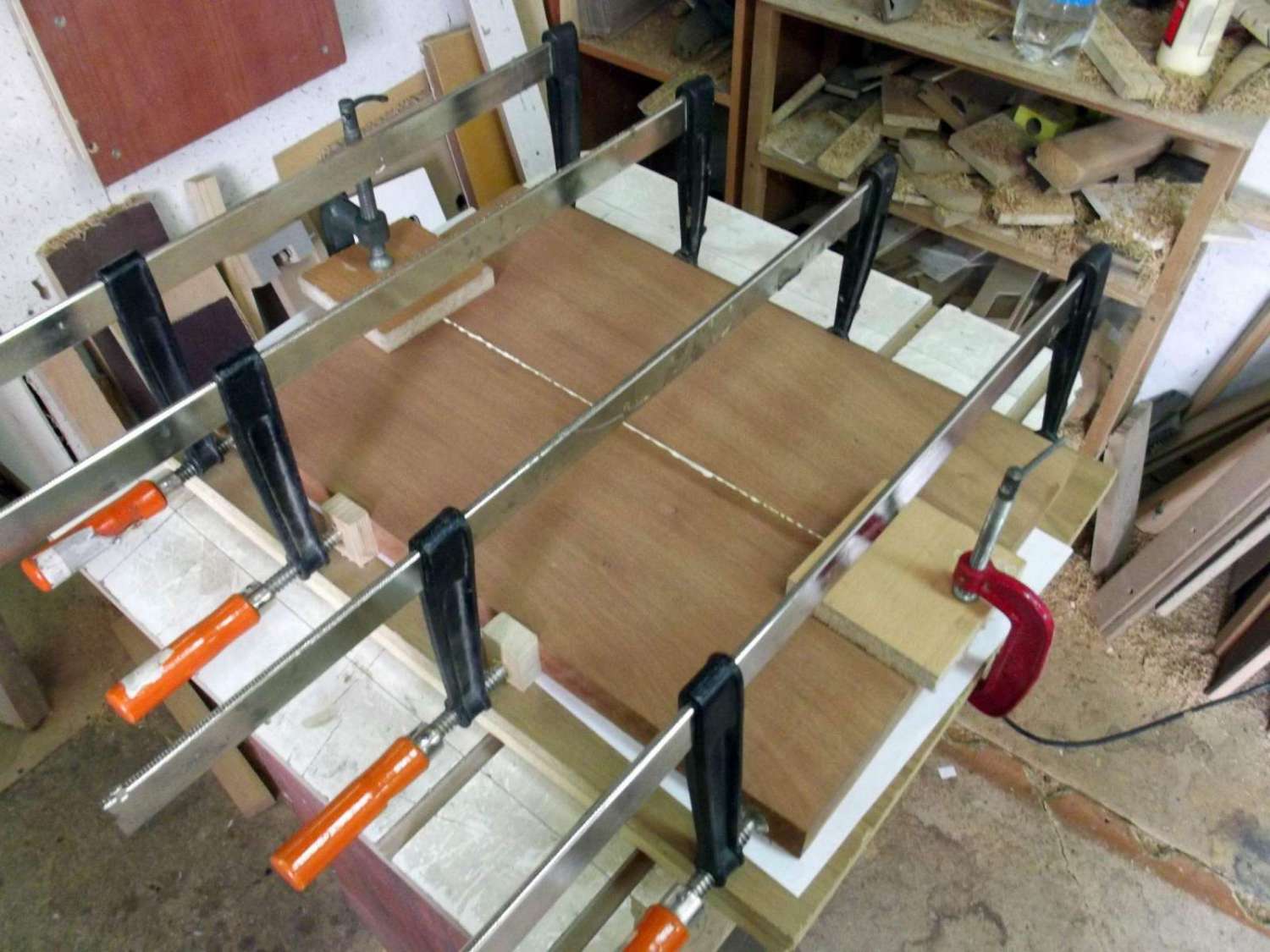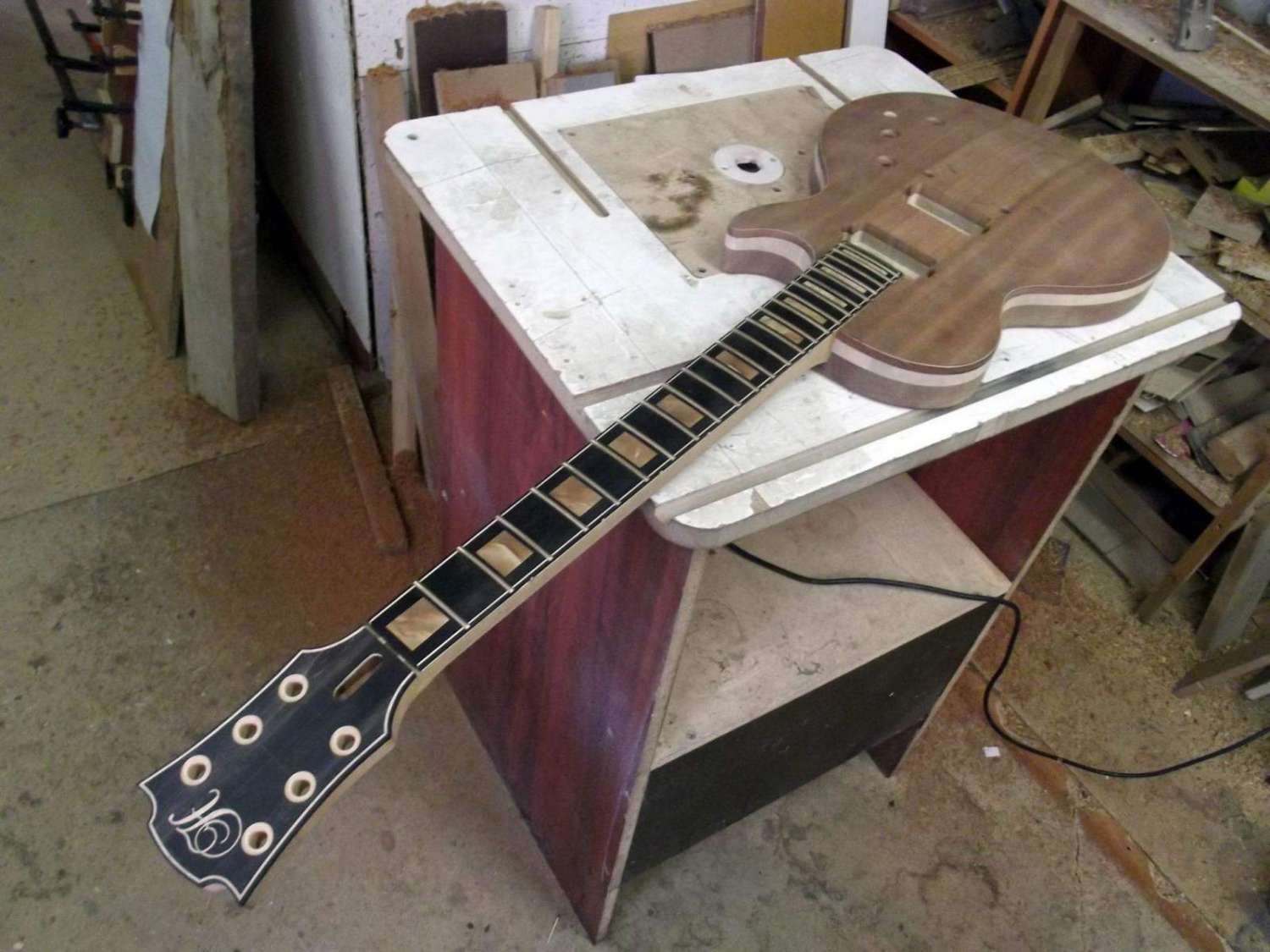 Прессуем бронзовые лады на Ладоне, и клеим гриф к дэке.