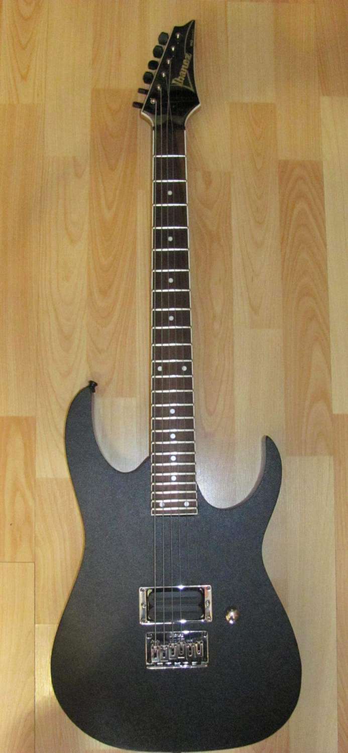 Всем привет! Я обладатель гитары Ibanez rg321mh. Играю на ней металл и тому подобное, гитара вполне приличная за свою цену, как мне кажется. Ну да ладно. Решил я тут её немного переделать, именно результатом этих переделок я и хотел бы с вами поделиться. Началось все с того, что надумал сменить звукосниматели, долго метался между Seymour Duncan и EMG. В итоге поставил в бриджевую позицию DiMarzio x2n, в нэковую решил ничего не ставить. Нашел схему в интернете и перепаял. С дырой, которая образовалась в результате отсутствия некового звукоснимателя, надо было что-то делать. Решил использовать сложенную в несколько слоёв толстую фольгу. Прижал её рамкой, но это была лишь часть задуманного. Нашел какой-то кусок кожи с надписью HARDLIFE, происхождение которой мне не известно. Скорей всего она была снята с какой-то шмотки. Размер подошел, как говориться, чётко, и плотно вставил её, не используя даже клея и тому подобное. Следующим моим замыслом была переделка деки, точнее ее вида. Решил убрать свитч между звукоснимателями, поскольку переключать теперь нечего. Также ручку тона. Свитч открутил, ручку снял, а сам темброблок убрал под крышку, которая находится на задней стороне деки. Кстати крышку дополнительно экранировал скотчем с металлическим напылением. В результате, остались некрасивые дыры от снятых деталей. Пошел в магазин, купил шпатлевку по дереву (махагон, но можно было бы и любой другой цвет) и баллончик с черной краской для разных поверхностей. Дыры заделал с обратной стороны тем же скотчем. Сначала обезжирил поверхность ацетоном (растворителем), затем начал шпатлевать. Шпатлевал три раза, делая перерыв где-то три часа. Шпатлевка проваливалась, рассыхалась и тому подобное. В итоге получилось вроде совсем неплохо, слегка зашкурил. Далее пришло время покраски. Обернул аккуратно электронику и гриф бумагой с изоляционной лентой. Красил раза три, с перерывами в часа три, после заключительной покраски, дал гитаре просохнуть около двенадцати часов. Затем снял бумагу и заполировал шерстяной тряпкой круговыми движениями. Далее занялся грифом. Обработал гриф спиртом, дал просохнуть. Затем обработал лимонным маслом каждый лад. Кстати аккуратнее с этим маслом, лично у меня при попадании на краску, которую я нанес на деку, растворяло ее, как растворитель. После того, как обработал спиртом и маслом, тщательно прошелся чистой сухой тканью. Все было почти готово, оставалось поставить новые струны. Так как я играю в строе DROP A, то струны надо выбирать не тонкие, но и не очень толстые. Раньше у меня стояли 11-70, но поиграв на них, я понял, что толстоваты. Решил купить комплект струн GHS 7L для семиструнной гитары. Первую струну, не используя, отложил в сторону, и натянул остальные шесть. Получился комплект 11-16-24-32-42-58. По мне так отлично встали. Все. Гитара слегка переделана и готова. Звук меня полностью устраивает. Кто-то может и скажет, типа гитара бюджетная и тому подобное, но на вкус и цвет, как говориться.