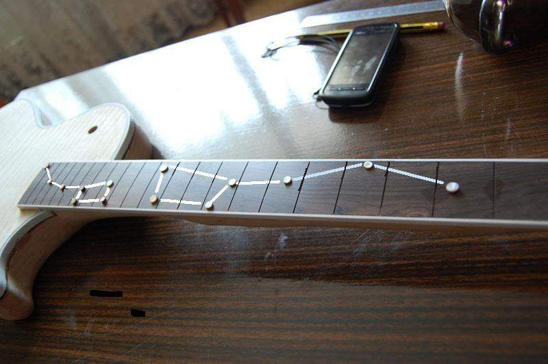 Если делать инкрустацию до радиуса то есть вероятность что при выведении этого самого радиуса маркеры могут местами вышливоваться. А в моем случае можно их достаточно точно усадить без такого риска. Некоторые радиус рубанком выводят. Что, прям по перлу рубанком? К тому же это предварительный радиус самой крупной шкуркой. После всё будет доводиться разными калибрами вместе с маркерами. Подожди делать выводы, помимо точек будут еще соединительные линии обозначающие эти самые ковши, тогда и посмотрим. По меньшей мере это оригинально, я такого раньше не видел. К тому же продолжает концепцию звездной ночи, античной культуры. Да и вообще удачность инкрустации я считаю нужно оценивать вместе с ладами и струнами