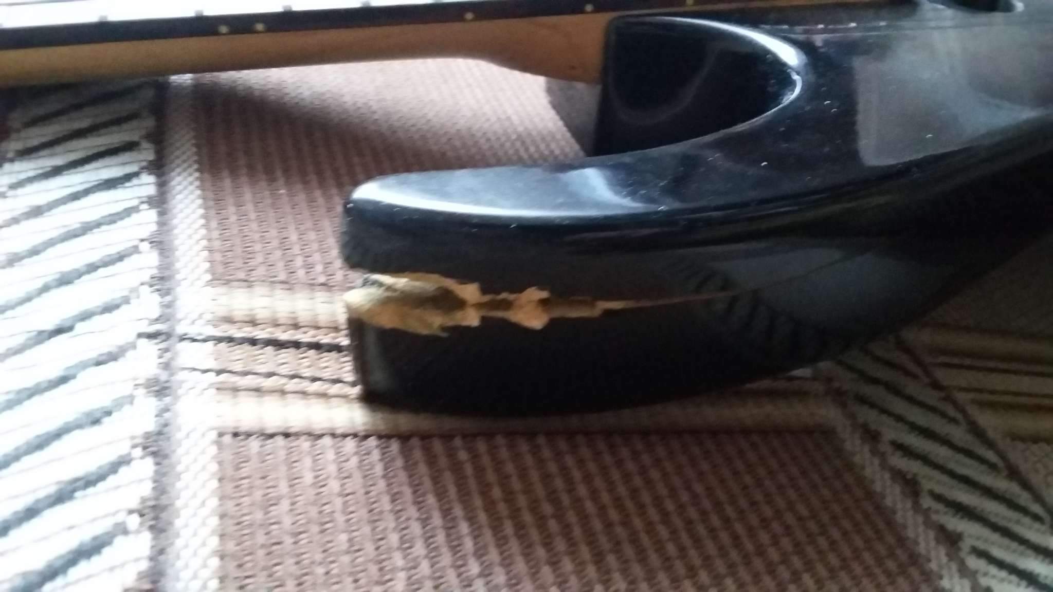 ), бридж прикручен на саморезы (там были такие страшные черные, я менял их, чтобы тремоло-бар работал, и выбил колышек, которым прошлый чувак подпёр бридж, чтобы тот не качался), а ещё в корпусе огромная трещина от того, что кто-то пытался ввернуть туда огромный шуруп для ремня.