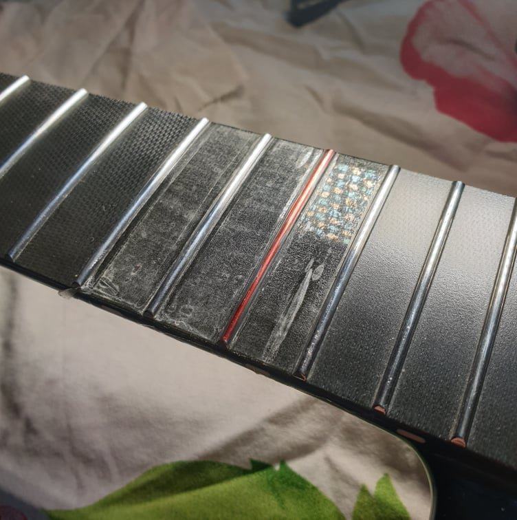 Нагрел лад наполовину,наполовину поднял,вычистил старый клей,залил эпоксидку с краёв,заточенными спичками поместил клей под лад.Подвигал ладом,чтобы побольше туда смолы зашло.Прижал нивелиром,держал минут 30. Через 1.5 часа пока клей ещё полностью не застыл,ещё раз сверил.