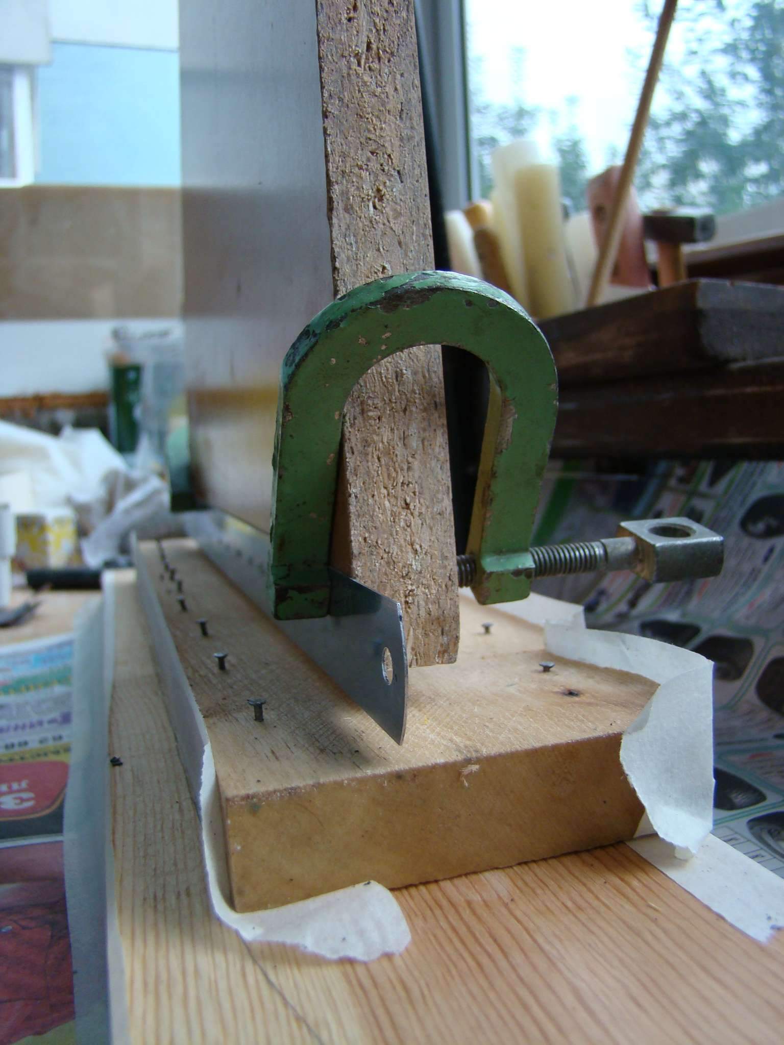 суть приспособы такова - на жёстко закреплённой оси подвешивается доска нужного размера. она должна качаться как качели. кромка доски должна быть ровной, гладкой, тонкой. я в качестве такой кромки использовал линейку на струбцинах прикреплёную к доске.