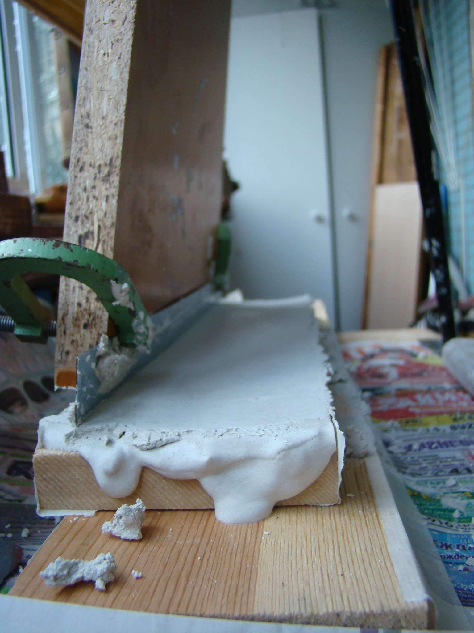 разводим жиденько гипс, и начинаем его лить на брусок с гвоздями, качаем качели, тем самым формируем в гипсе радиусную поверхность .