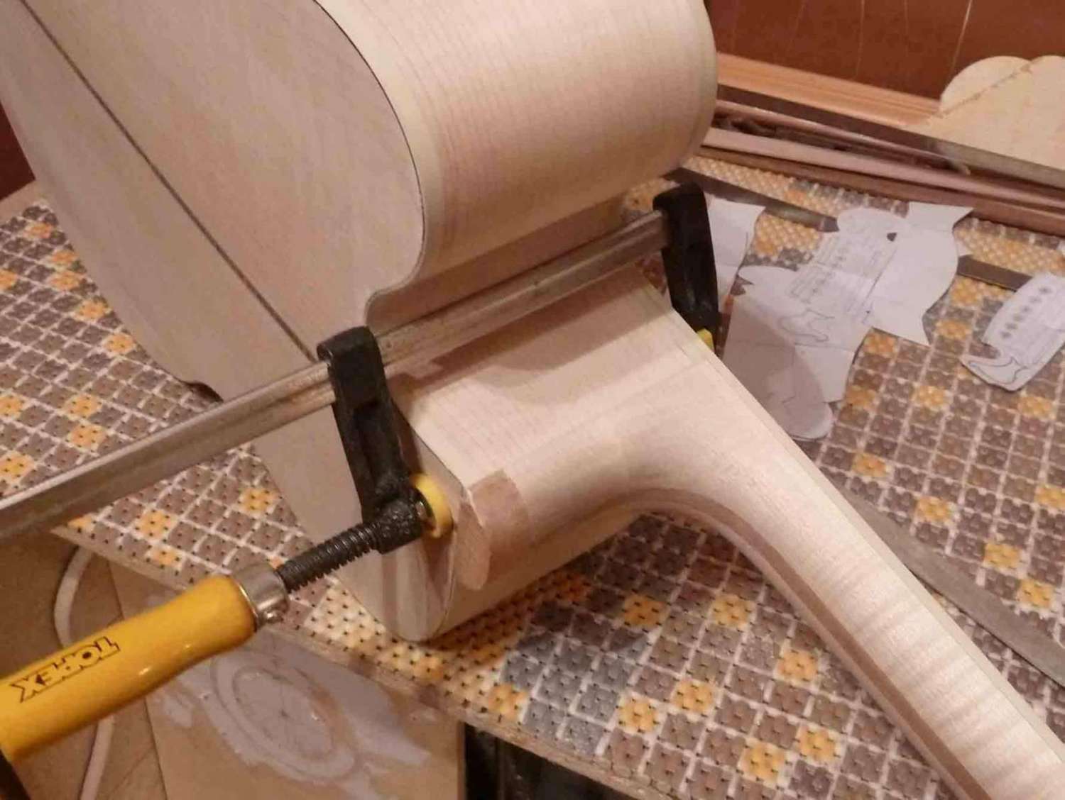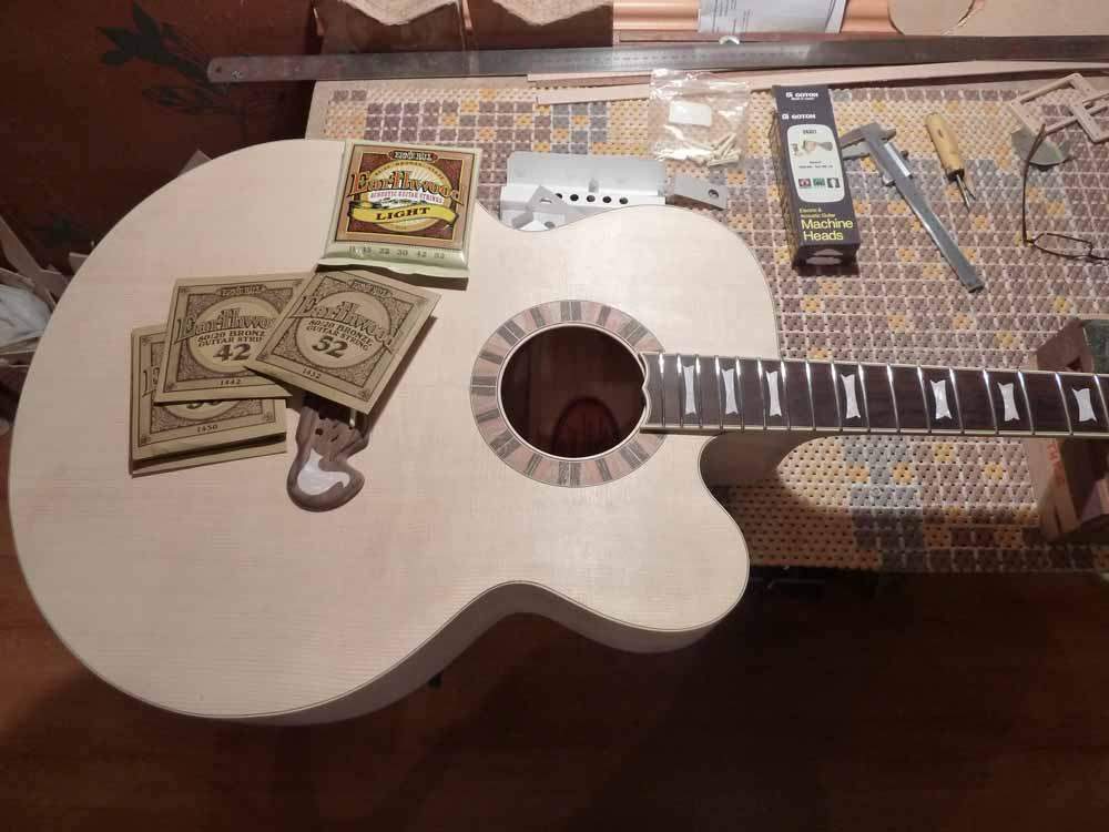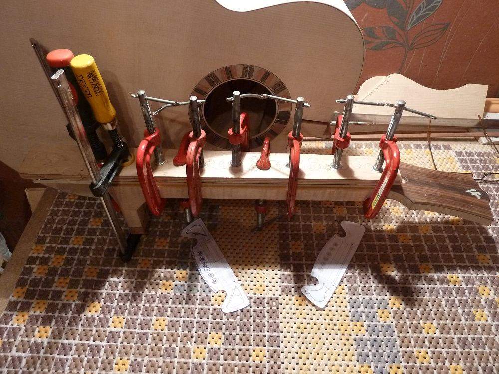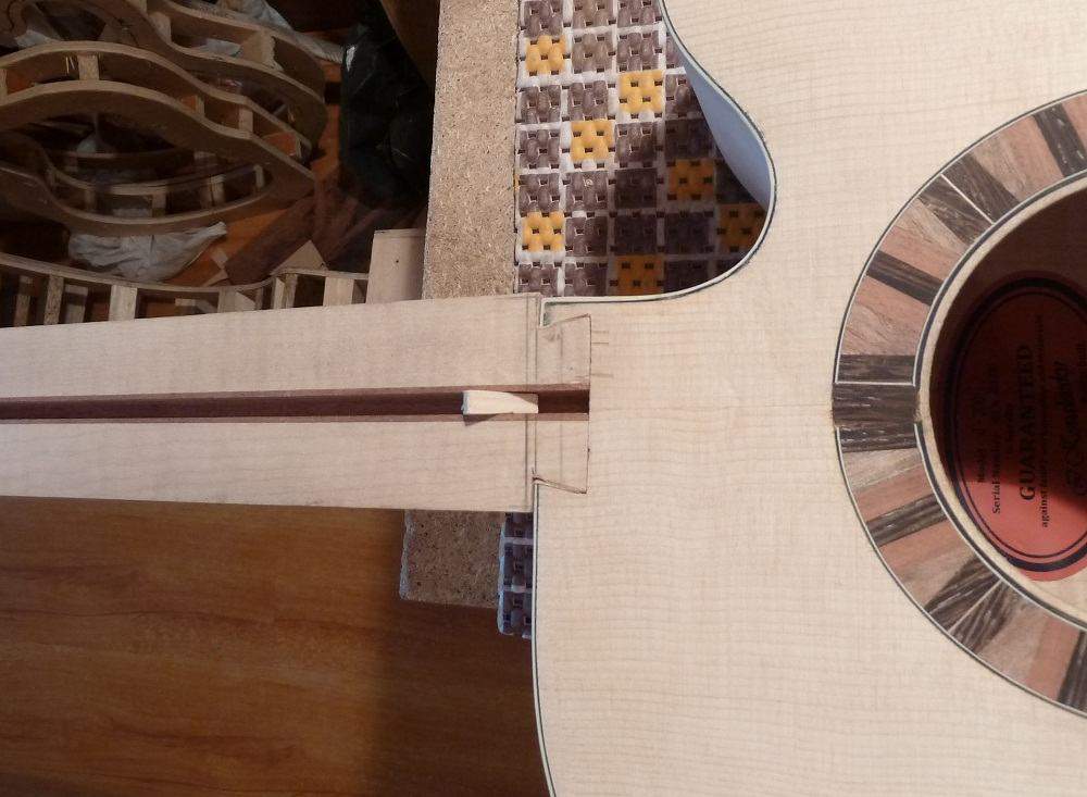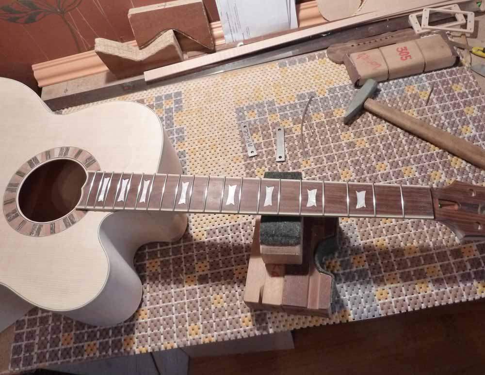 Полуфабрикатом это уже называть язык не повернется. Я внимательно все смотрел и переживал за Вас. Слава Богу, что все проходит достаточно гладко. удачи Вам и в завершающей фазе. А у меня есть вопросы,которые возможно будут интересны многим. Расскажите пожалуйста, как легли струны у инструмента? Какое получилось расстояние на 12-14 ладах, и как Вы к этому пришли. Задавали ли угол вклейки грифа, или клеили гриф в плоскости верхней деки. И последнее, насколько комфортна игра на инструменте. Акустика с вклеенным грифом штука не простая. есть формулы расчета угла вклейки грифа по заданным величинам, есть практические навыки мастера собирающего гитару,что использовали Вы и что получилось? Желаю Вам удачи в завершении прэкта.