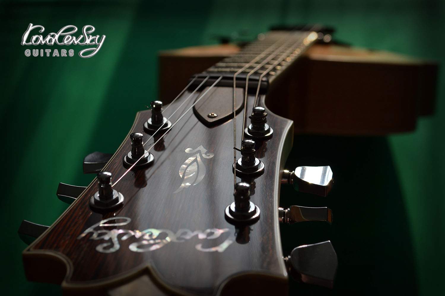 Гриф сделан из трех кусков - волнистый клен и махагони. Гитара будет укомплектована хамбакерами.