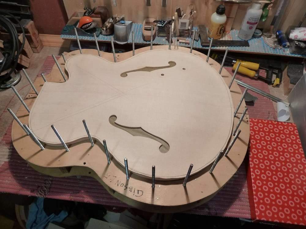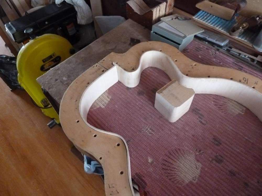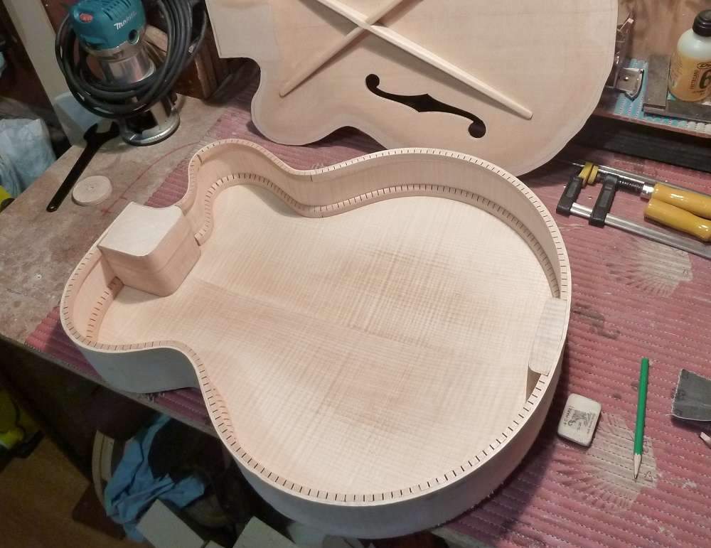 если говорить о гитарах на стальных струнах, то да угол есть. Сказать точно не смогу какой. Объясню от чего он получается. Когда строятся пружины для верхней деки, то та сторона пружины , которая клеится к деке имеет радиус, в связи с чем образуется купол. И разность высот около переднего клеца и места подставки, относительно плоскости обечаек получается разная. Касательная и определит угол деки к обечайке. И соответственно накладки и основания грифа.