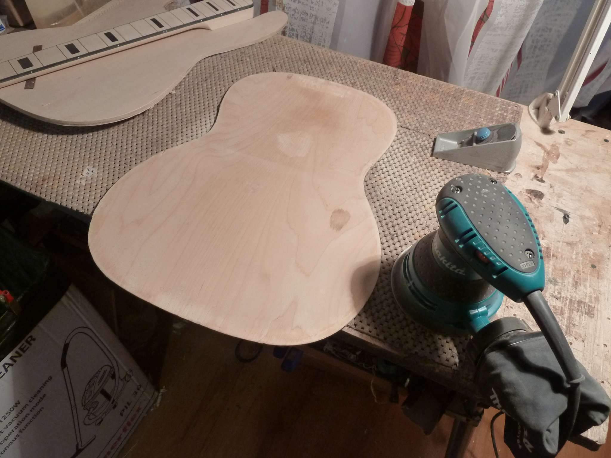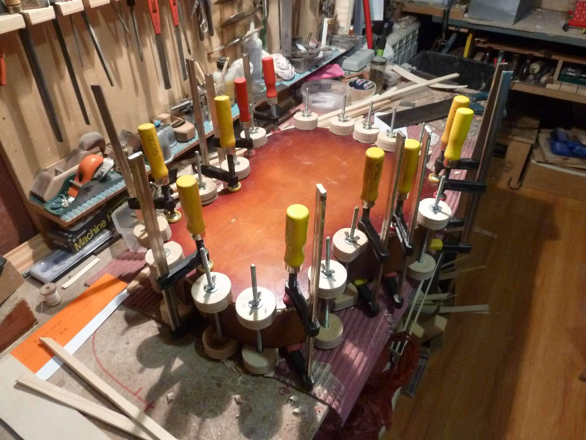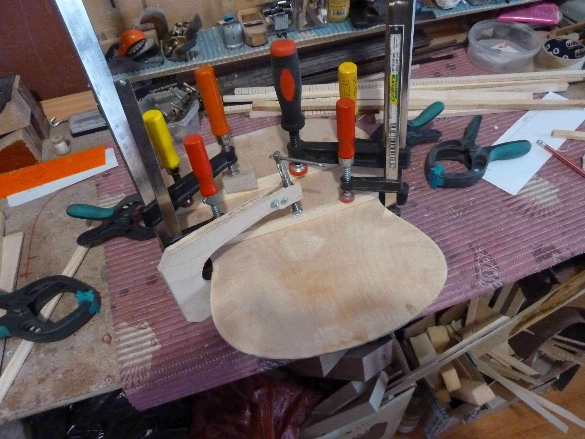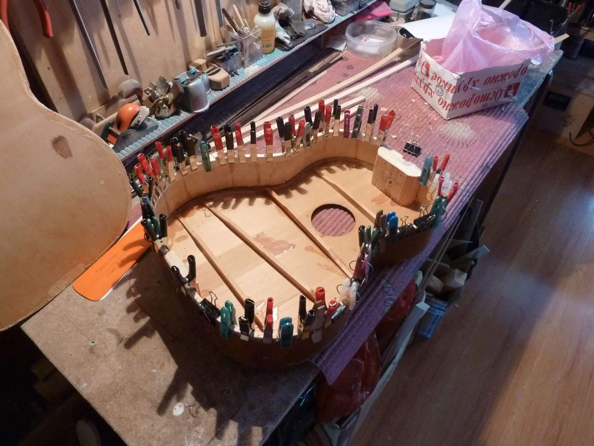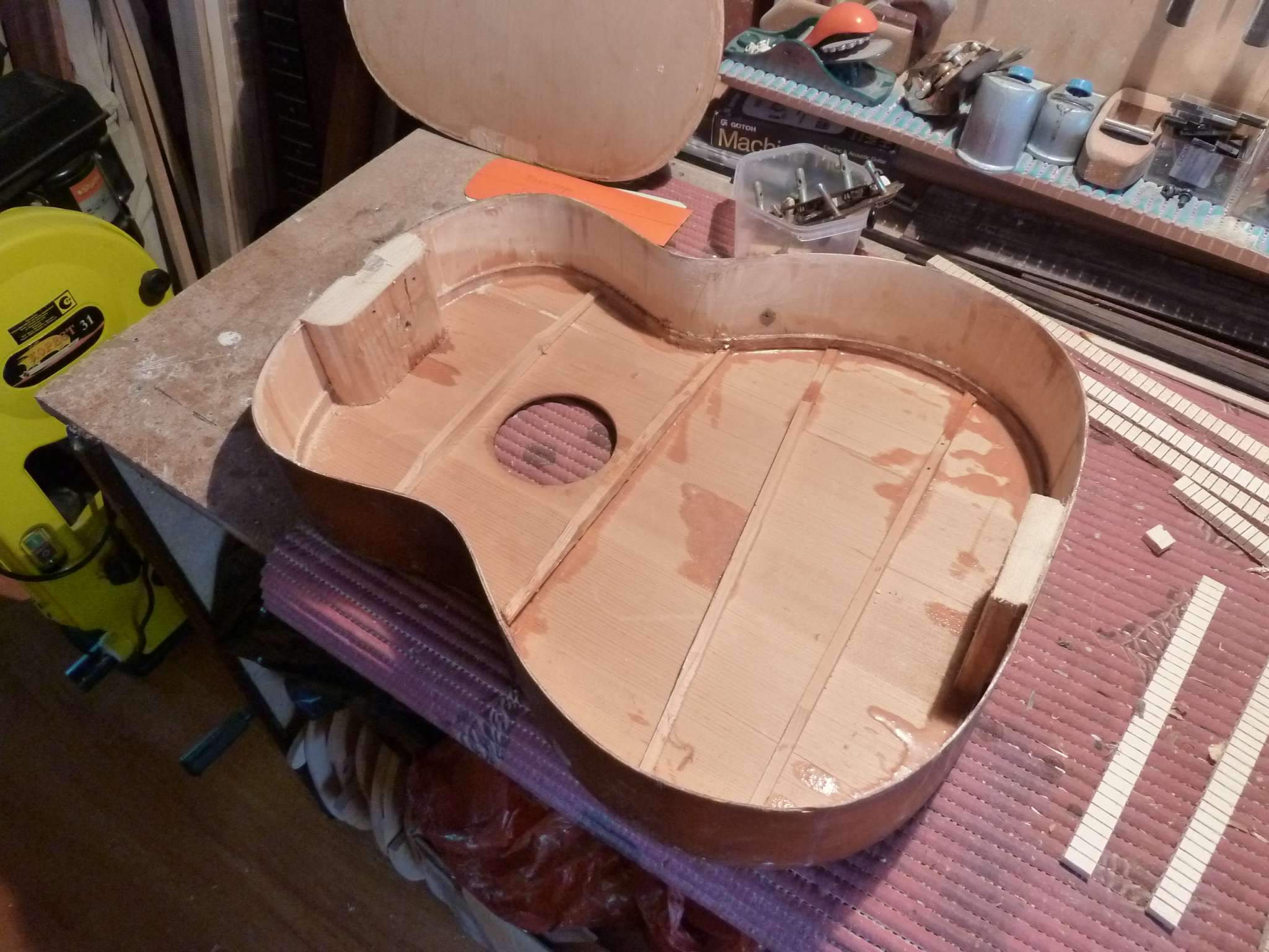 Что бы не делать вайму, не стал полностью разбирать гитару по составляющим, так лучше держит форму. На нижнюю деку, очень уж она хлипкая, добавил пару рип. Приклеил ее к контробечайкам, потом снял верхнюю деку.
