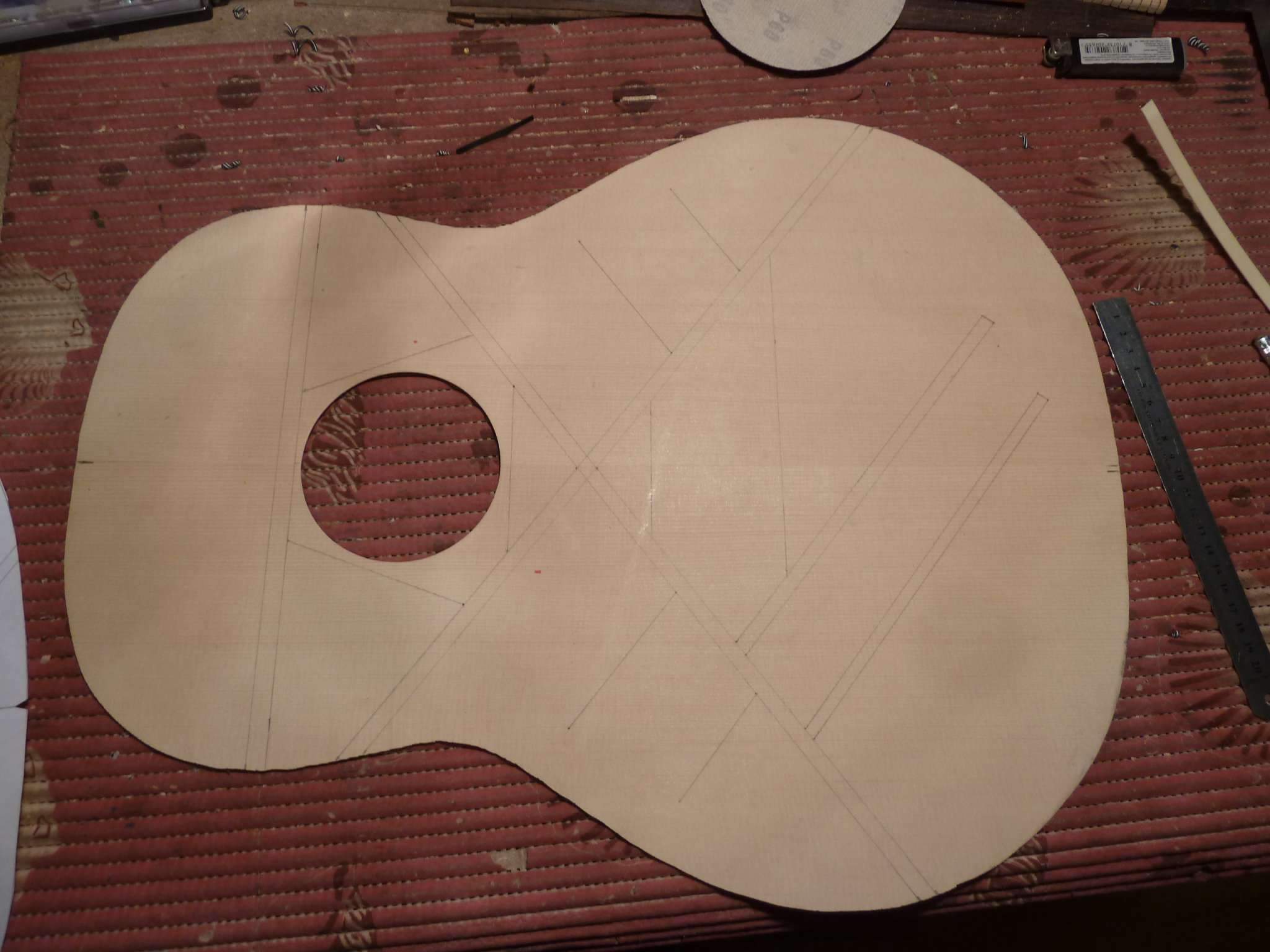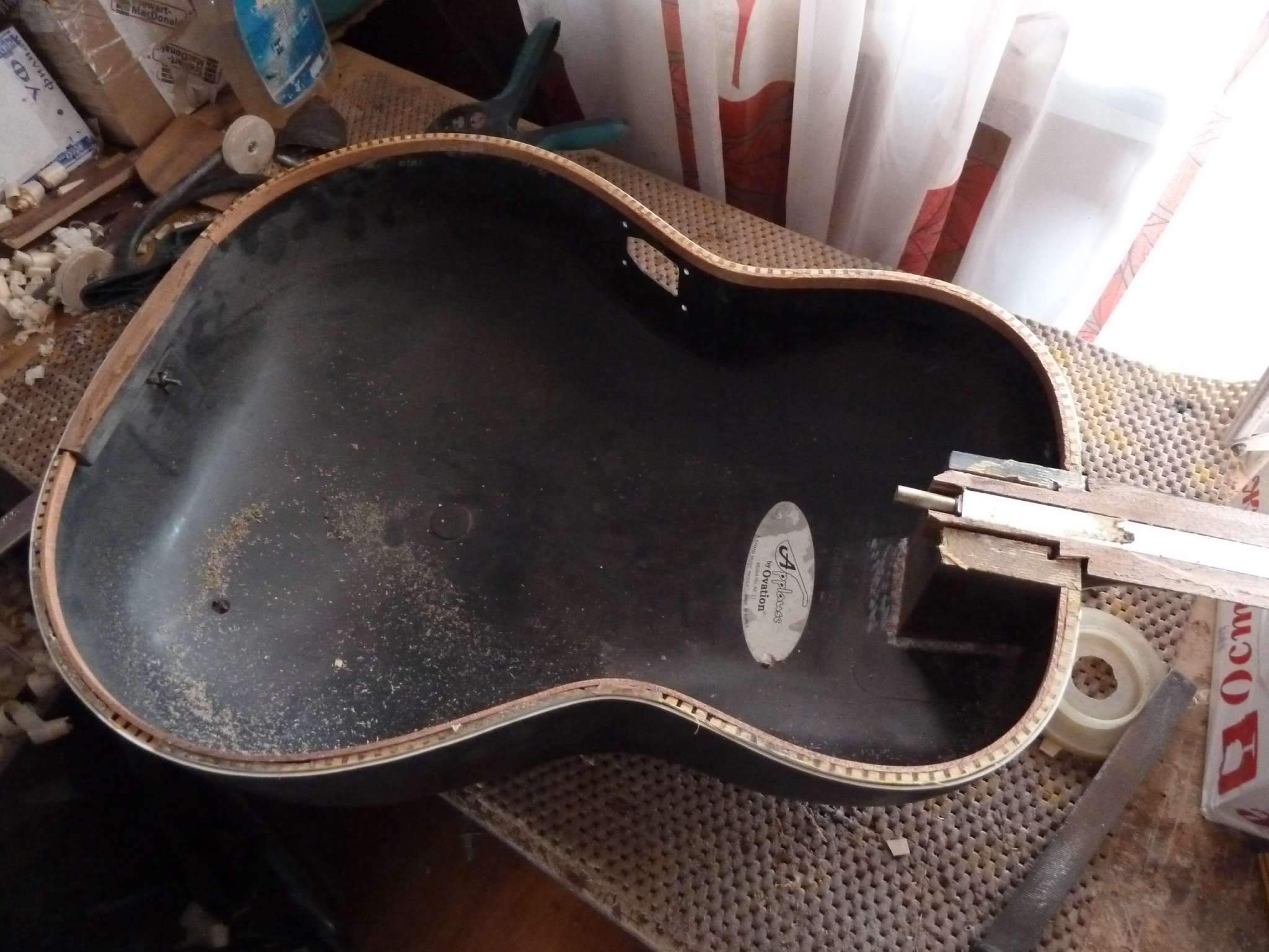 ... и добавил:один из ремонтов - замена деки на корейской гитаре Аплаус (типа Овейшен). Сначала фото, в каком виде она ко мне попала.