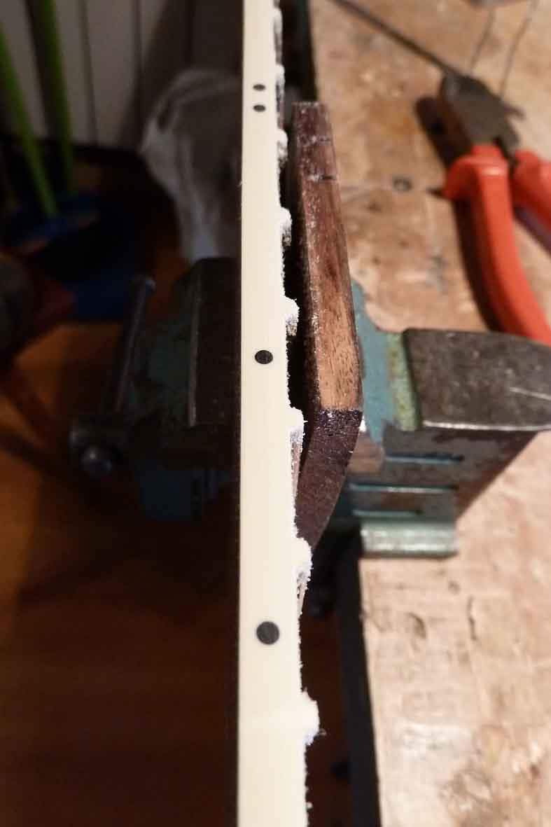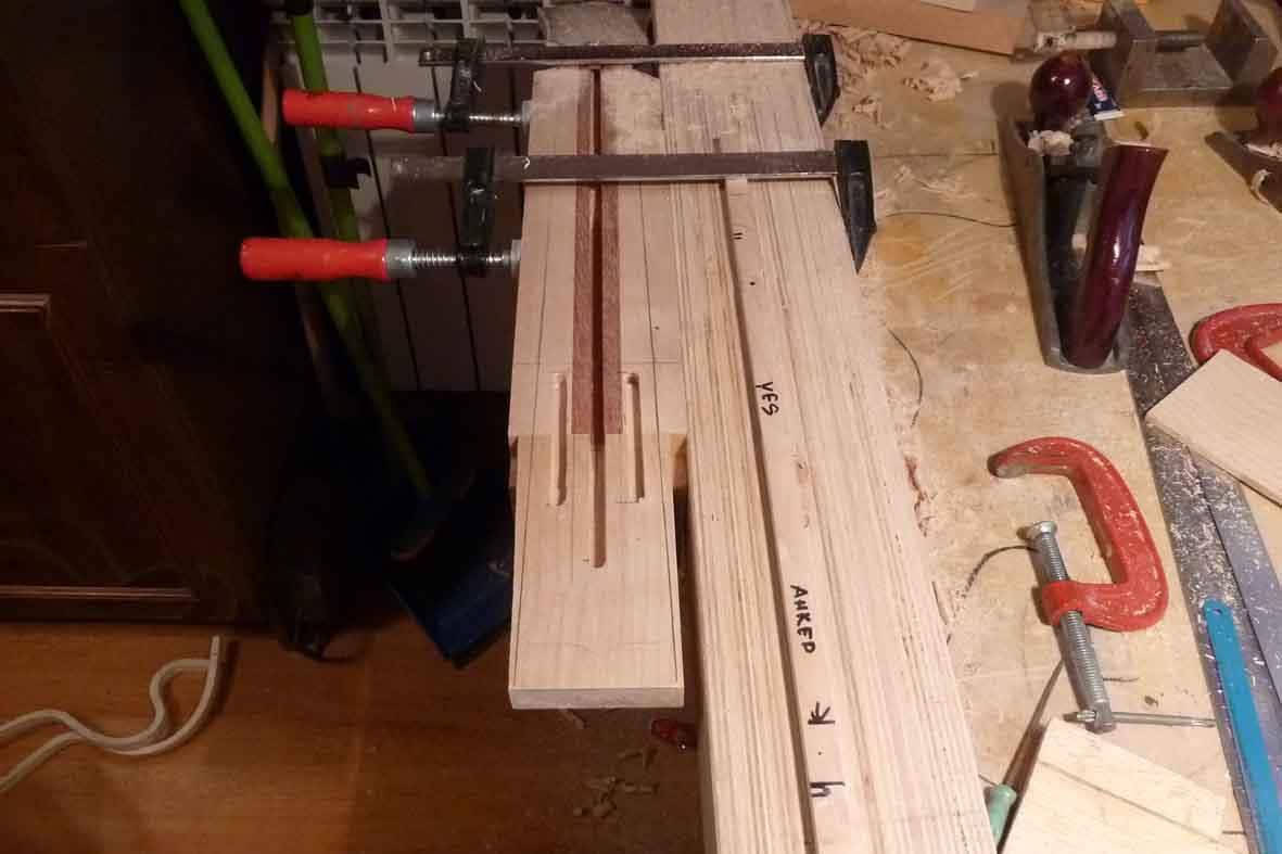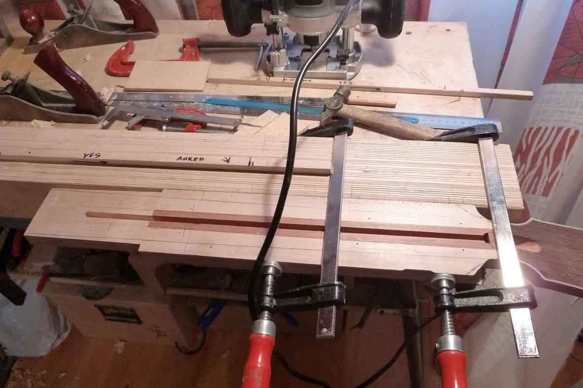 Посадка грифа готова, добавка вклеена. Фрезерую в ней паз под анкер и усилители.