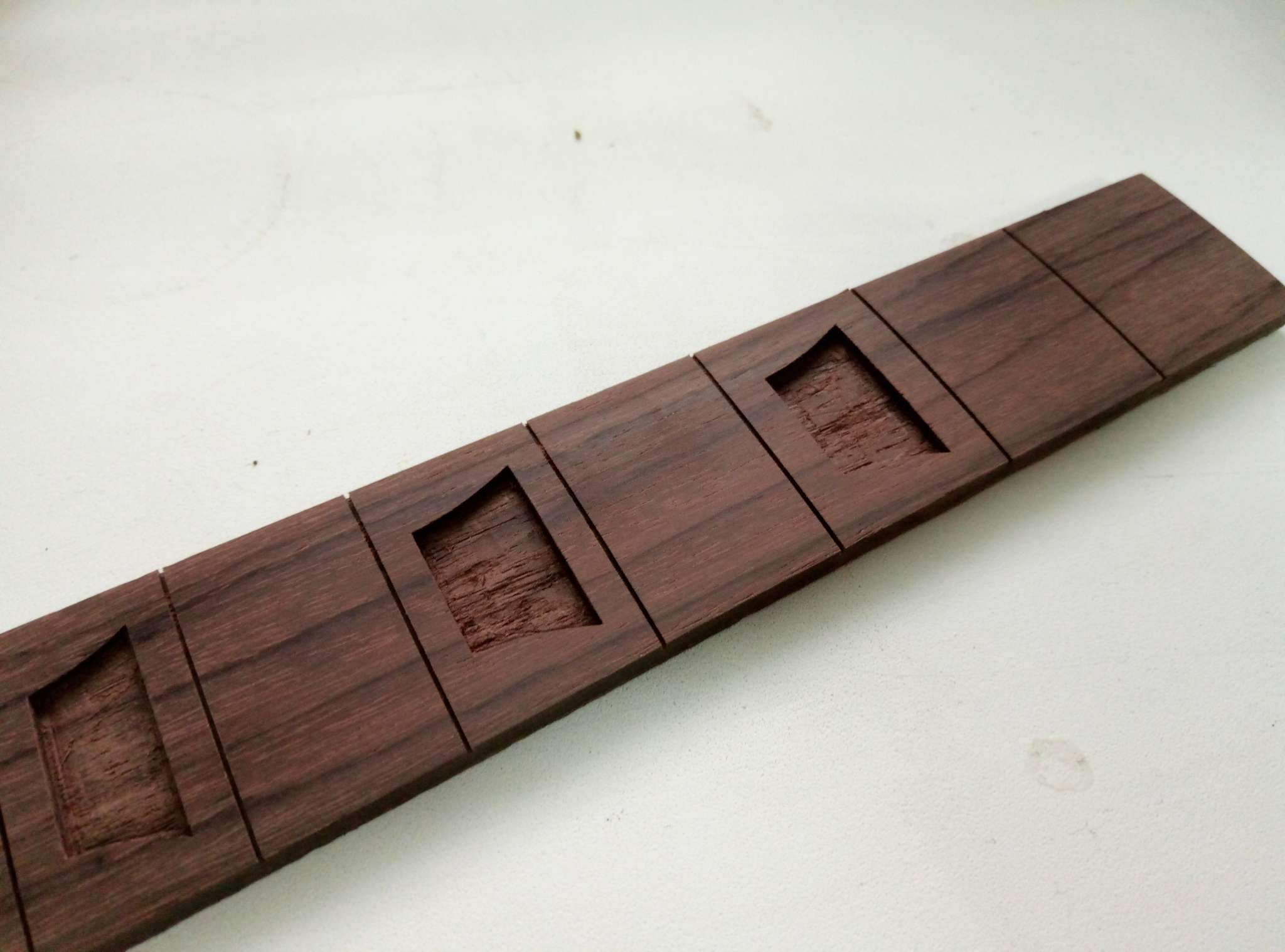 Azatto, нагрев лазером очень локальный - любая резка и гравировка идёт под обдувом, тем более мощности на режиме сканирующей гравировки не так много. При резке оргстекло может пойти трещинами, с деревом - не замечал ни разу. Самый главный минус - неравномерность глубины гравировки на неоднородном материале, и сама глубина порядка 1 мм максимум. Я резал пропилы под лады, но накладка была двухслойная и в одном слое я прорезал канавки насквозь, чтобы потом наклеить на второй. Т.е. если тебе нужно заполнять трапеции, например, эпоксидкой с наполнителем, то вполне себе способ, если вклеивать из толстого "перлойда" - фрезер предпочтительнее.
