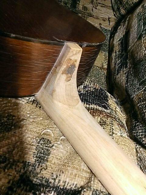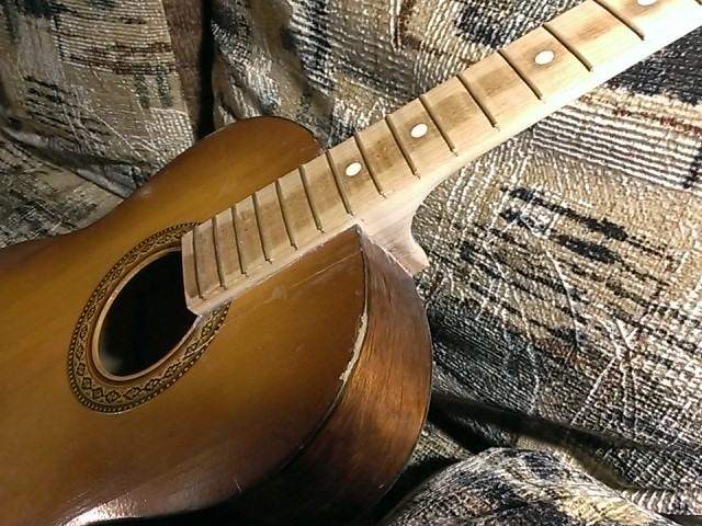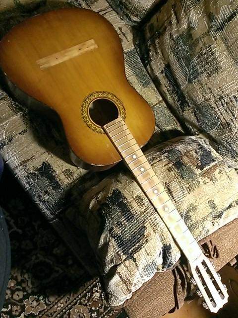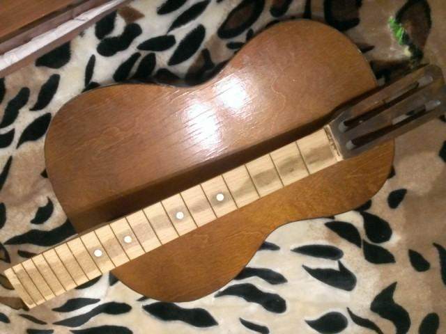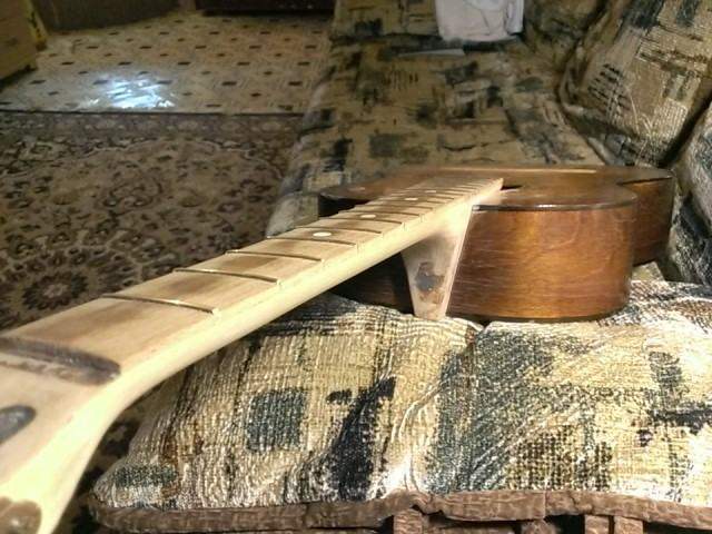 Мимо пройти не смог, забрал домой. Фотки в "первозданном виде" к сожалению не делал, фото уже склеенной деки... В общем восстанавливаю. Гриф решил вклеить как на нормальных аккустиках, да и обработал его порядочно, убрал ширину и толщину, профиль сделал типа стратовского "С", при этом лады были аккуратно сняты, благо вылезали сами, накладка отшлифована с радиусом (ХЗ каким, на глазок, была плоская), после лады посадил на суперклей, закатал и шлифанул. Самыми подношеными были 1,2 и 3 лад, гитара видимо по грифу не игралась, чисто на тирёх блатных!... пока так...