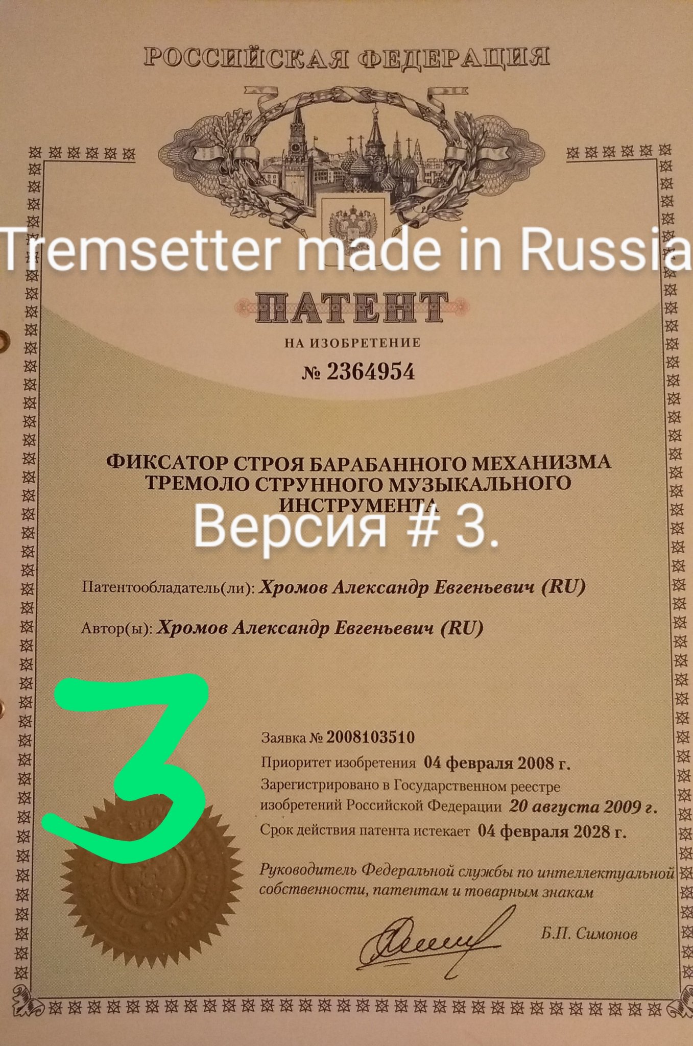 В патенте четвертая версия моего tremsetter made in Russia называется " Фиксатор строя механизма тремоло струнного музыкального инструмента".