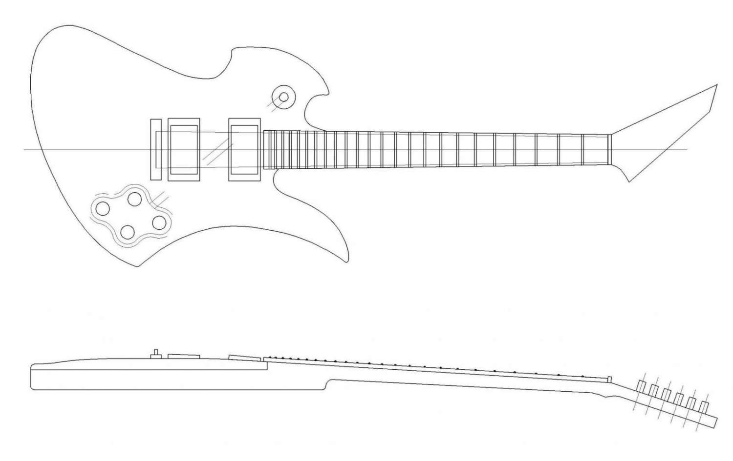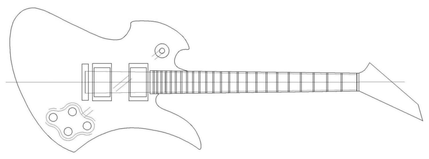Ну вот собственно первый проект - гитара по мотивом B.C.Rich Mockingbird. Сквозной гриф, красное дерево, топ из клена, бридж ТОМ. Каждый проект начинается с чертежа, особенно когда руки не набиты и вопросов больше чем ответов:
