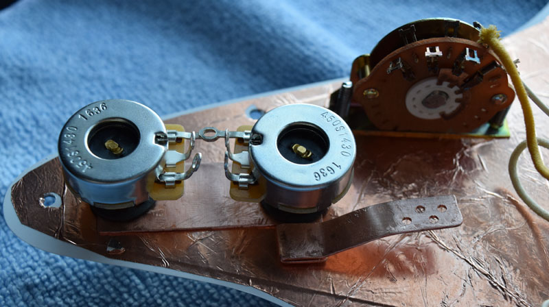 От пластины идёт небольшой отвод, что бы не греть пот и уменьшить его вероятность выхода из строя или изменение характеристик (а то ещё собираюсь много экспериментировать с разными звучками на этой гитаре), к которому и будут собираться земли от звукоснимателей и кондёра тона.