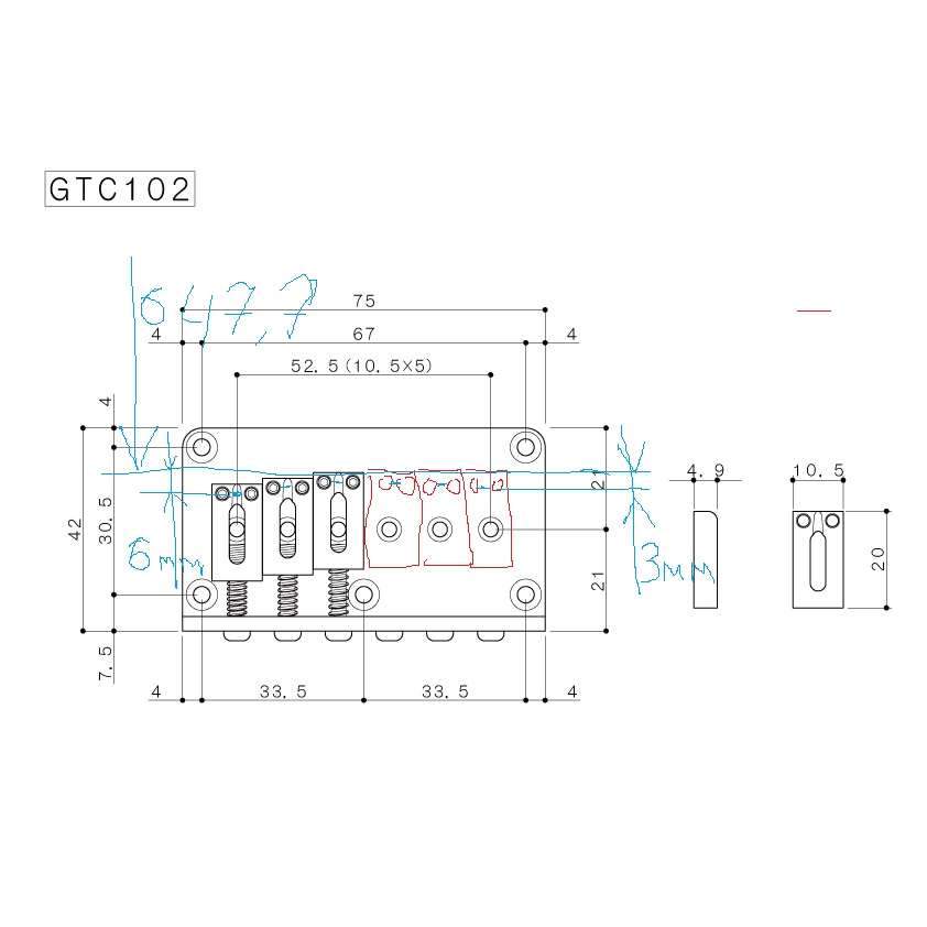 то есть ты должен нарисовать свой бридж так, чтобы у тебя хватило вылета сёдел, длины седельных винтов, и чтобы седло 6 струны не перерезало собой саму струну( так иногда случается на китайцах) я тут для простоты тебе нарисовал высокотехнологичную картинку. там голубая линия это расчётный нуль, и на сёдлах голубые царапинки - это место касания струны об седло - высшая точка. во от этой точки надо мерить расстояние до расчётного нуля