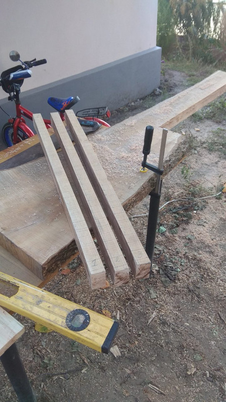 Подготовил из новой кленовой доски заготовки и выполнил переклей. Голова предполагается цельная, с небольшим доклеем (толщина после строгания получилась 45 мм, что не позволяет сделать желаемый угол скоса).