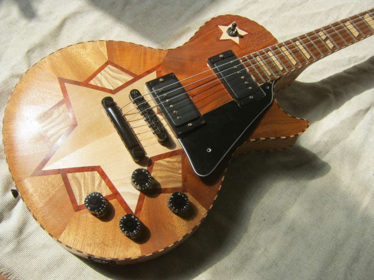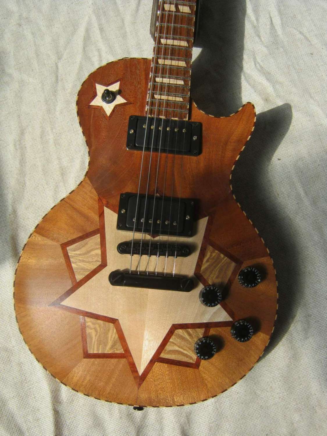 Это эксперимент. Всегда гитара - оин или нескодько кусков дерева, направленных волокнами вдоль главной оси. Я решил попробовать иначе. А ещё это первая в мире гитара с угловым пером грифа, колки - 3 на 3.