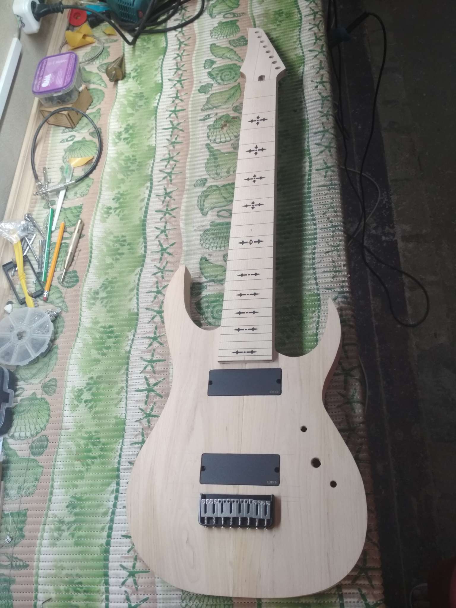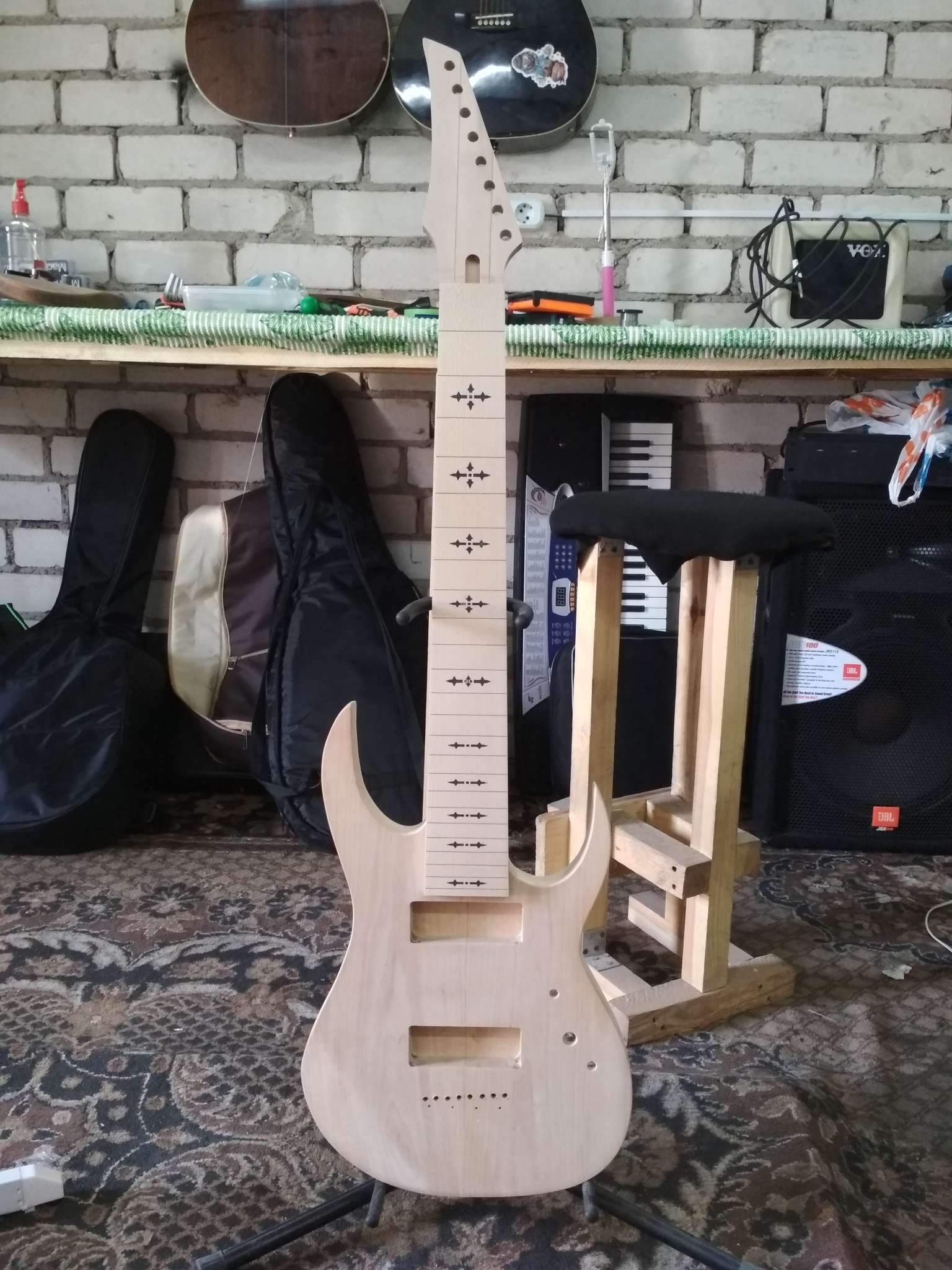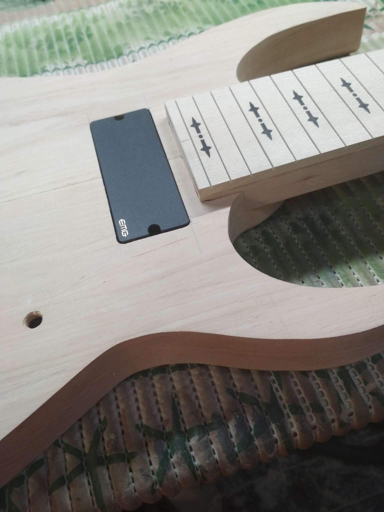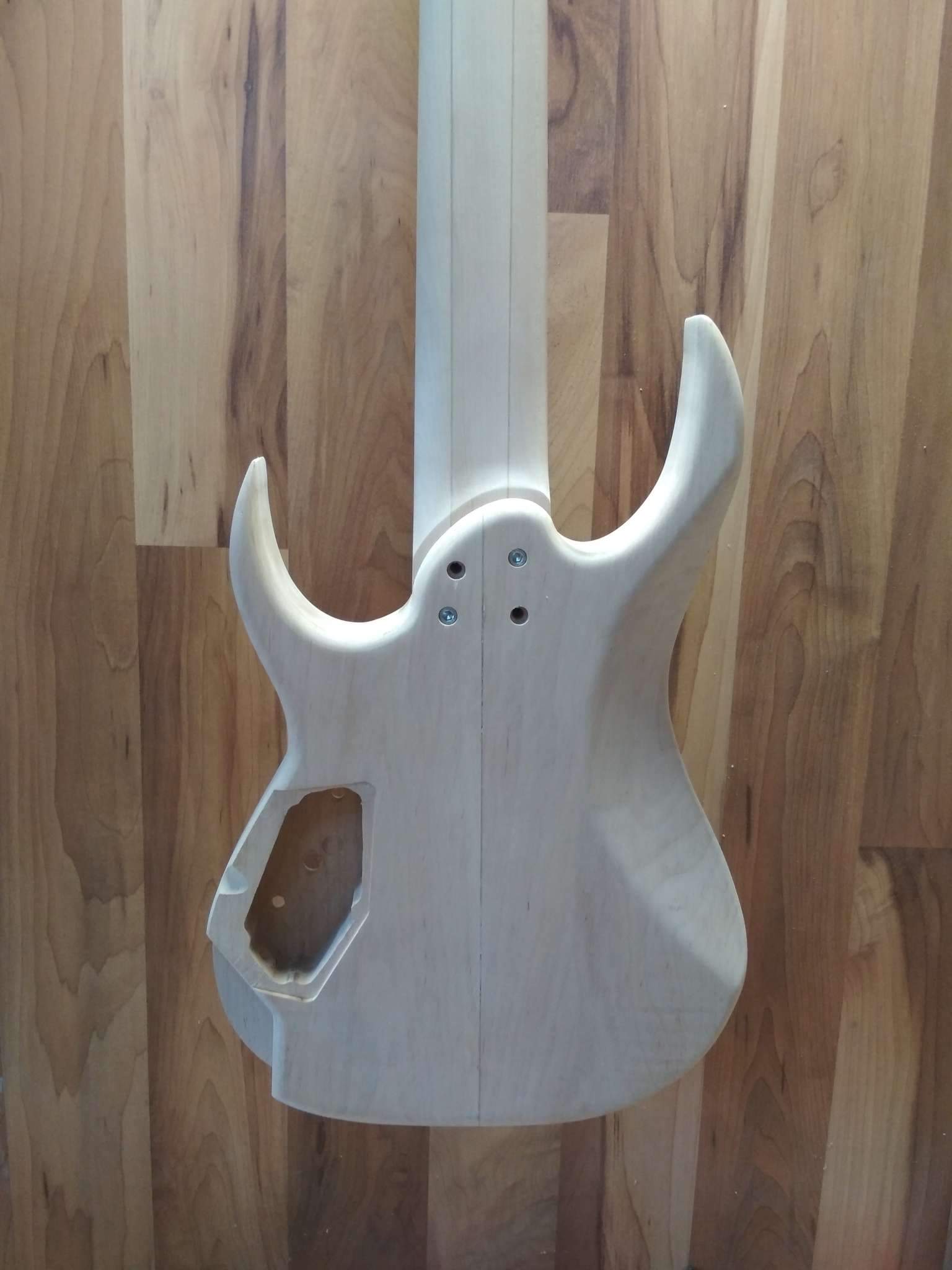 Потихоньку двигается новый телеподобный гитар. Сначала на топе был волнистый эвкалипт, но потом заказчик захотел корень ясеня. Мензура будет 25", корпус из корины, толщина 37 мм. Гриф-клен/сапеле/клен.