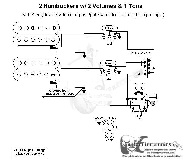 Вот что-то похожее http://www.guitarelectronics.com/product/WD2HH3L21_01/Guitar-Wiring-Diagram-2-Humbuckers3-Way-Lever-Switch2-Volumes1-ToneCoil-Tap.htmlНо непонятно, что за свитч, и если от датчиков идёт только 2 провода(как на рисунке), то push/pull остаётся не у дел.