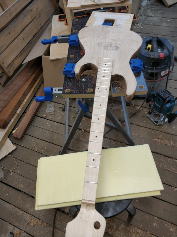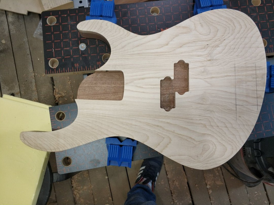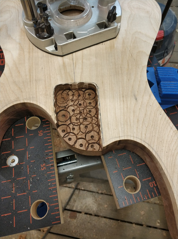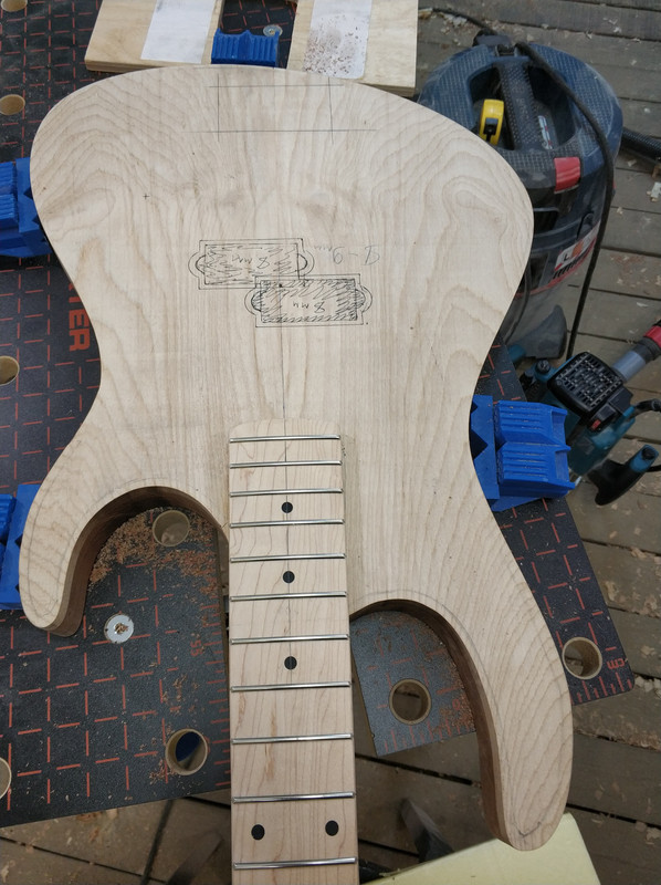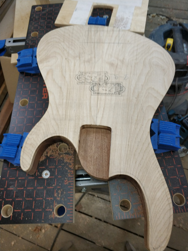 Ну в общем сегодня день не прошел зря. Решено было профрезеровать карман грифа и полость под звукосниматели.