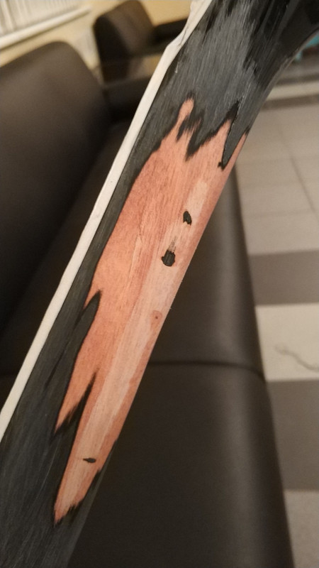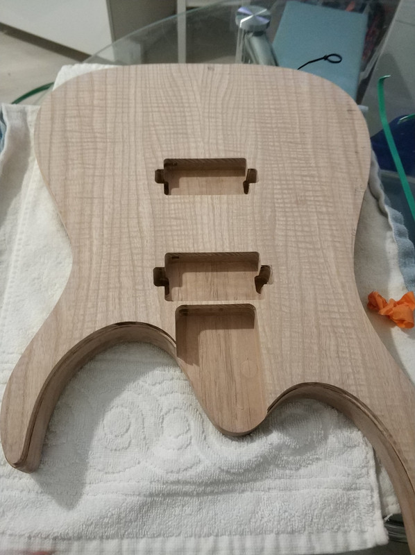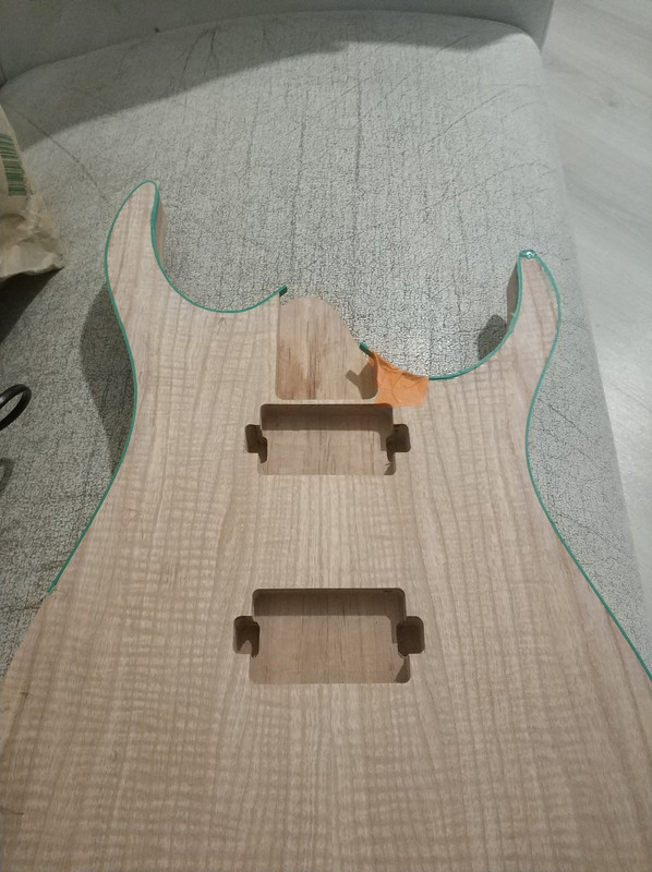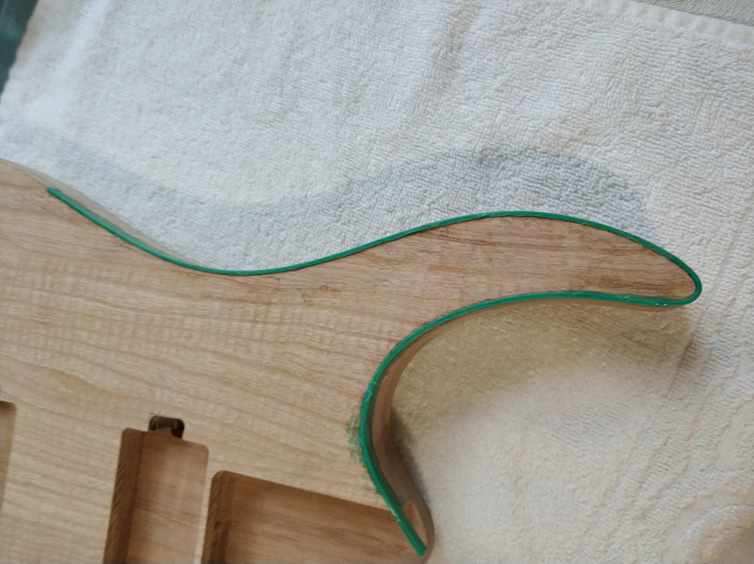 Скотчем кант маскируют когда наносят краску или морилку. Перед лакировкой его снимают. Однослойный кант достаточно заклеить с боковой стороны, а с лицевой краску убрать циклей. Так делают на фабрике Гибсон, например.