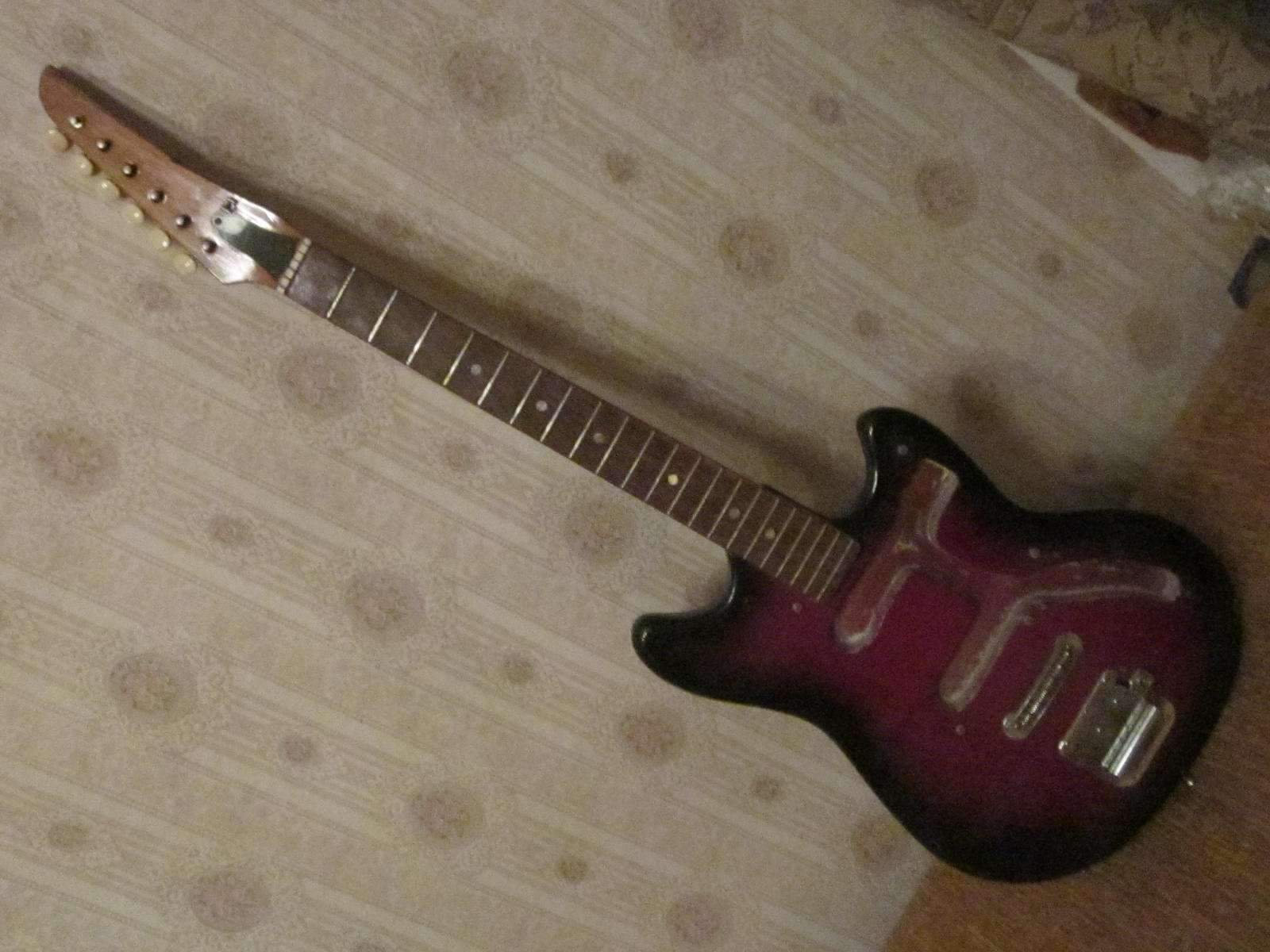 Попалась вот такая гитарка, сзади написано что " япошка ". Года, видимо 60 - 70 тые. Гриф в нормальном состоянии, с анкером. Мензура 626 мм. Расстояние между струнами на бридже 10 мм. Начал её уже восстанавливать. Не хватает звучков, переключателя и пластика. Может кто знает что это может быть за фирма, модель гитары ? Помнится было такое название Тeisco...