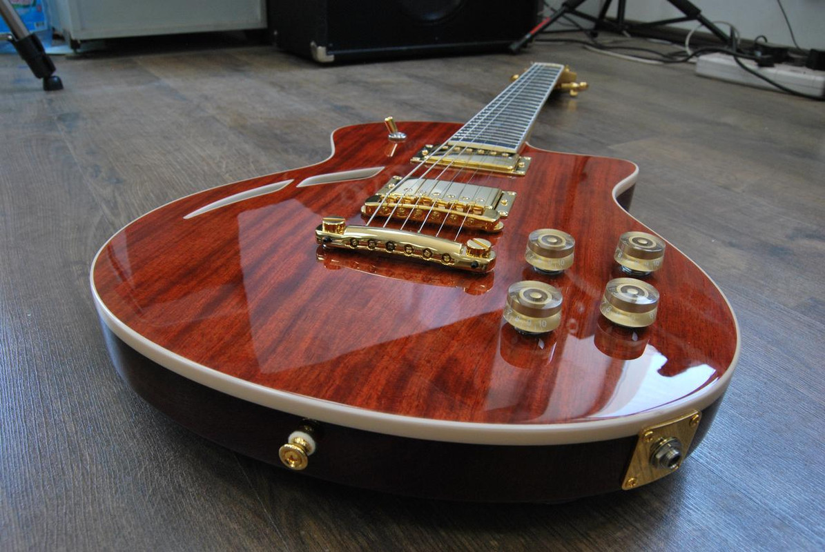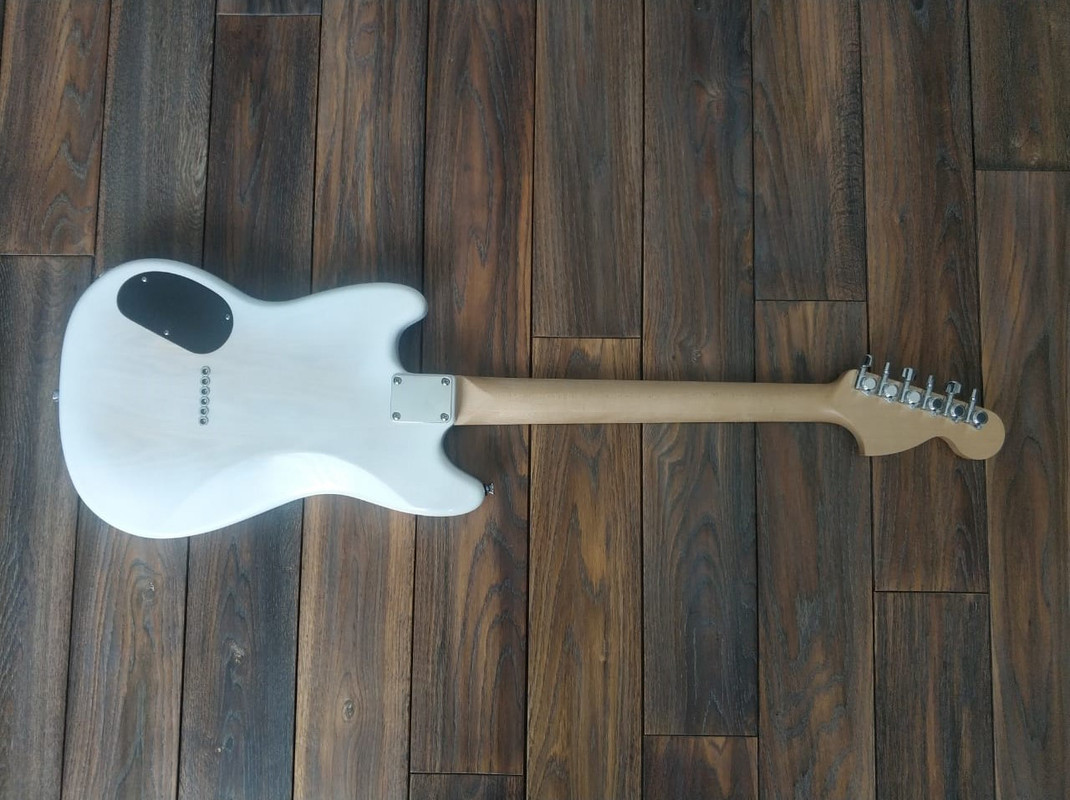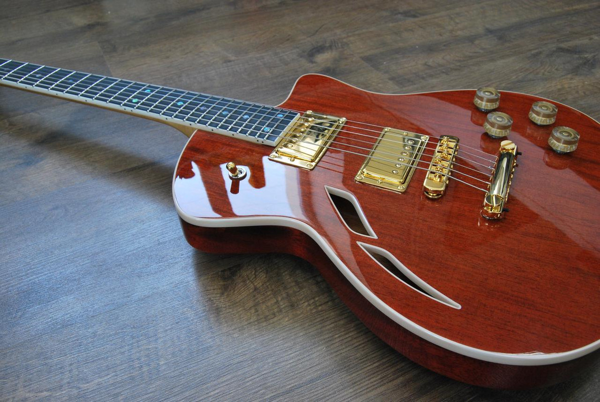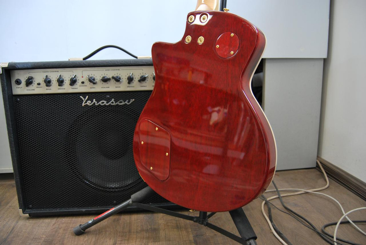 Корпус - Ясень. Покрытие - патина золото + cанберст. Лак - полиэфир от Renner.